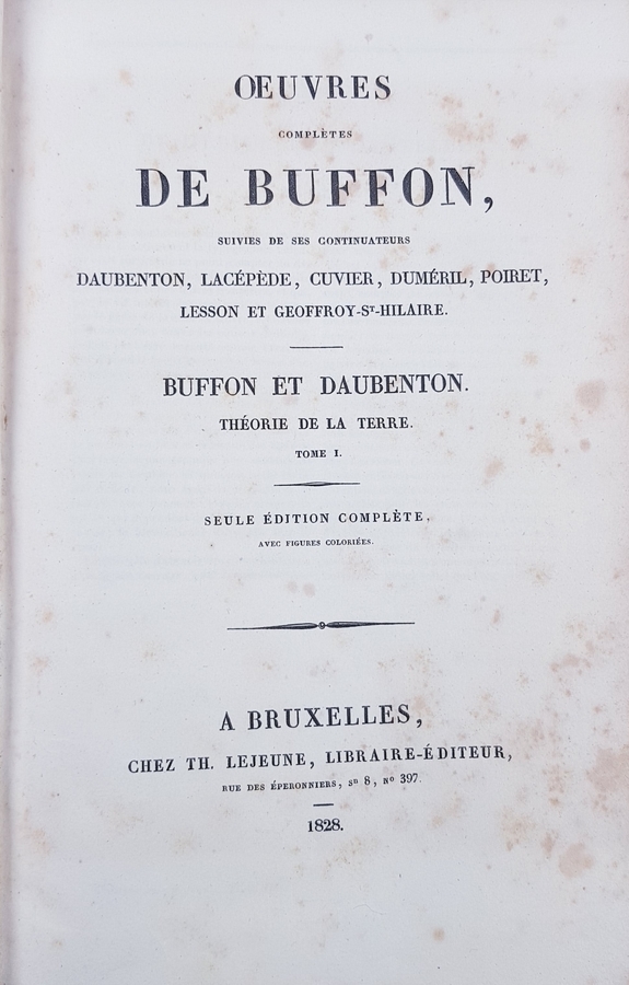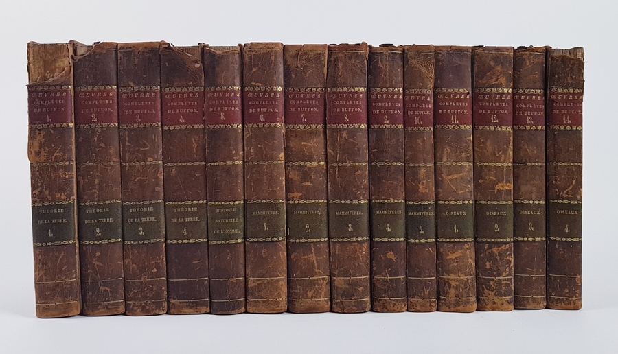 Oeuvres Completes de Buffon, suivies de ses continuateurs Daubenton, Lacepede (...) et Geoffroy-St.-Hilaire. Bruxelles: Th. Lejeune, 1828/1830. 14 delen. (Deel 15-20 (= de delen met platen), manco!). Uniform gebonden in halfleer. |