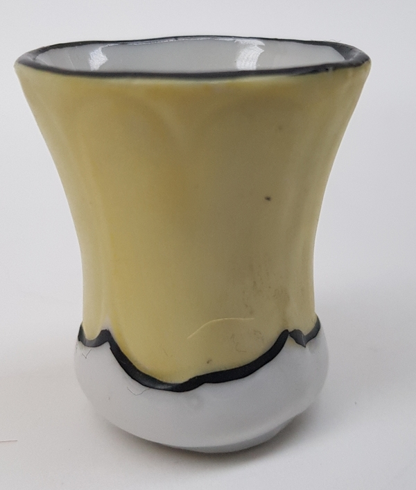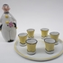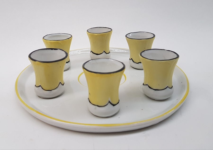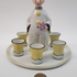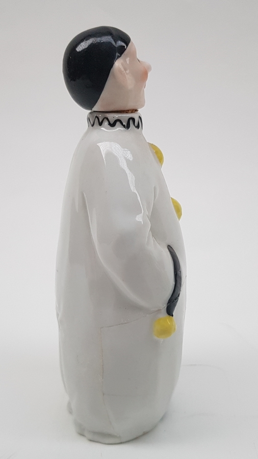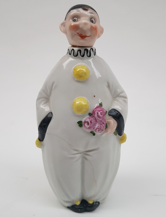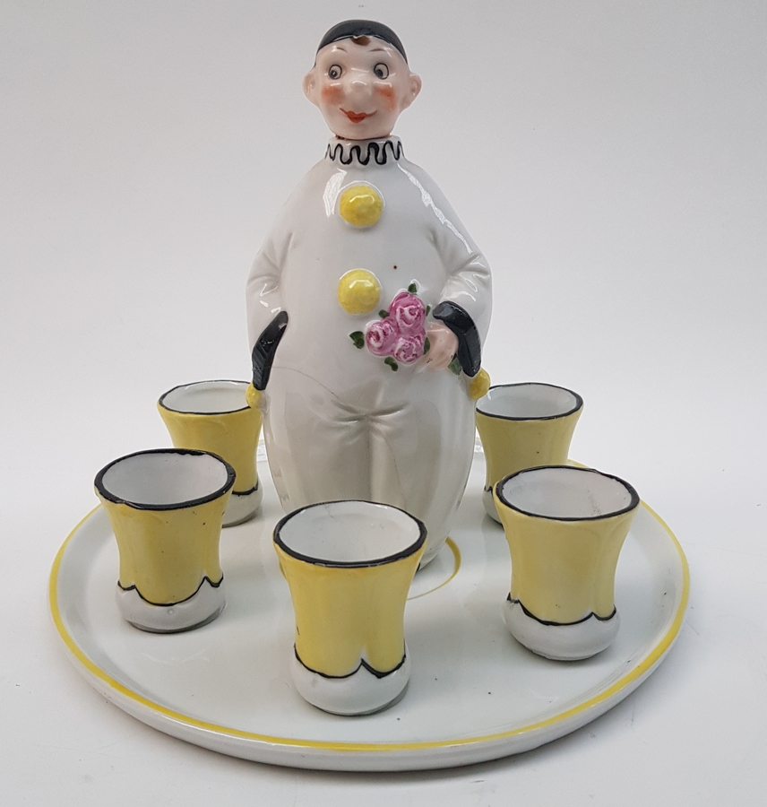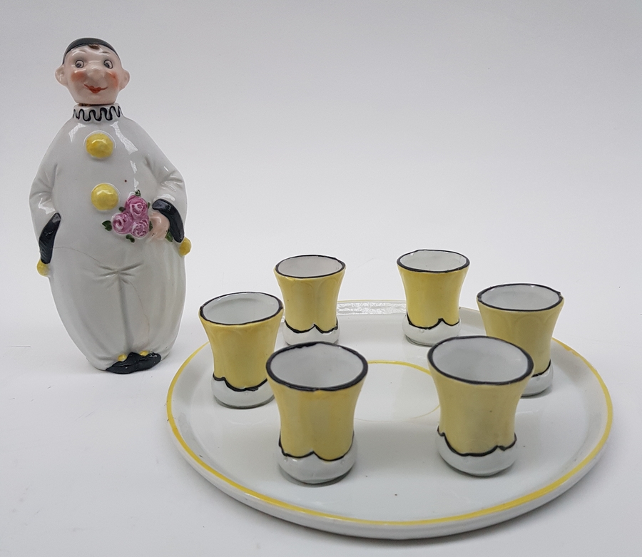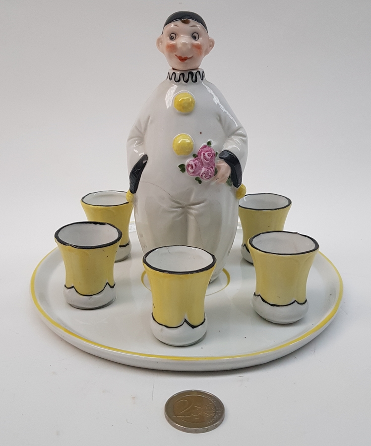 Porseleinen likeur set, fles in de vorm van een pierrot Duitsland eerste helft 20e eeuw. |