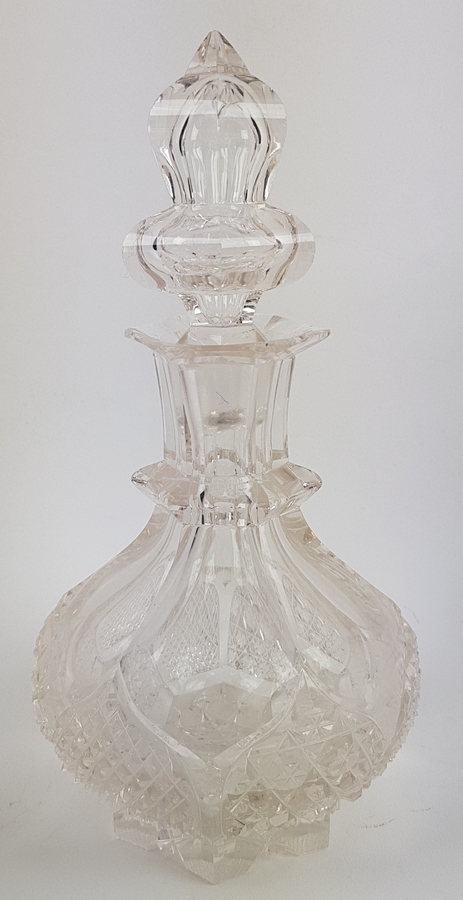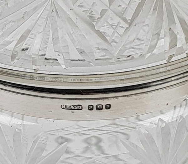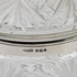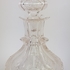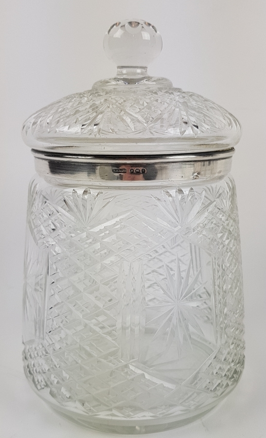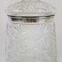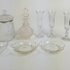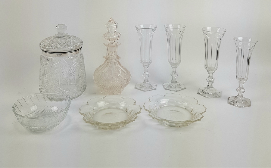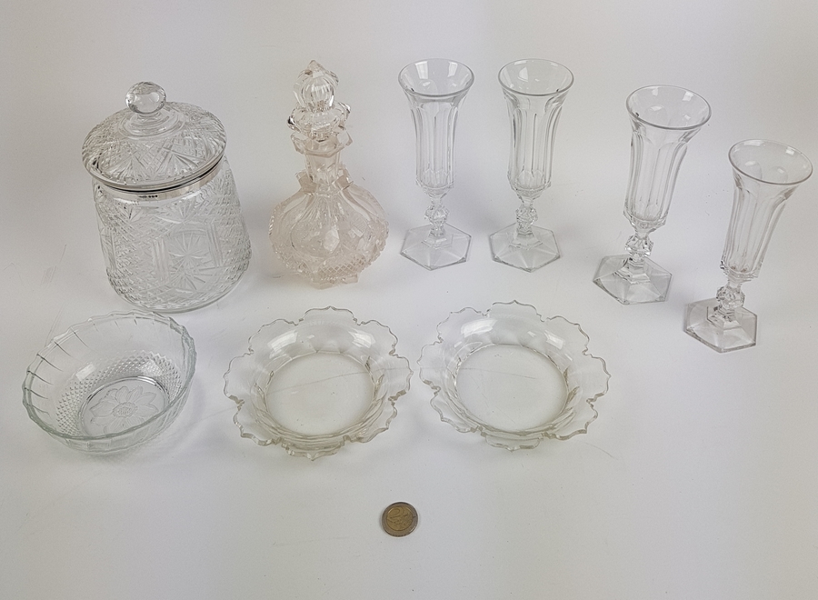 Vier glazen, karaf, drie schalen en een dekselpot met zilveren rand. |