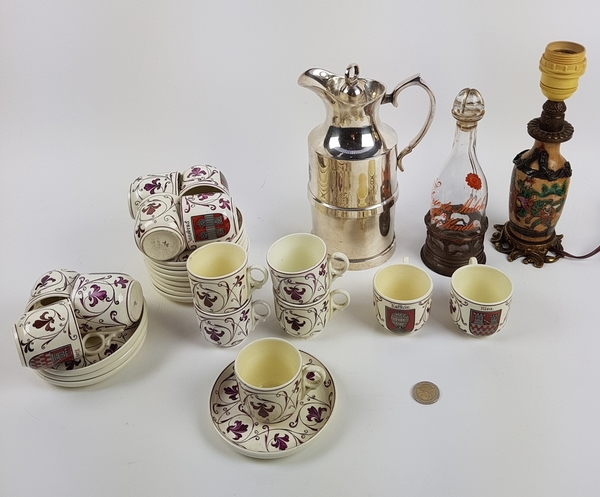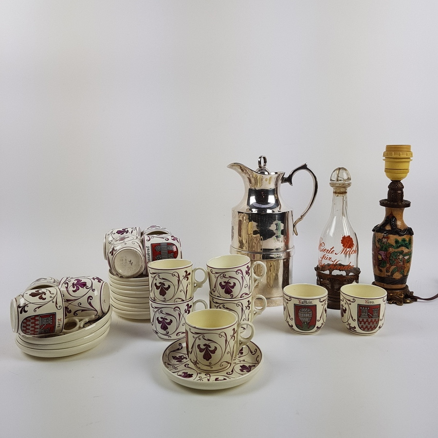 Divers lot waaronder servies van Schwartz Austria begin 20e eeuw, veertien kopjes en tien schotels. Een lampenvoet, kinderflrs en een koffiekan. |