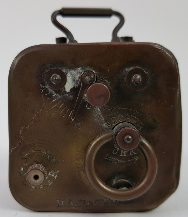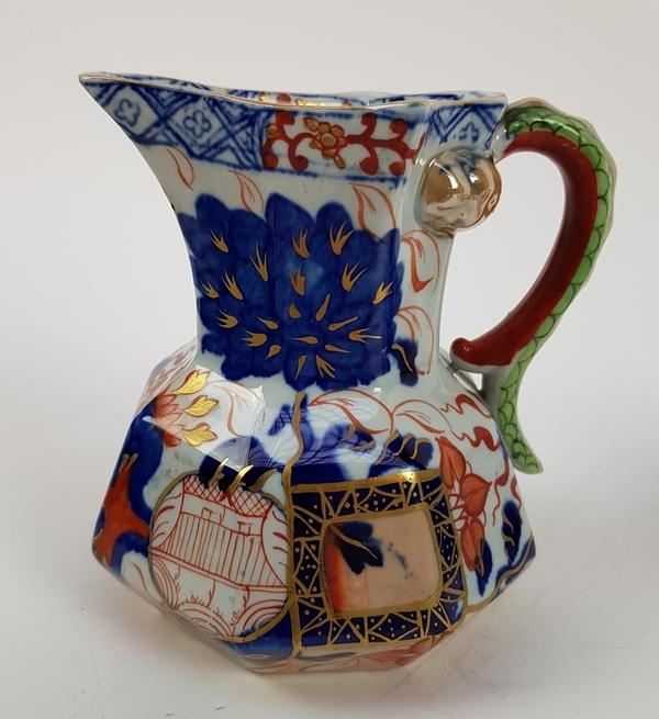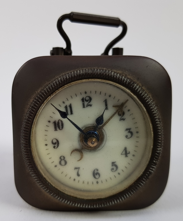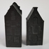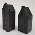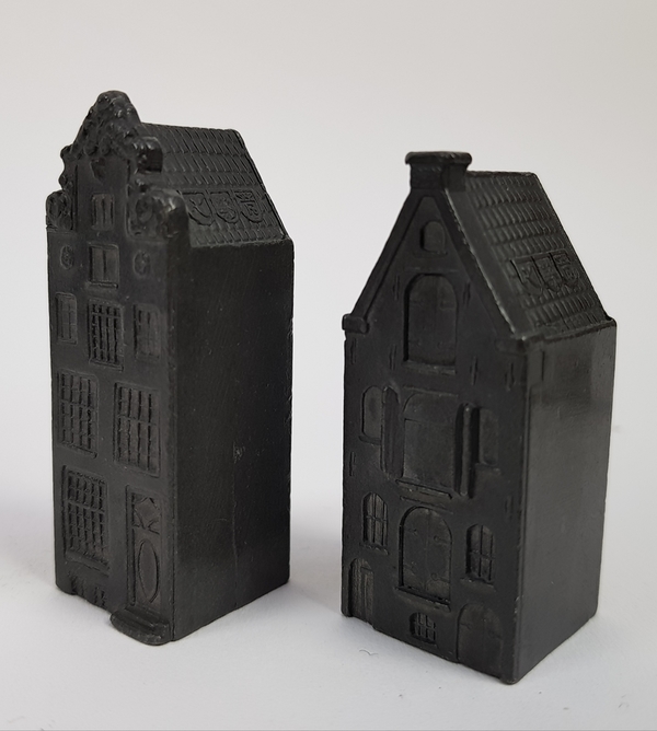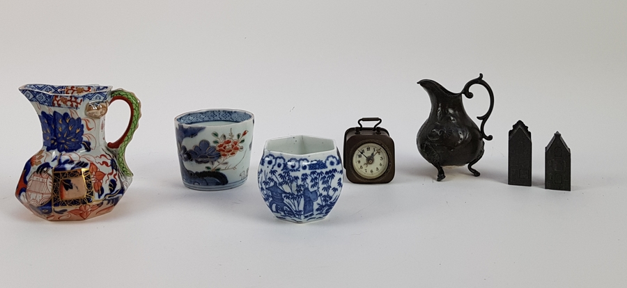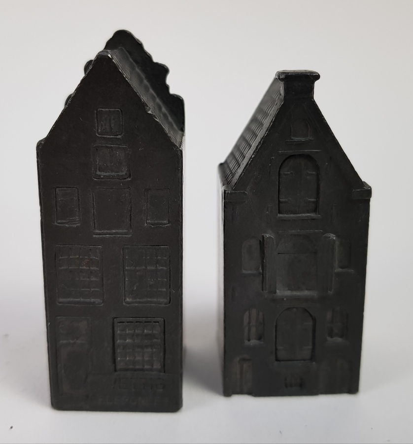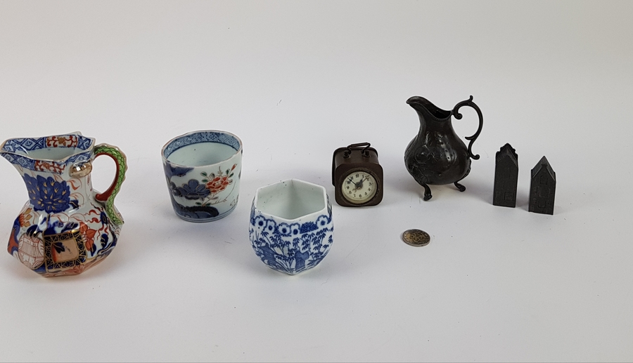 Twee karaffen, twee kommen, wekker en twee miniatuur huisjes tin. |
