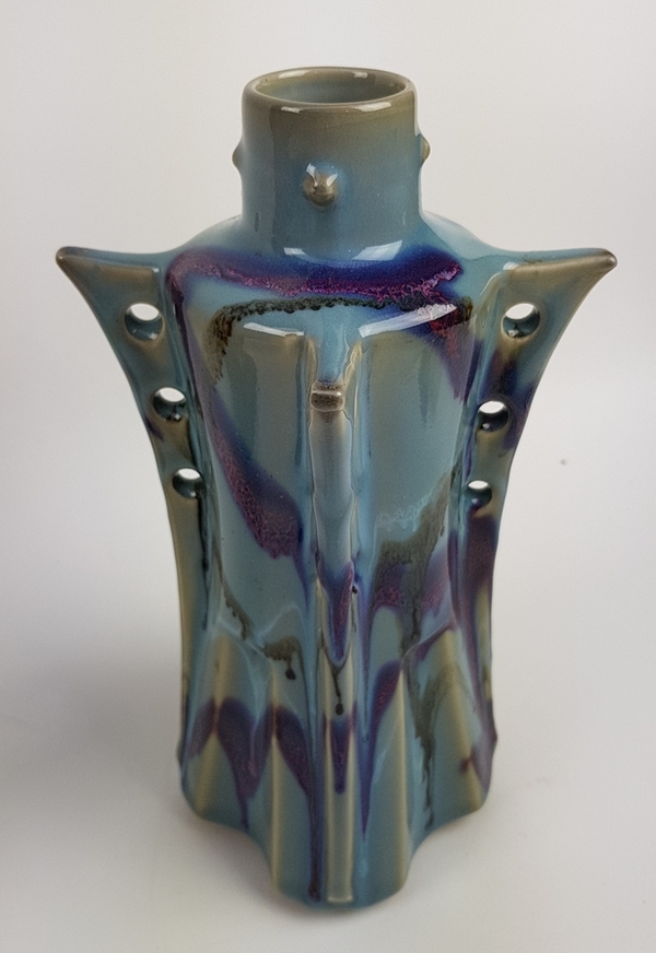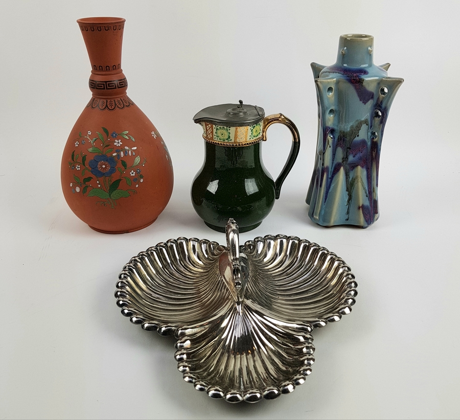 Divers lot curiosa waaronder twee vazen, karaf en presenteerschaal. |