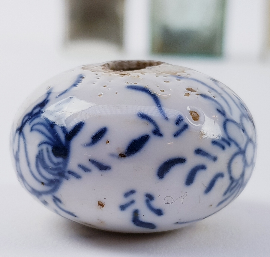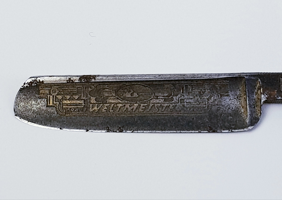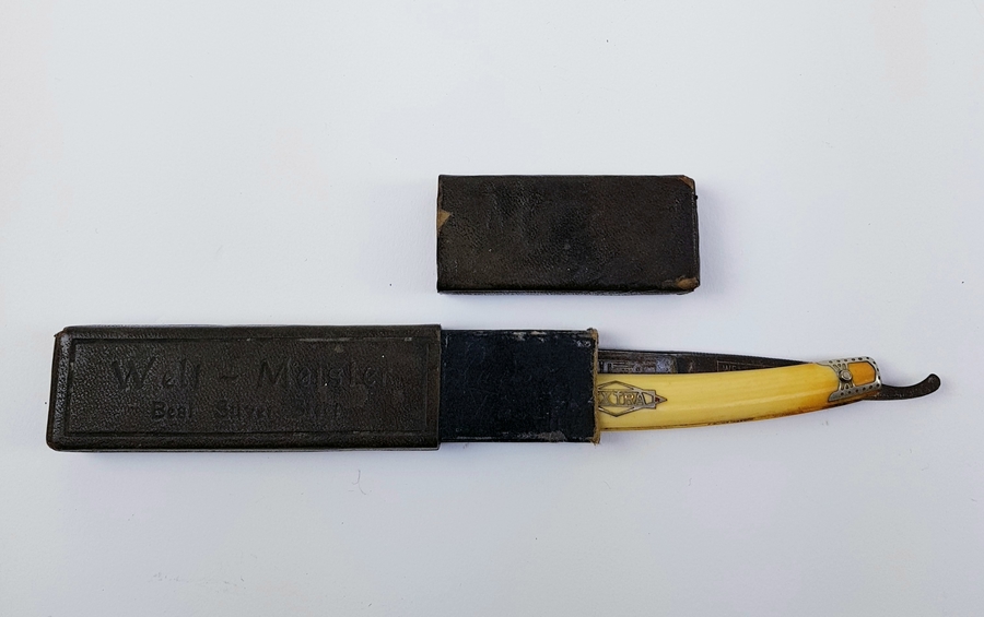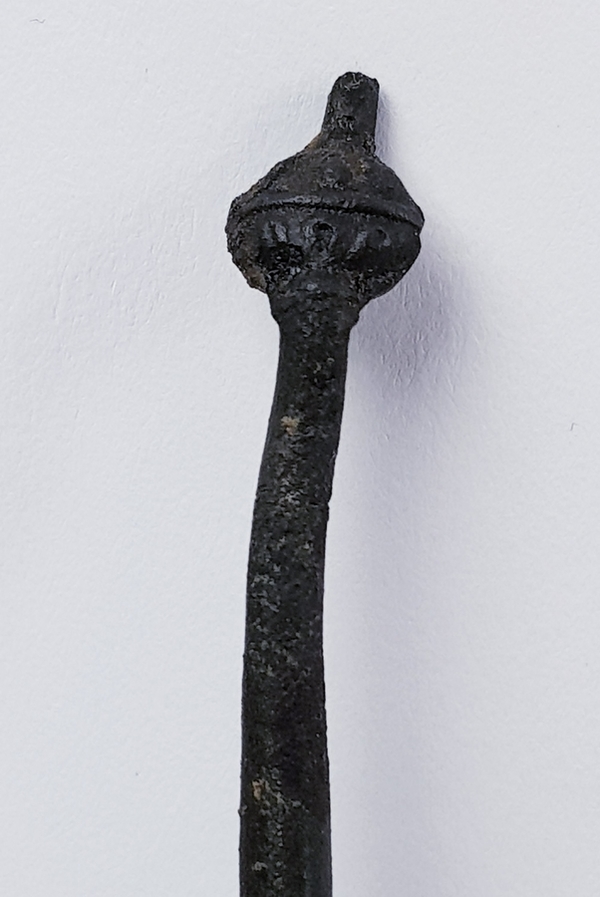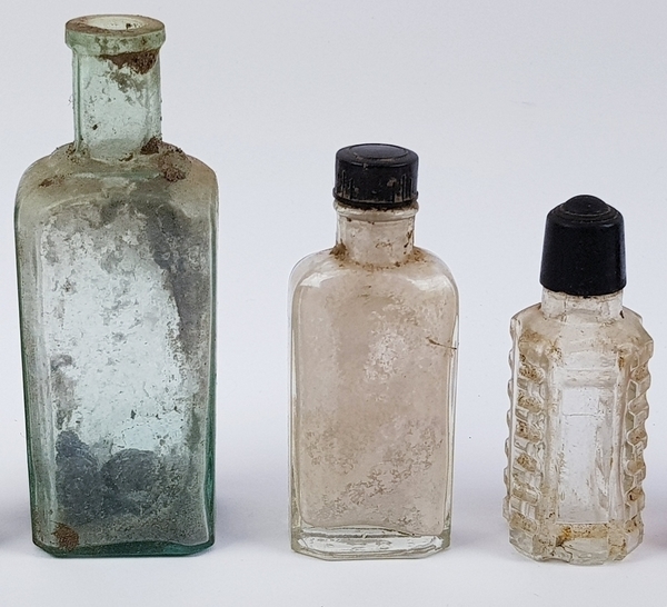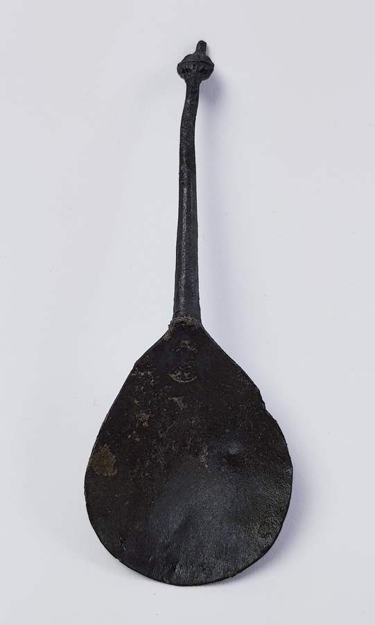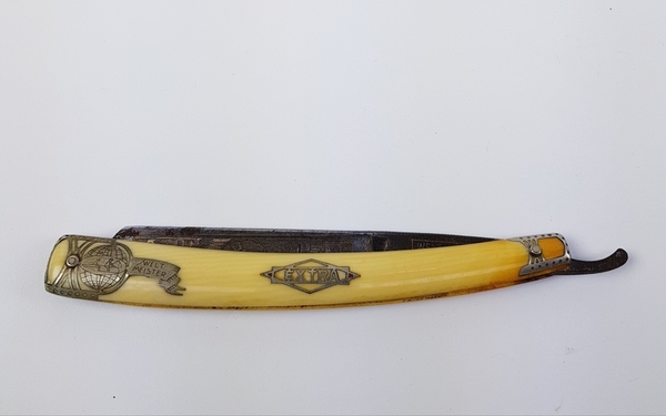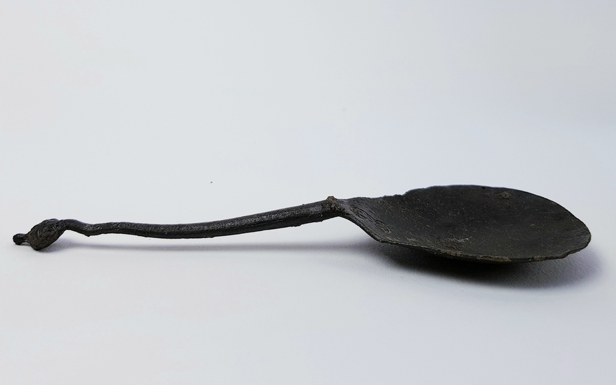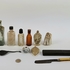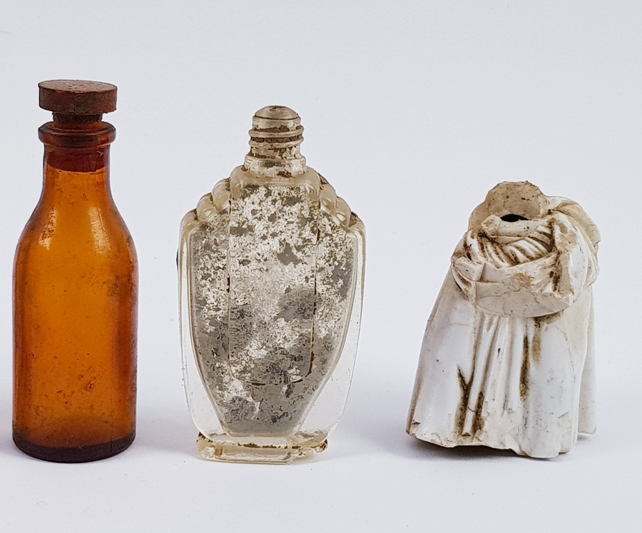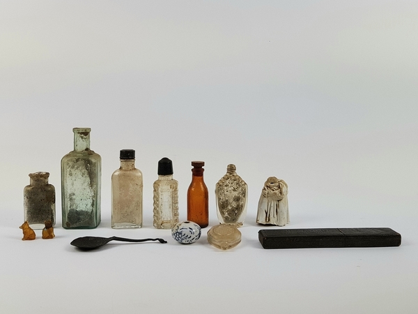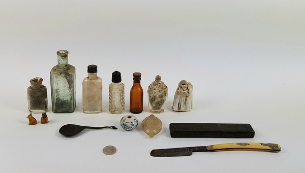 Divers lot met een scheermes, bodemvondsten, twee glazen beeldjes en een tinnen lepel. |