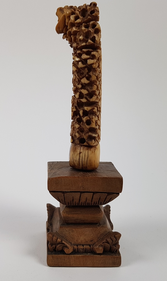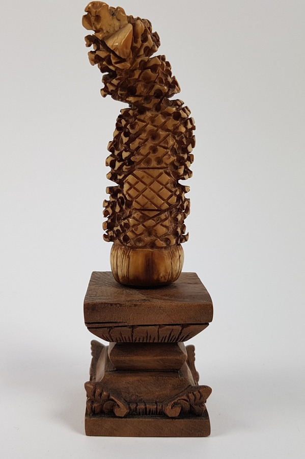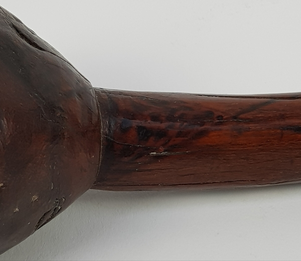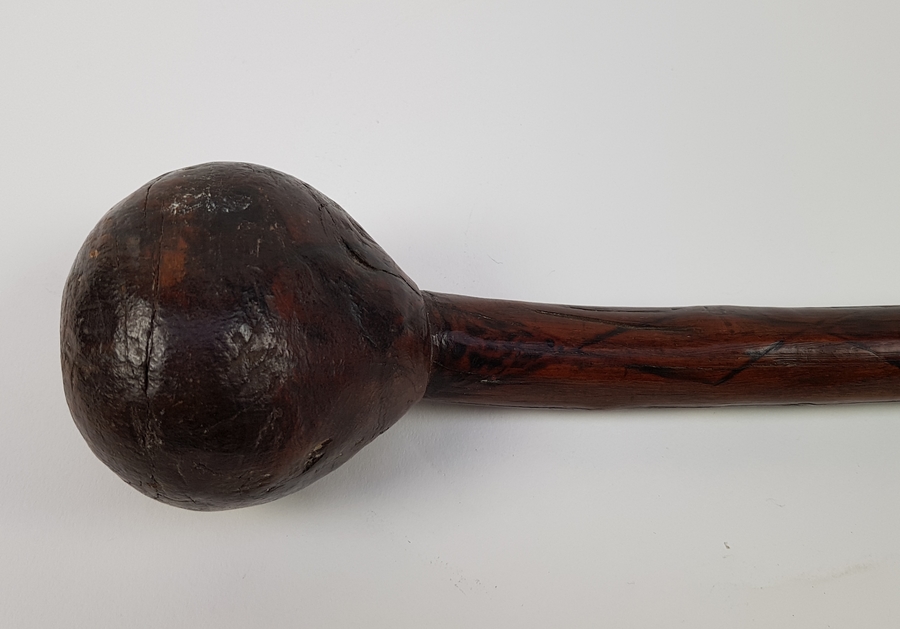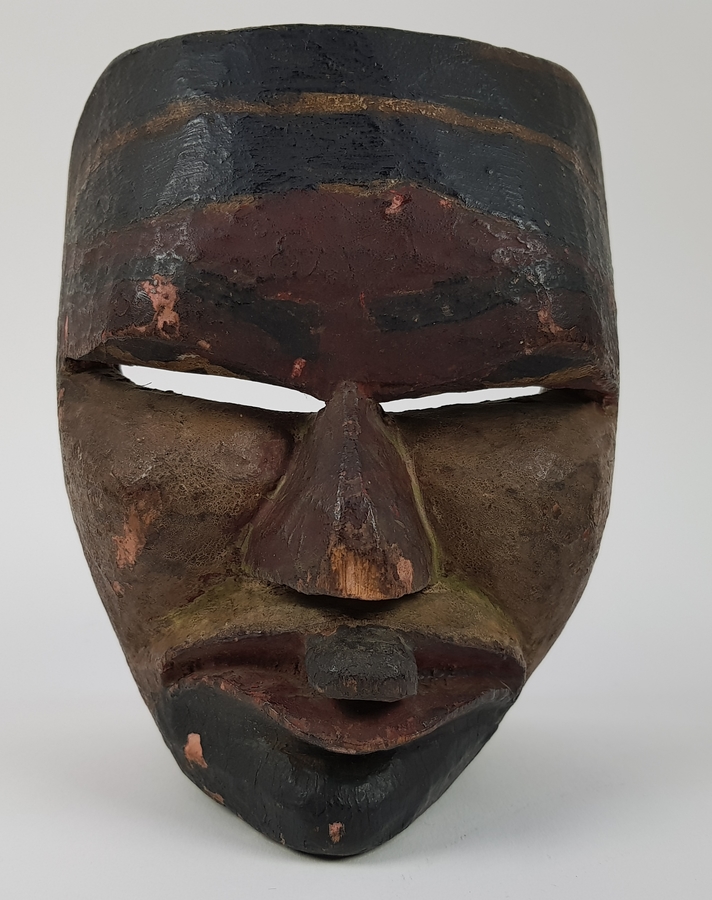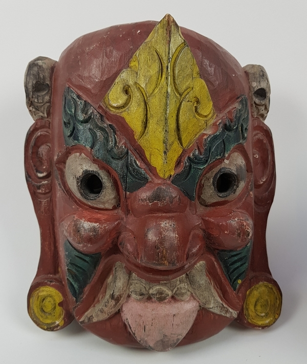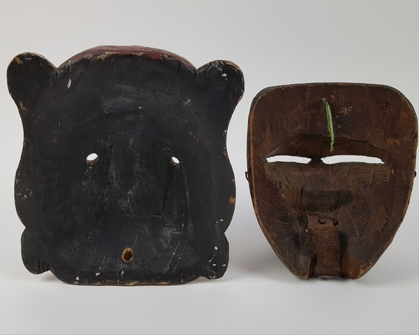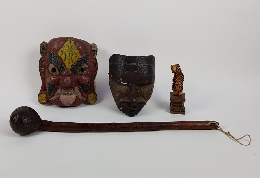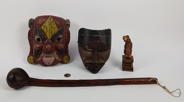 Hout e.a. , Lot divers Indisch waaronder een Barongmasker. 1e helft 20e eeuw Indonesië. A. Polychroom Barong masker. B. Polychroom Javaans masker. C. Krisgreep op houten sokkel. D. Knuppel. |