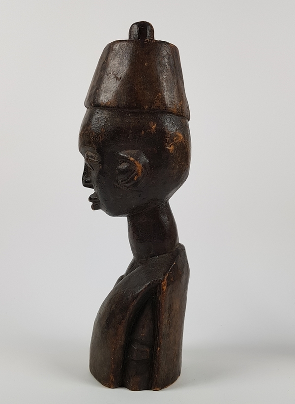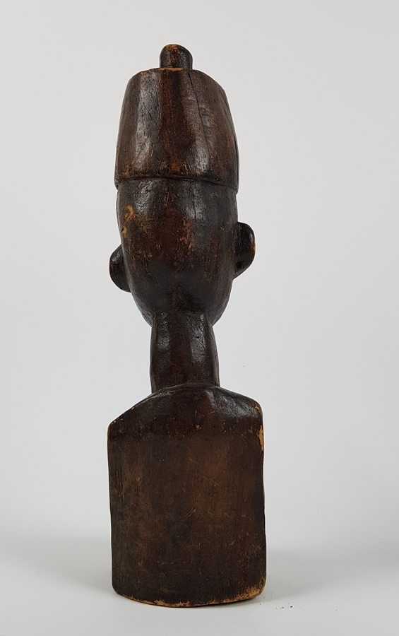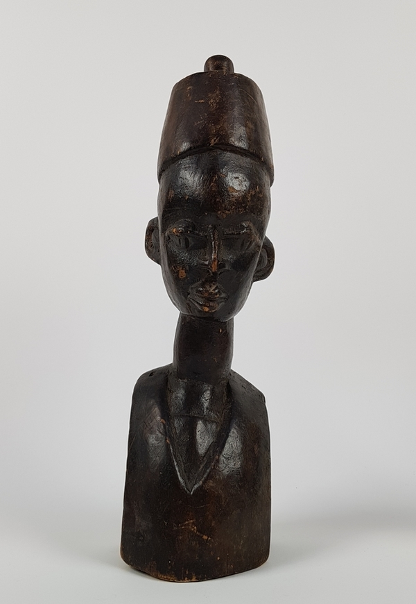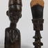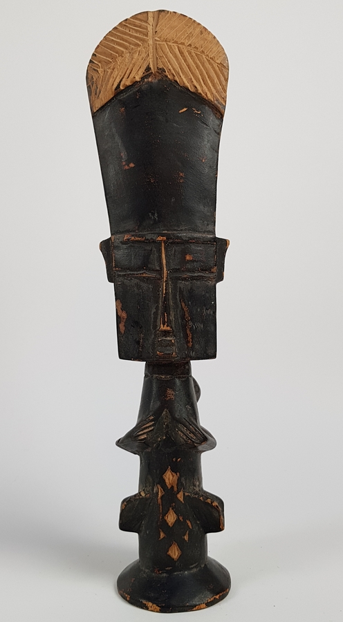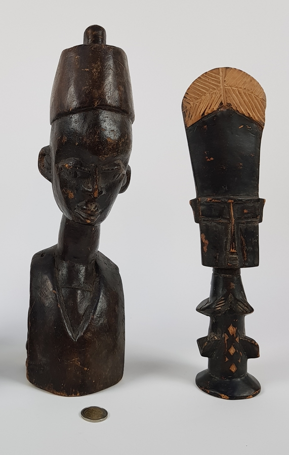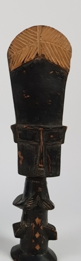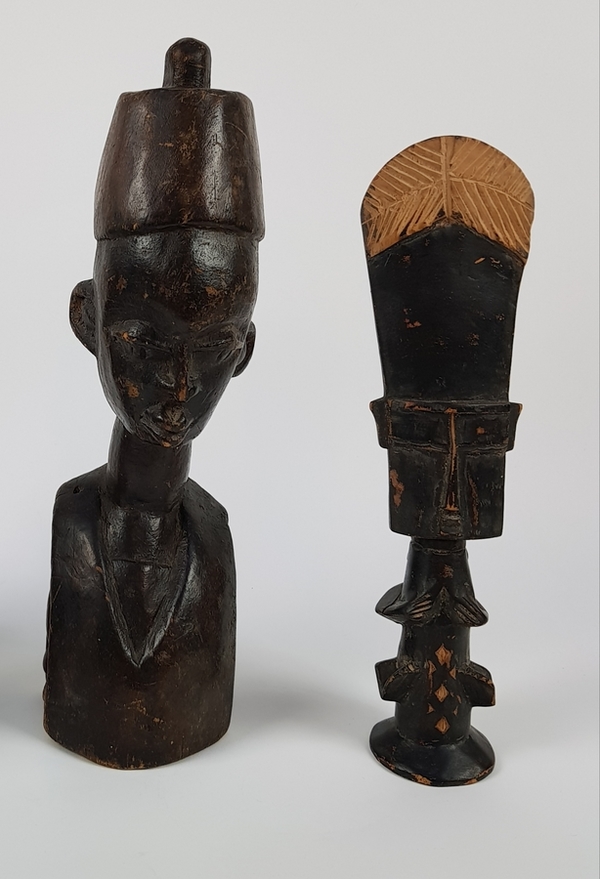 Hout, Lot van 2 etnografische beelden waaronder een decoratieve "Fante akua ba" pop. midden 20e eeuw midden Afrika. A. Een decoratief vruchtbaarheids- beeld : Fante akua ba pop, Ghana. B. Beeld van man met hoofddeksel, vermoedelijk Congolees (D.R.C.). |