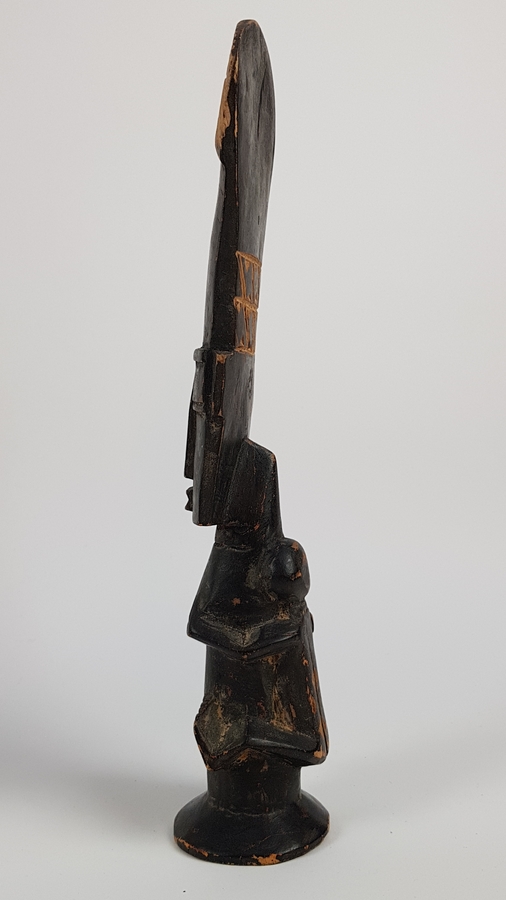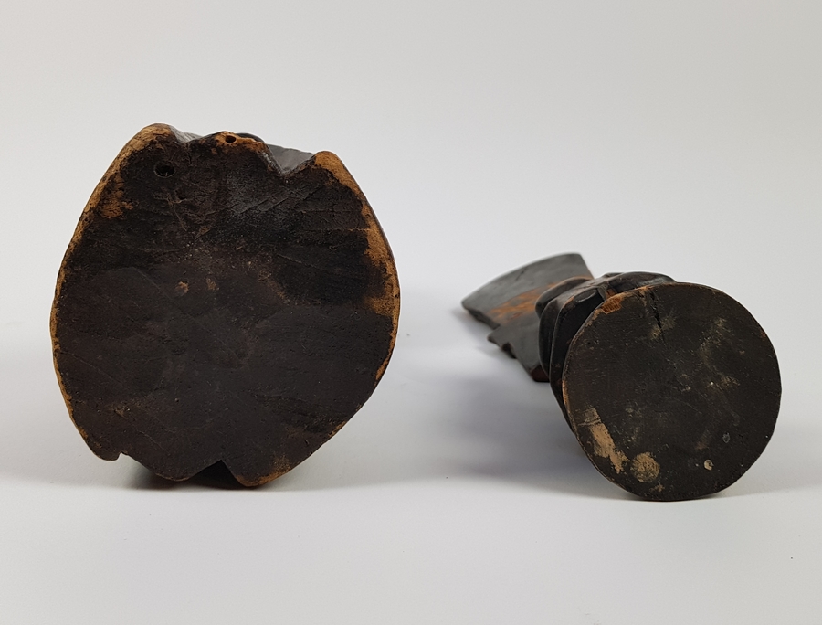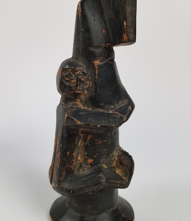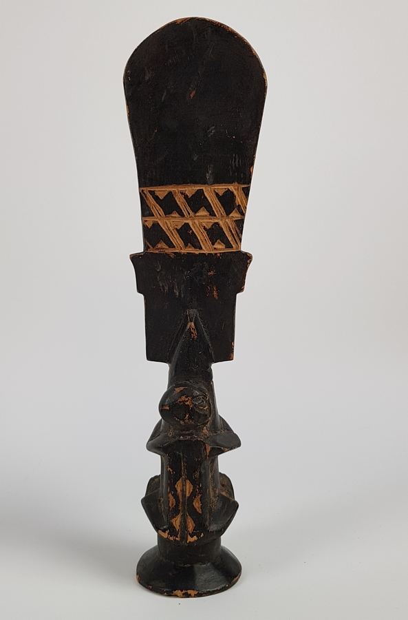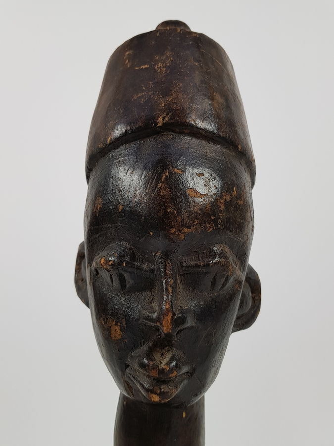 Hout, Lot van 2 etnografische beelden waaronder een decoratieve "Fante akua ba" pop. midden 20e eeuw midden Afrika. A. Een decoratief vruchtbaarheids- beeld : Fante akua ba pop, Ghana. B. Beeld van man met hoofddeksel, vermoedelijk Congolees (D.R.C.). |