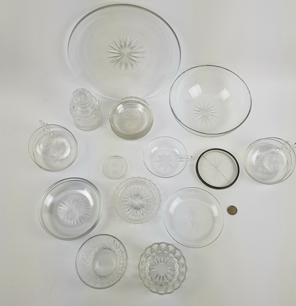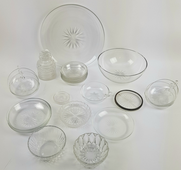 Divers lot glaswerk waaronder een bord, kom, schalen, schotels en stopfles. |