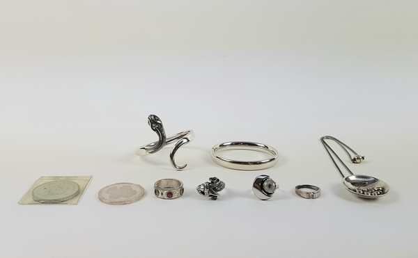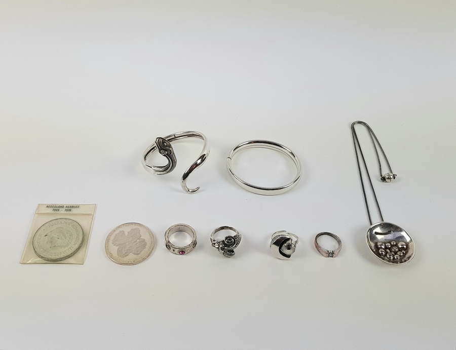 Divers lot met o.a. zilveren munten, armbanden, een ketting en ringen. |