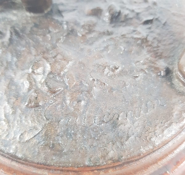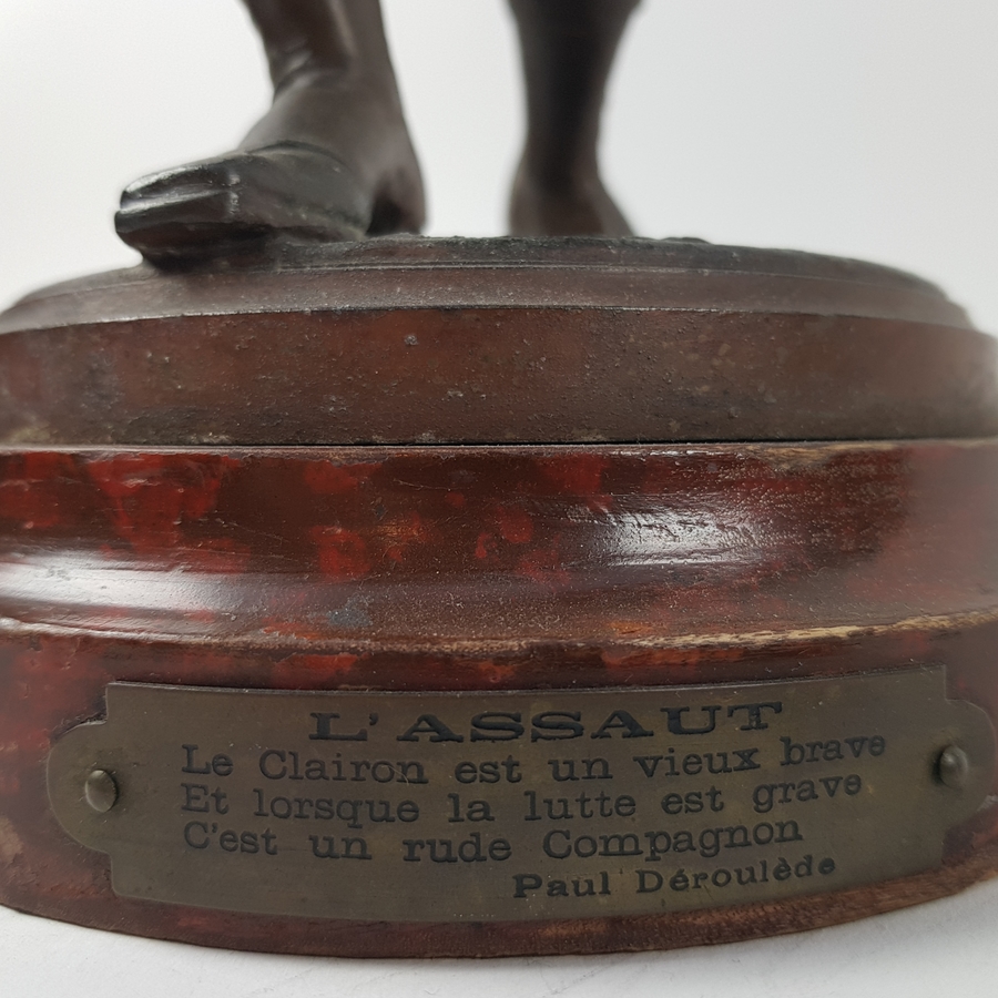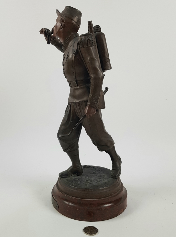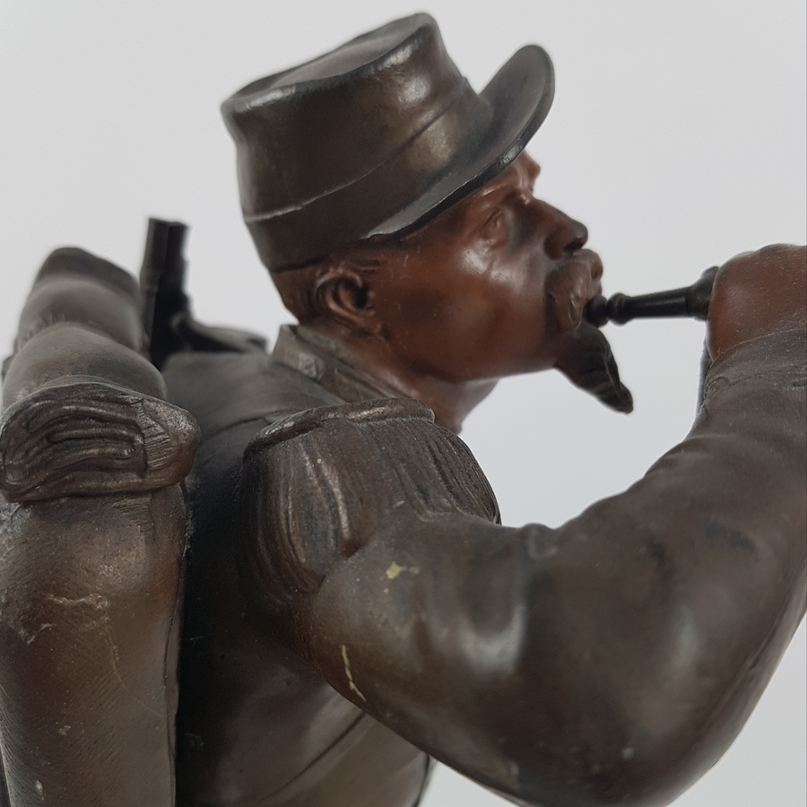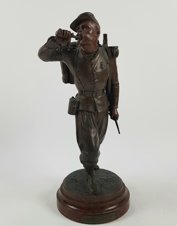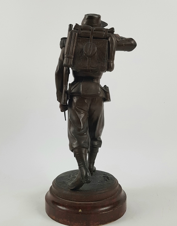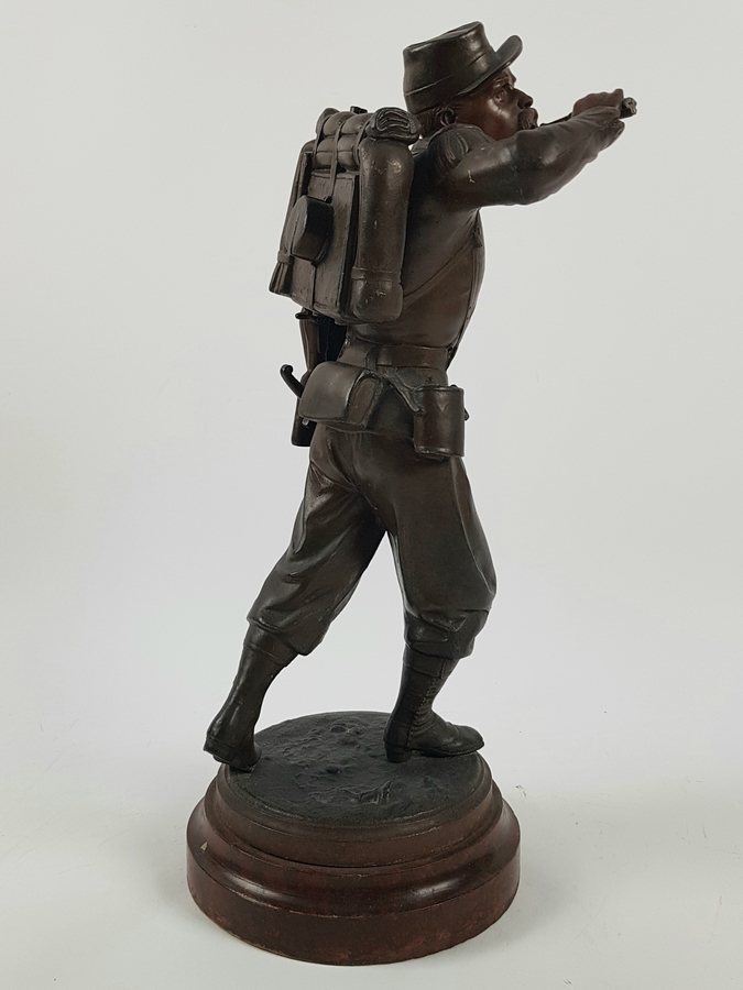 Een gebronsde sculptuur van een Belgische soldaat. Gesigneerd Staande op houten voetstuk met naamplaatje. |