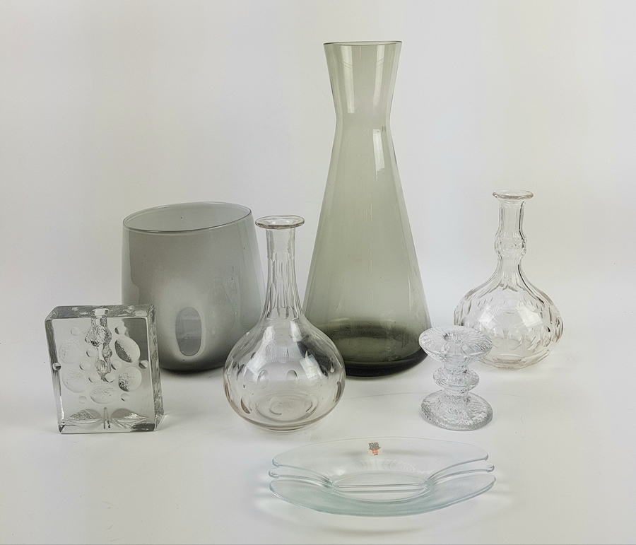 Divers lot glaswerk waaronder vazen, kaarsenstandaard, bonbonschaal en karaffen. |