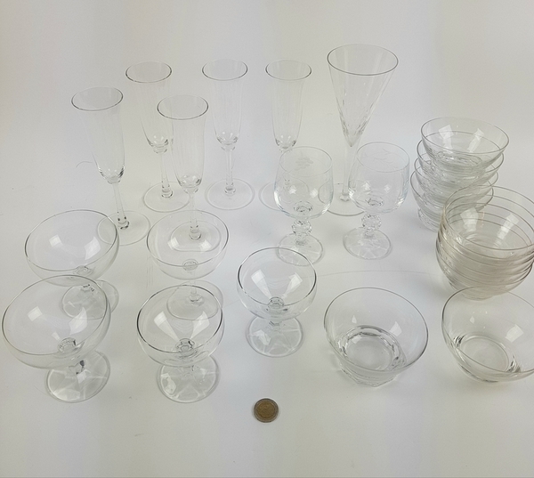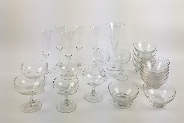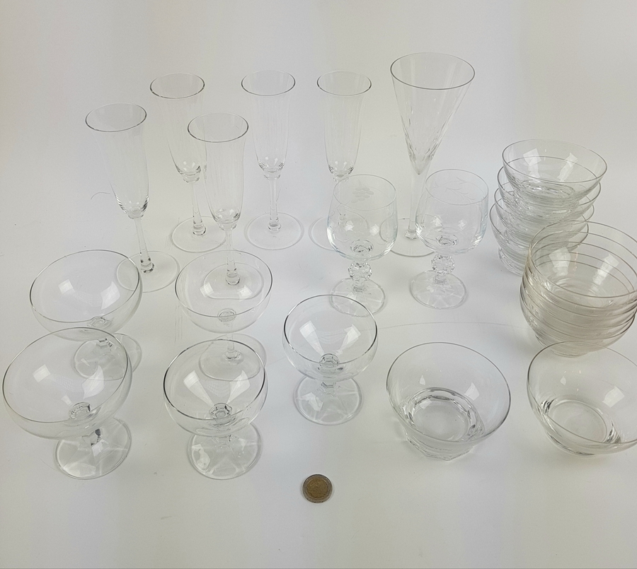 Glaswerk waaronder glazen, bowlschaatjes en dessertschaaltjes. |