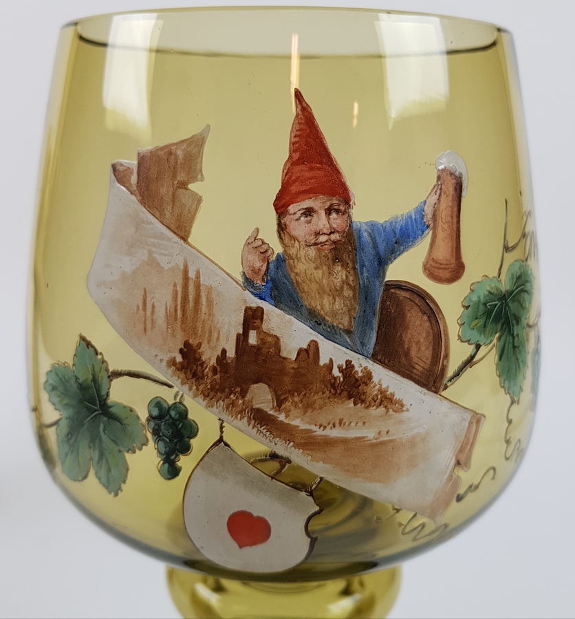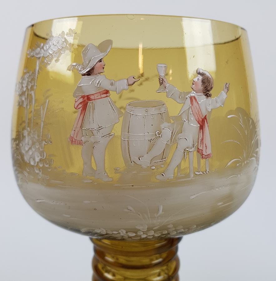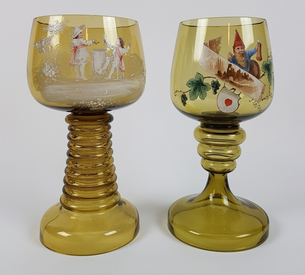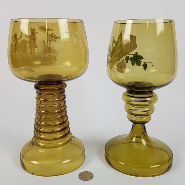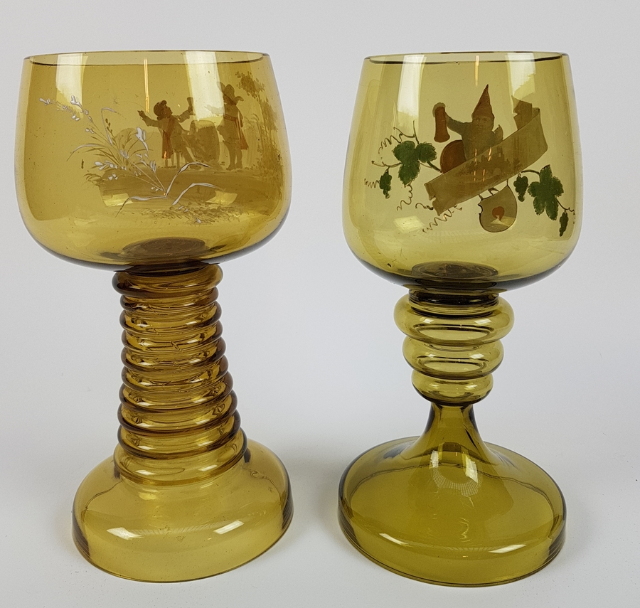 Twee glazen roemers met emaile beschildering circa 1900. |
