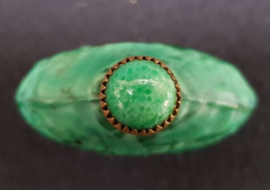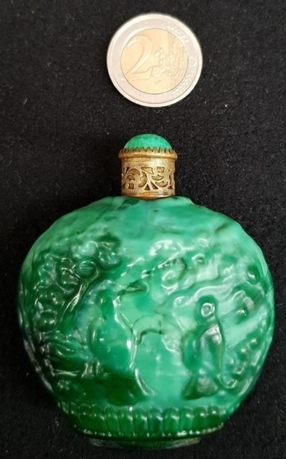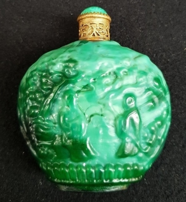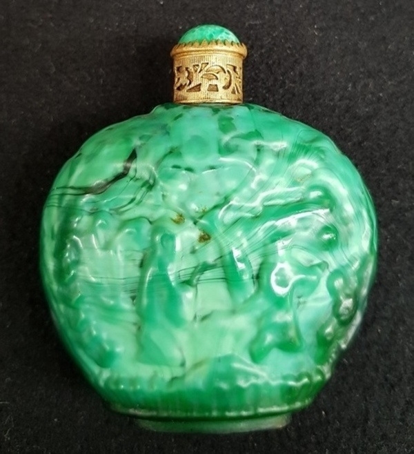 Groene glazen parfumfles, 1e helft 20e eeuw. |