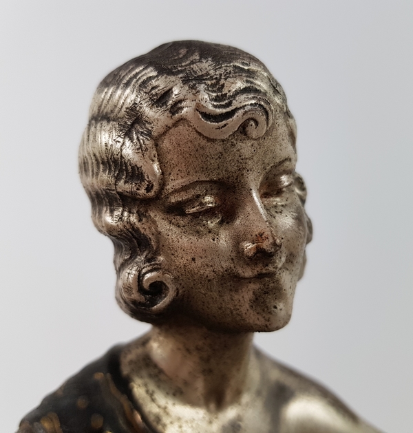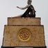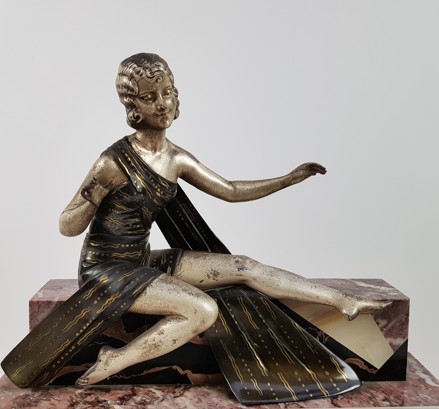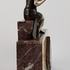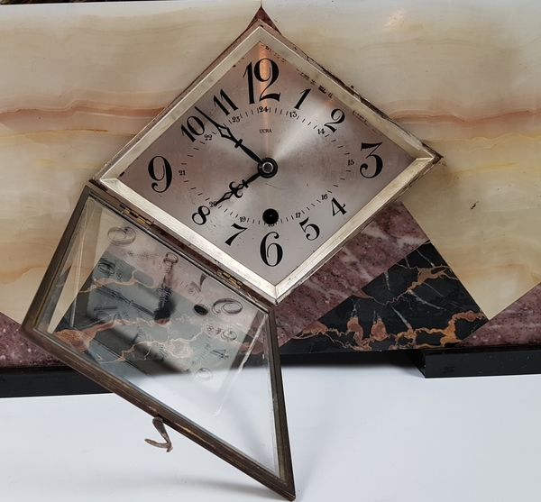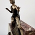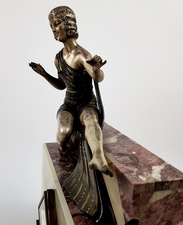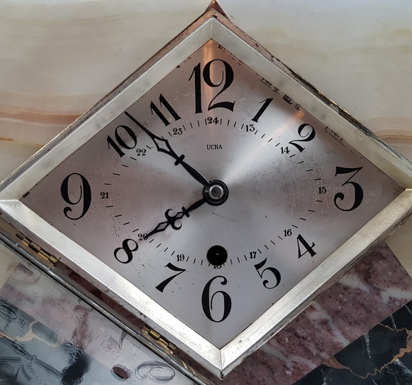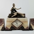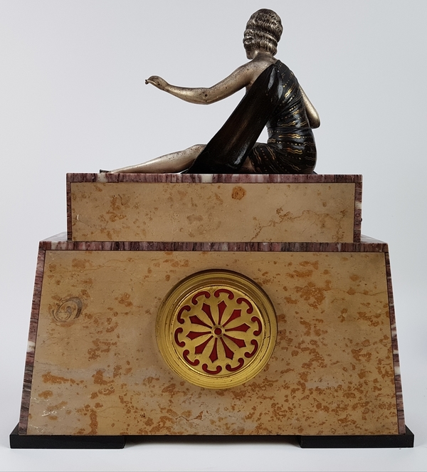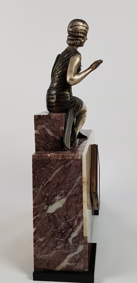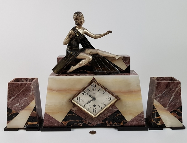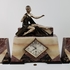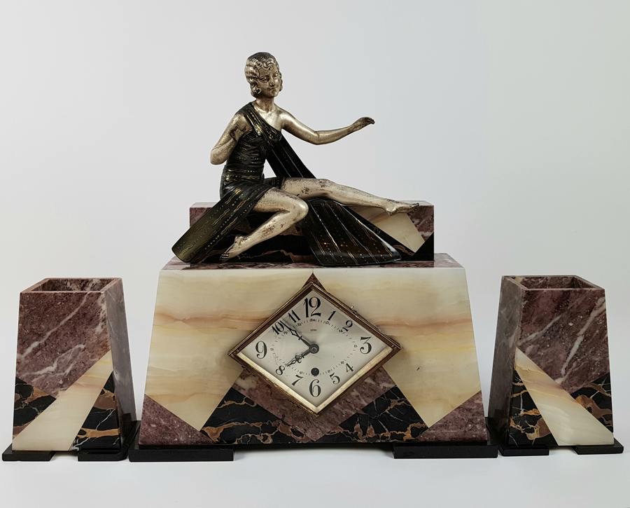 Art Deco klokkenstel met beeld van een vrouw uitgevoerd in drie kleuren marmer. |