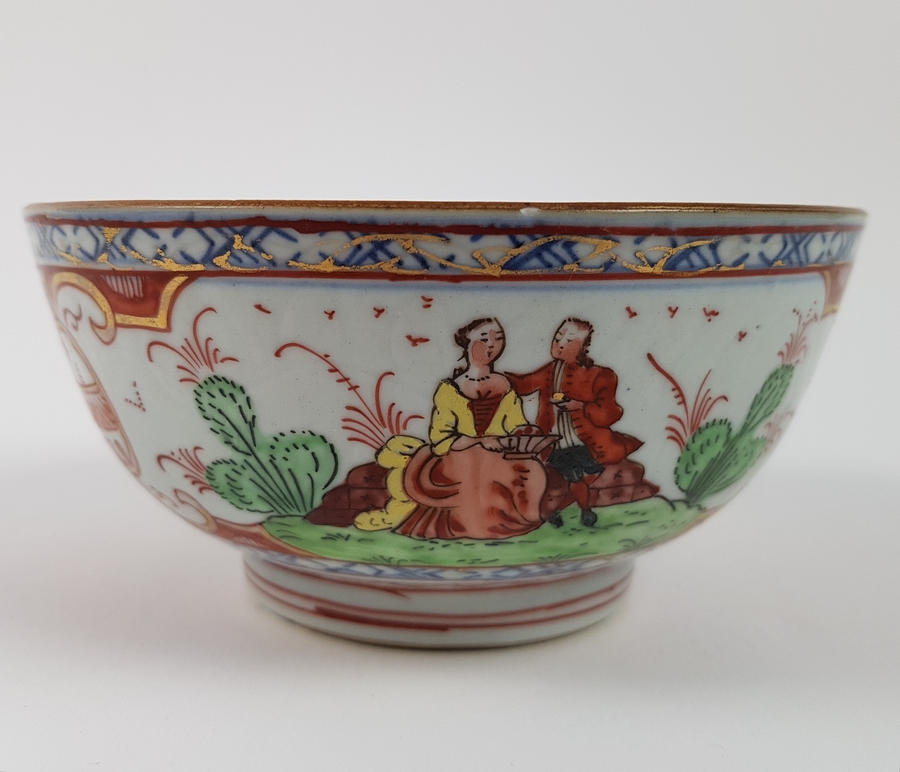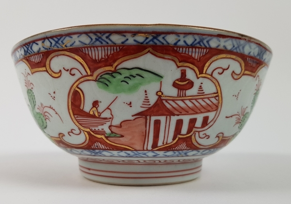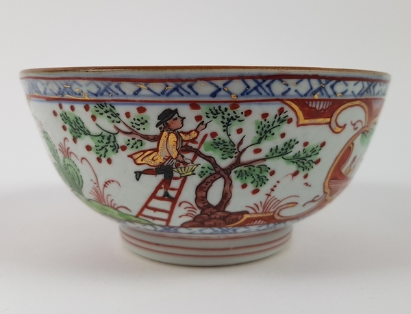 Porseleinen kom, Amsterdams bont, decor Cherry pickers, China, 18e eeuw