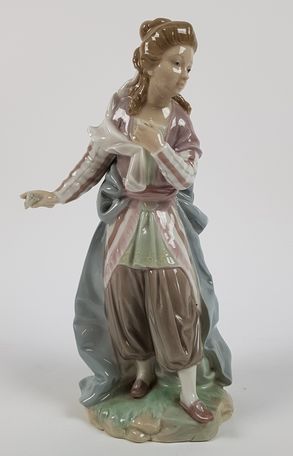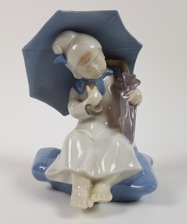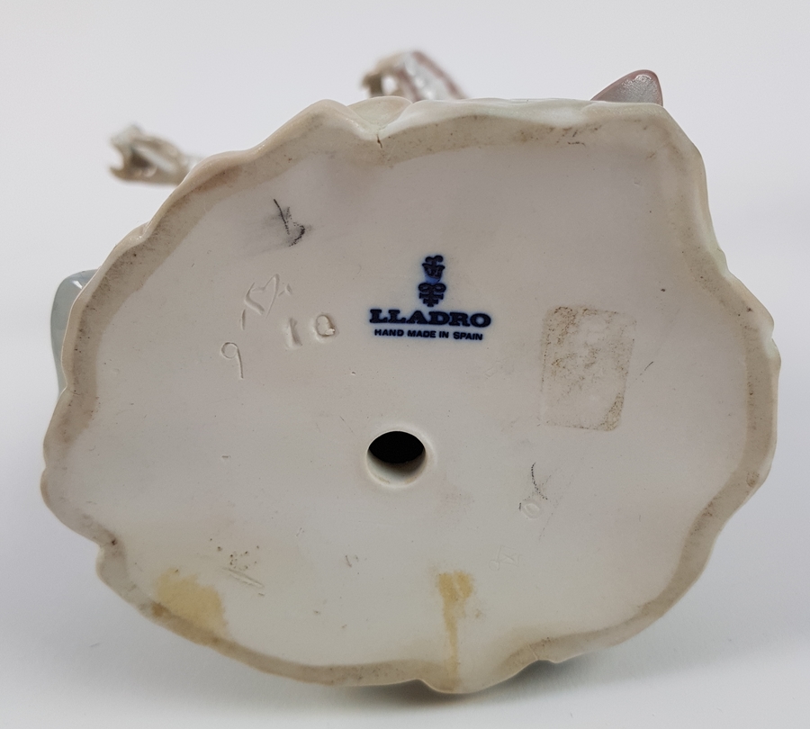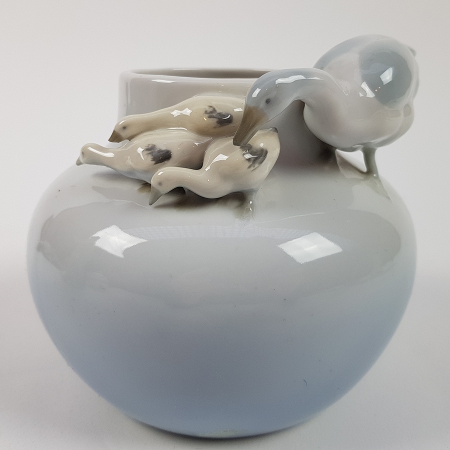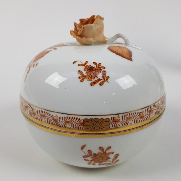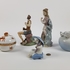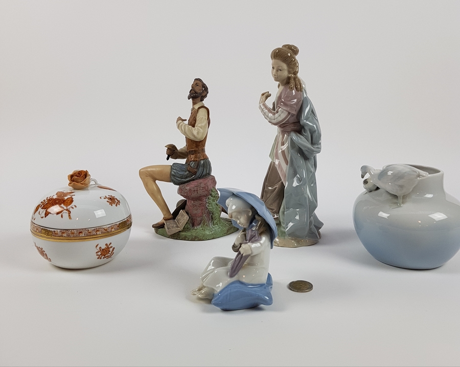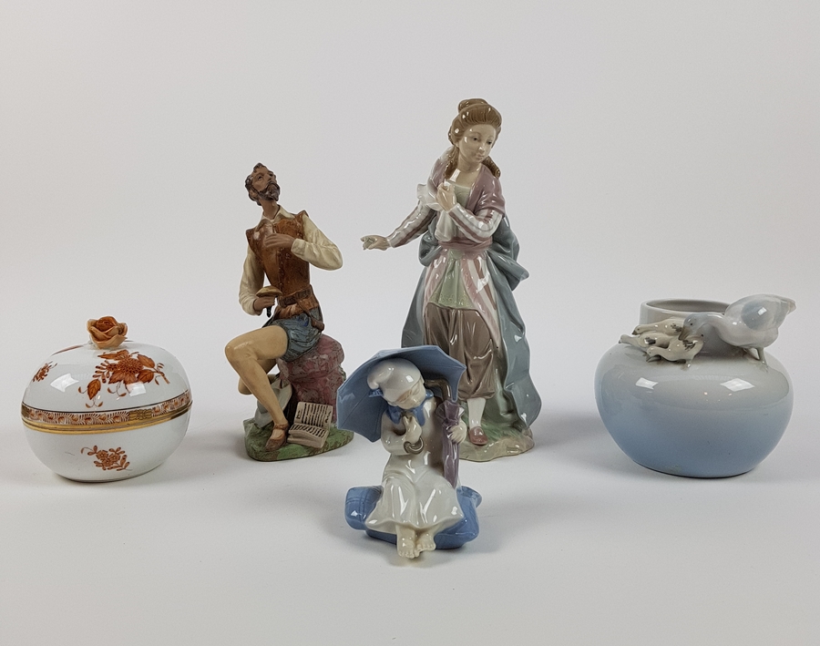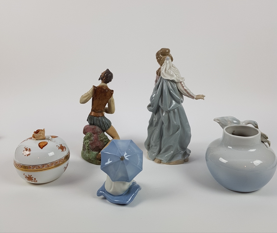 Dekselpot gemerkt Herend, twee beelden gemerkt Lladro en een beeld gemerkt GDR (Grafenthal). |