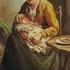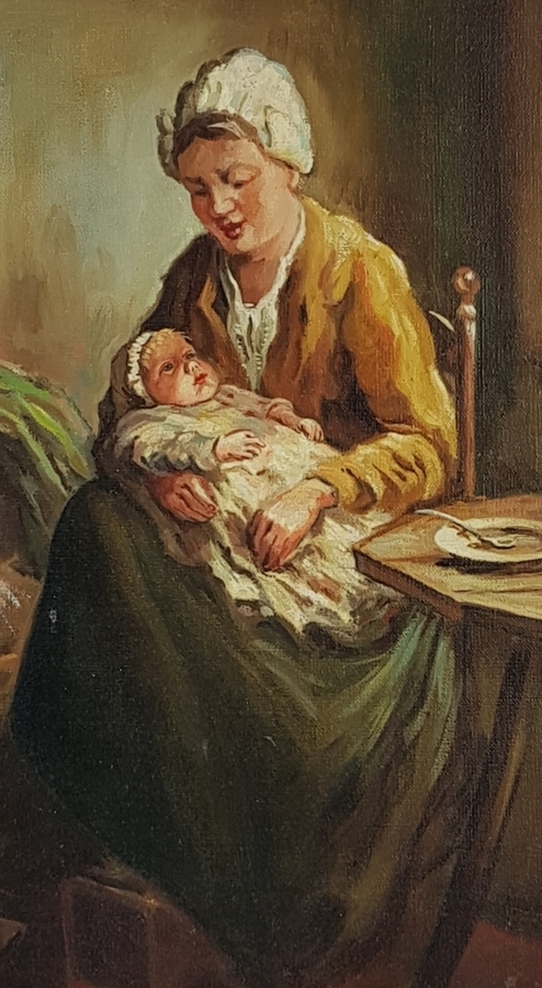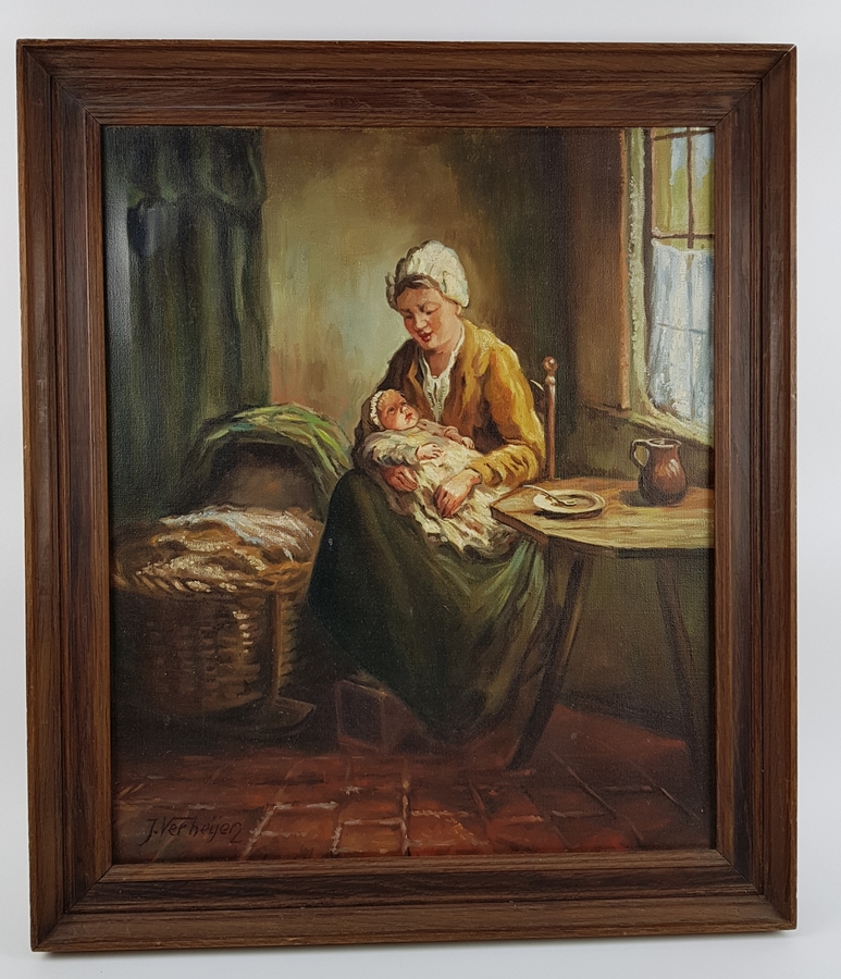 Schilderij olieverf op doek, 19e eeuws tafereel van moeder en kind. Gesigneerd J. Verheijen |