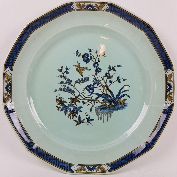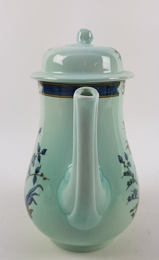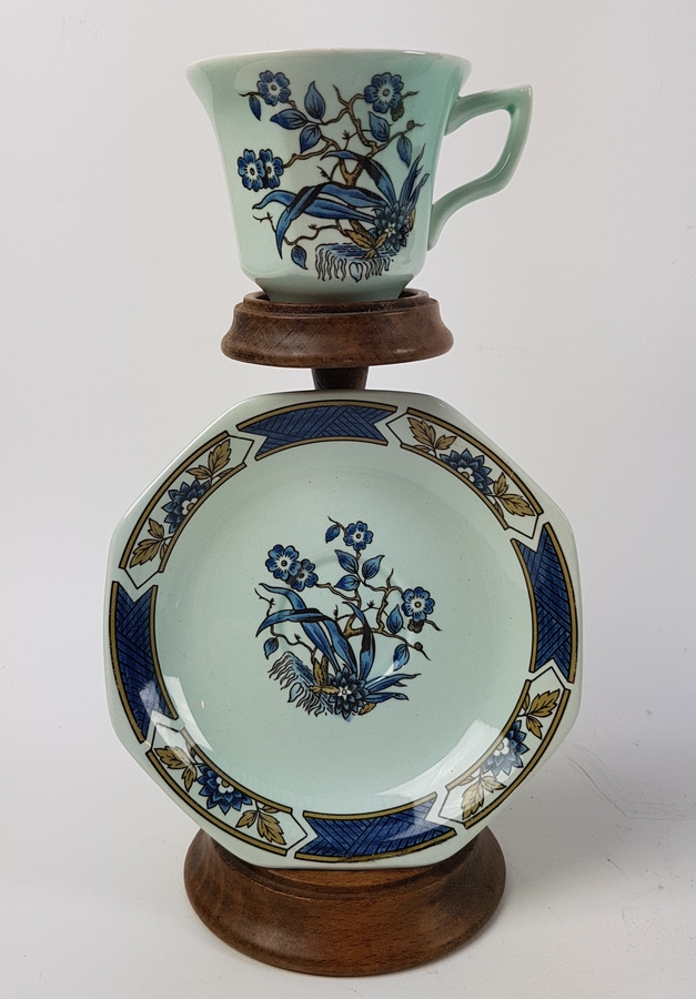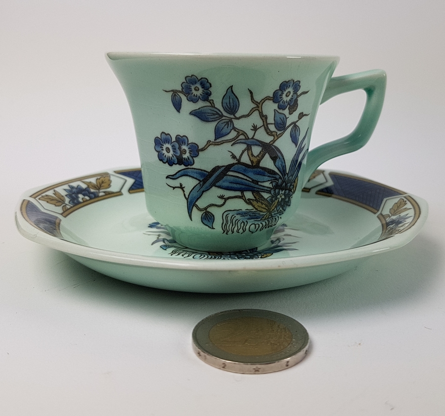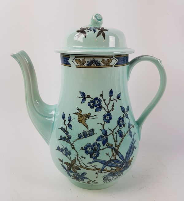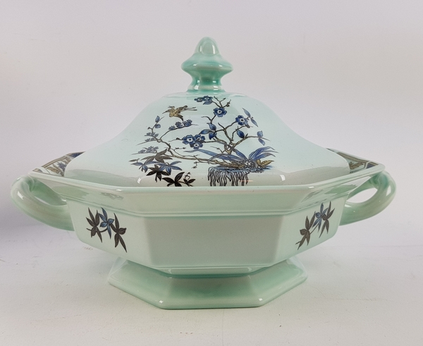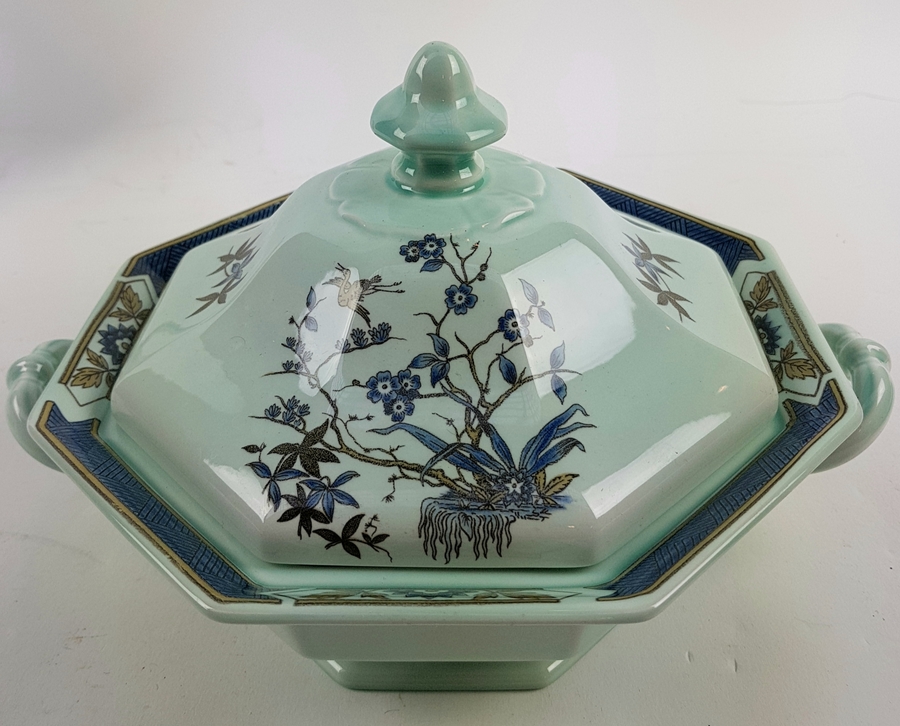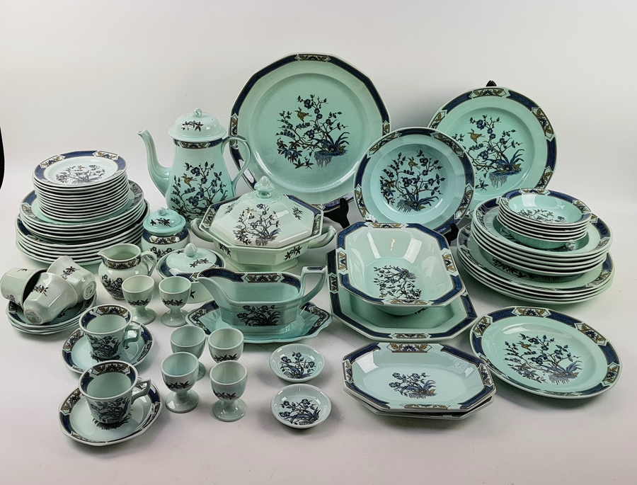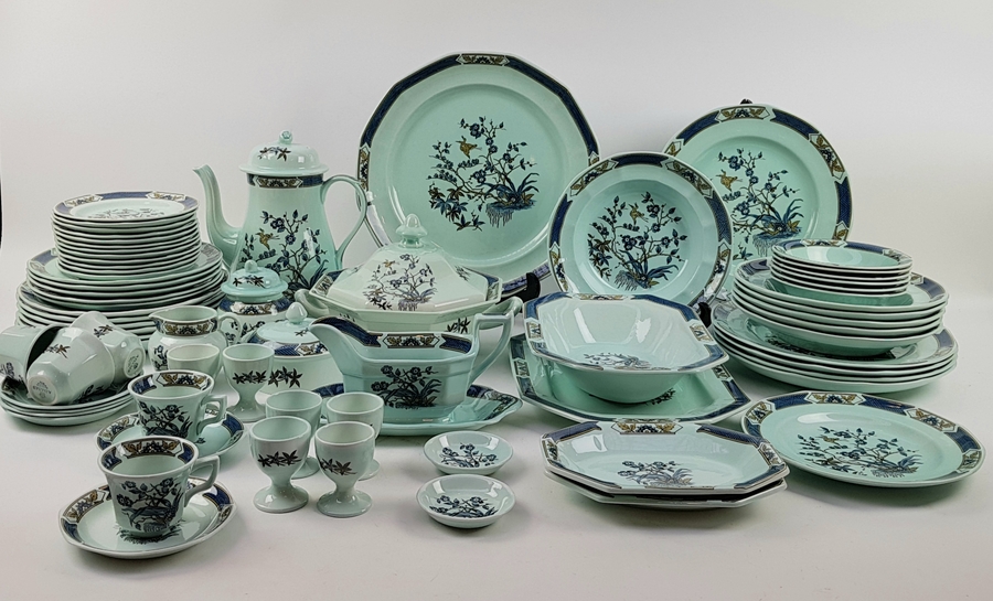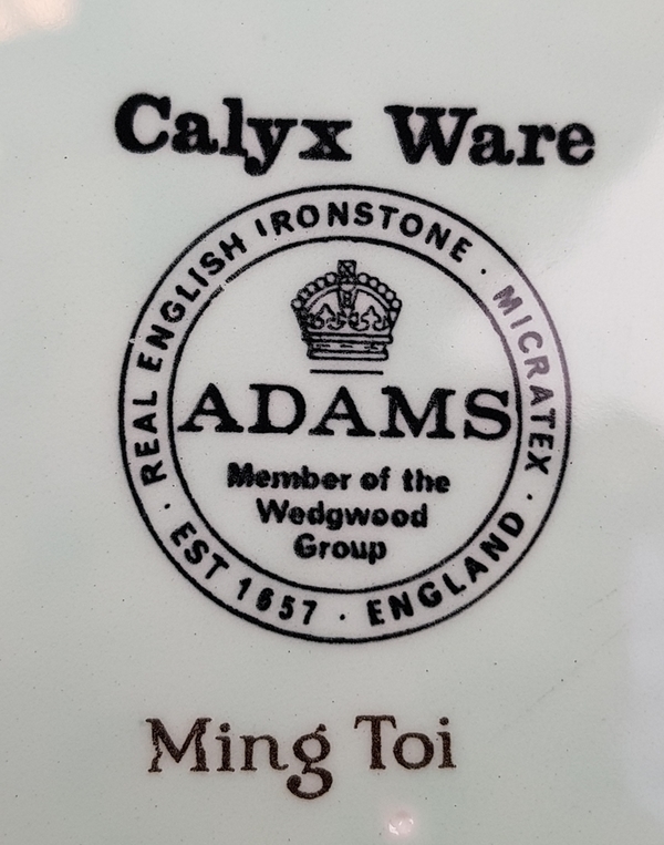 Servies van Adams (member of the Wedgewoord group) Calyx Ware Ming Toi. Servies bestaat onder andere uit vier opdienschalen, twee schalen, dekschaal, koffiepot, juskom, 6 kleine borden, 6 dessertschalen, 6 diepe borden, 6 middelgrote borden, vier grote borden, zes eierdopjes, melkan, suikerpot en vijf kop en schotel. |