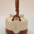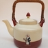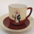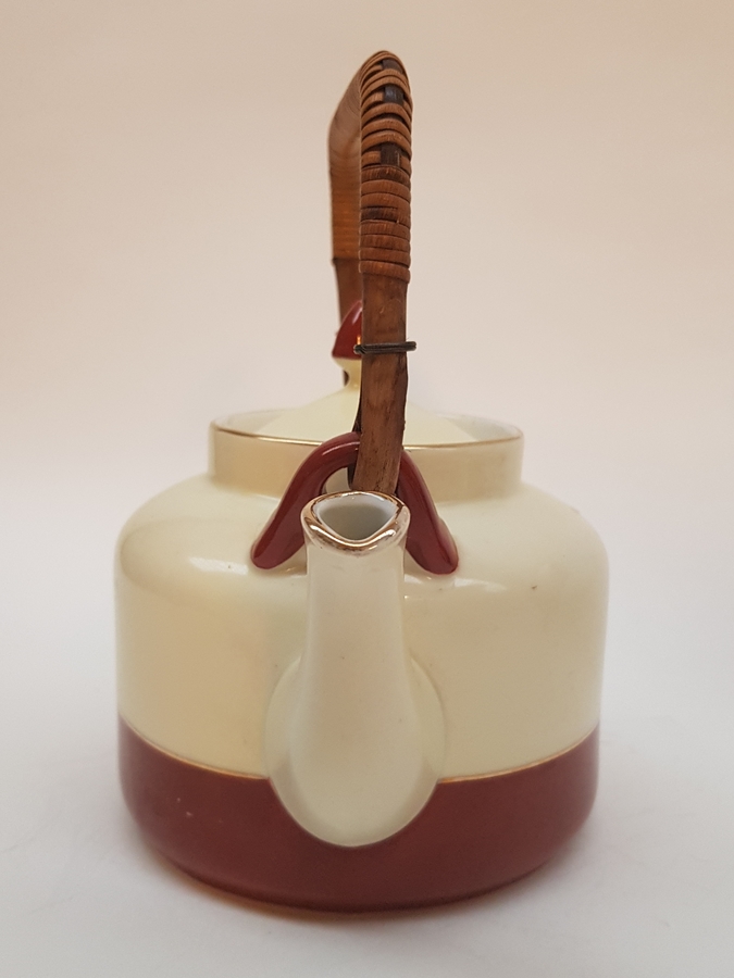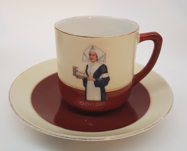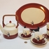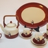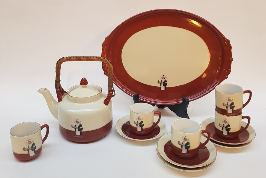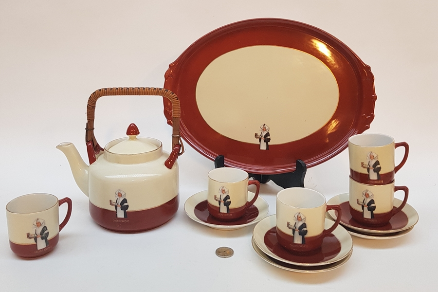 Porseleinen servies voor het opdienen van warme chocolademelk. Bestaande uit dienblad, een chocoladeketel en vijf kop en schotels, in de kleuren crème en donker rood/bruin. |