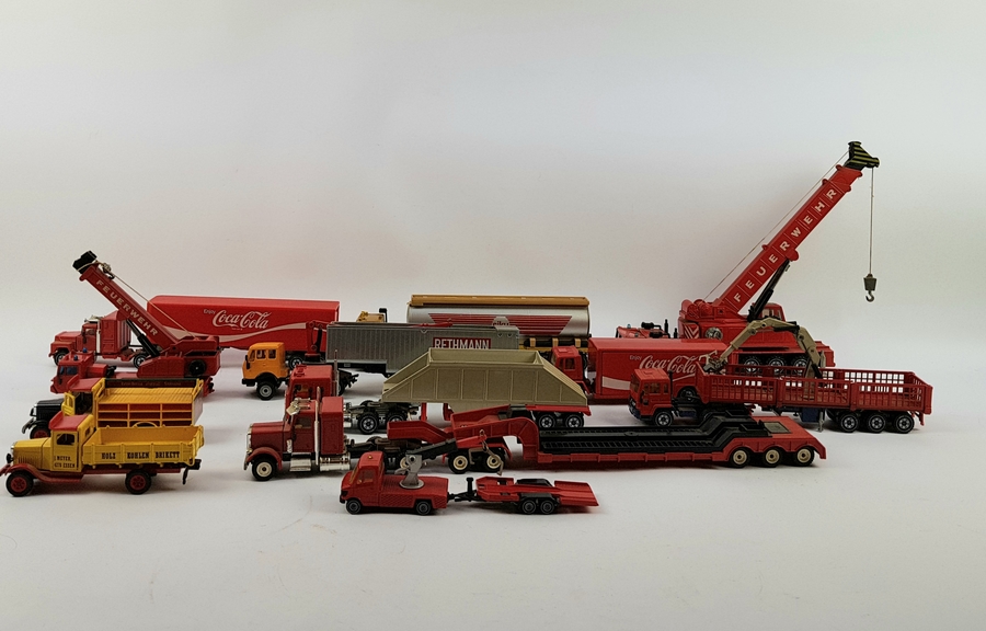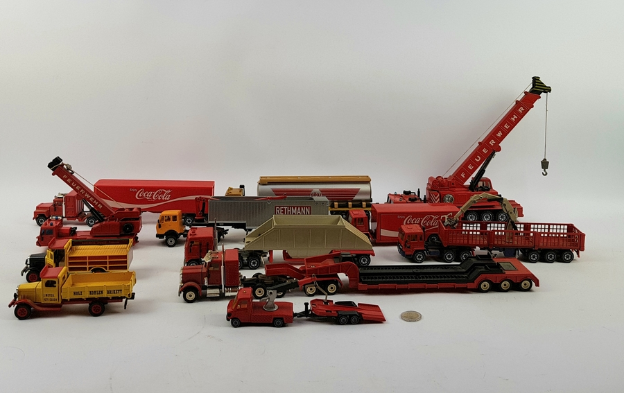 Siku metalen miniatuur vrachtwagens met opleggers en kraanwagens 12 stuks. |