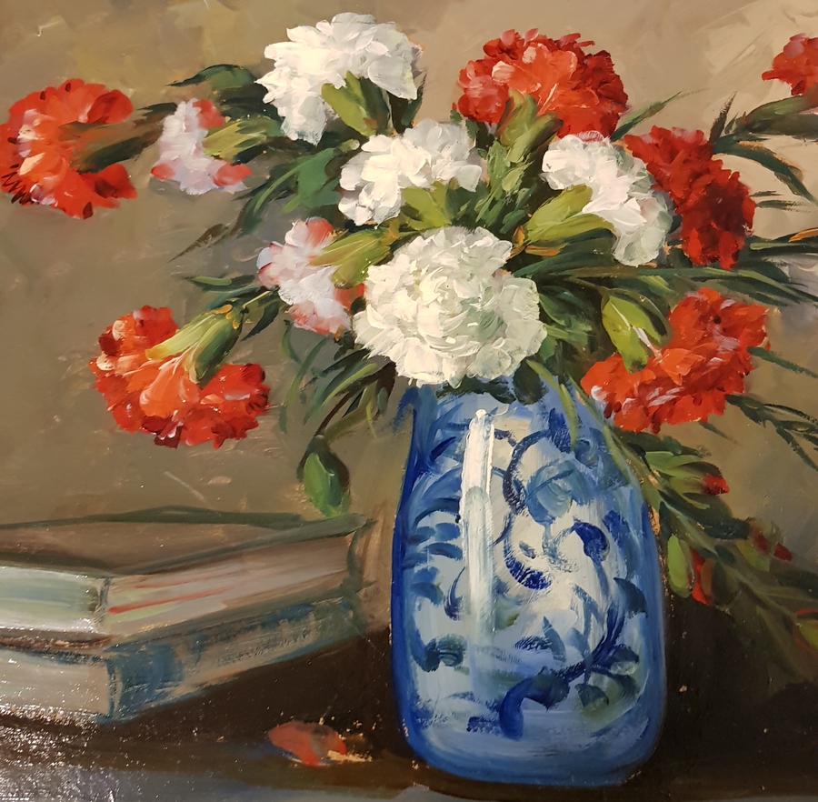 Stilleven "Anjers in vaas" gesigneerd G. Verbiesen. Aquarel gesigneetd Poppe Damare. |