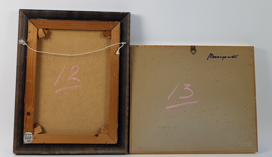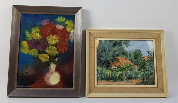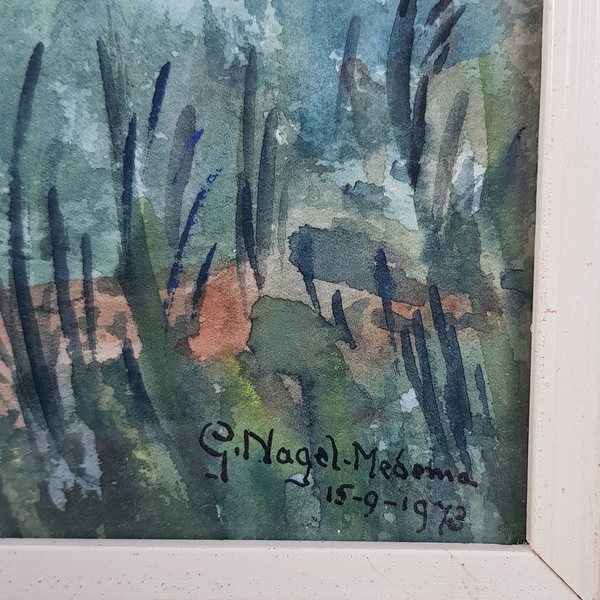 Stilleven gesigneerd "Lodewijk" en aquarel "Mensingerweer" gesigneerd Grietje Nagel-Miedema. |