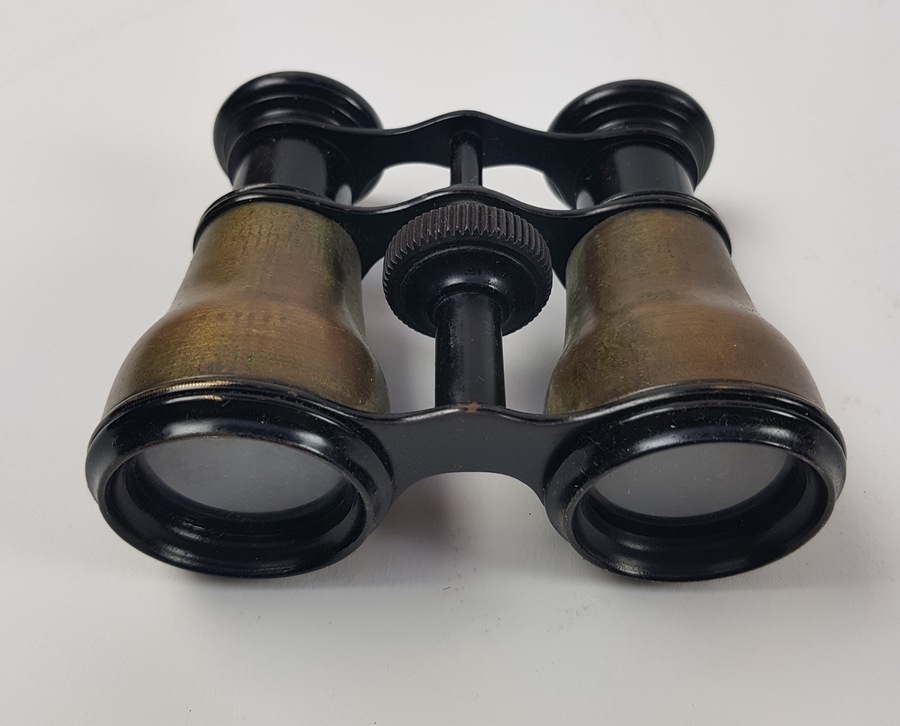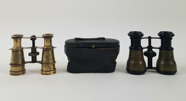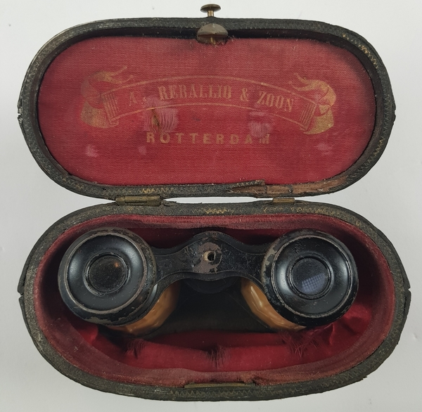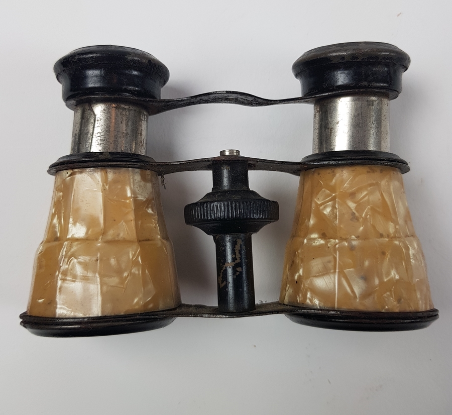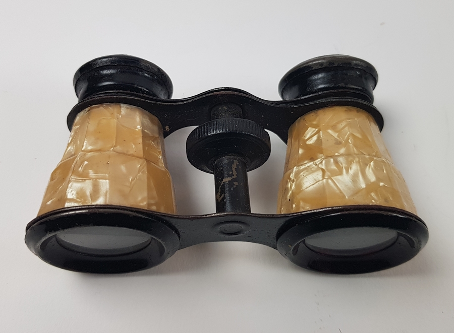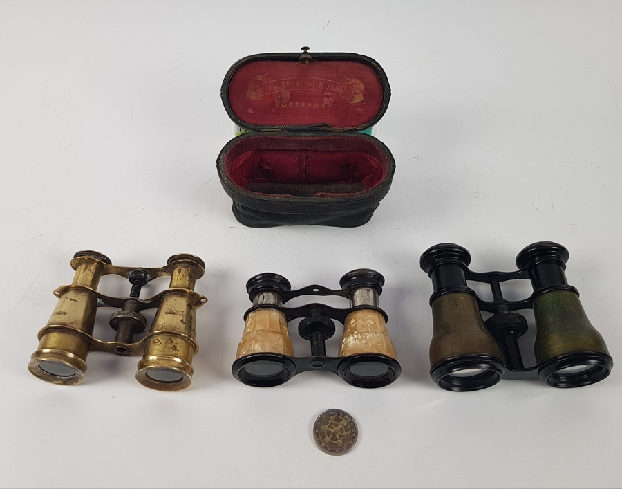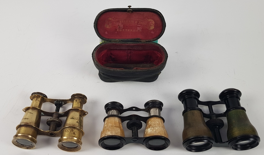 Drie toneelkijkers een bekleed met parelmoer en orginele foedraal begin 20e eeuw. |