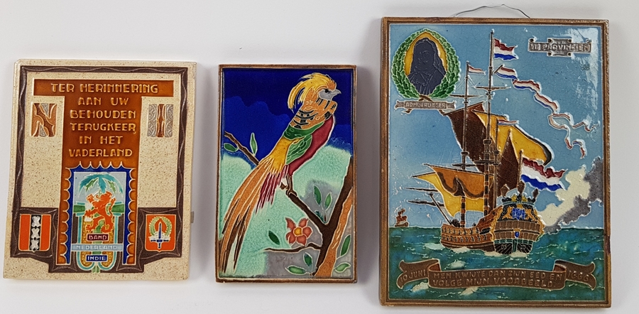 Drie verschillende tegels van Tegelfabriek Westraven Utrecht circa 1950. |