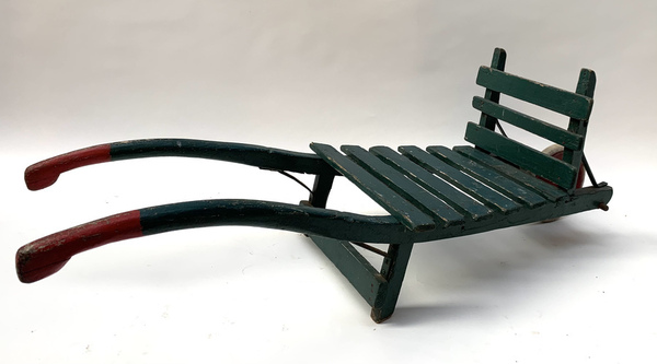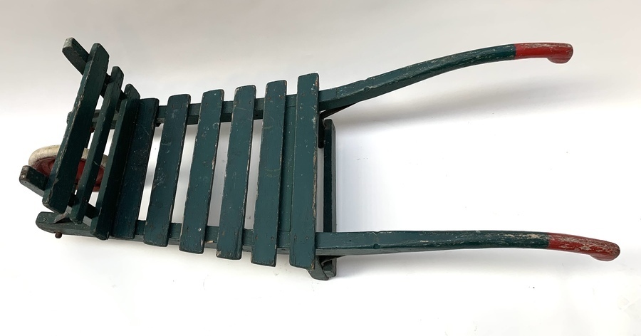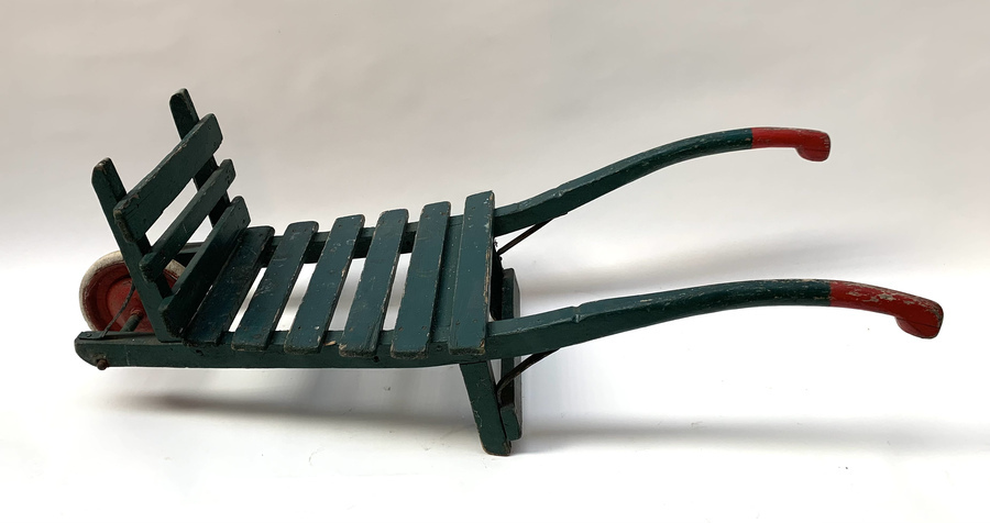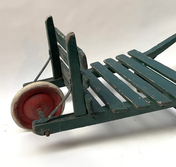 Groen geschilderde houten kinderkruiwagen, eerste helft 20e eeuw. |