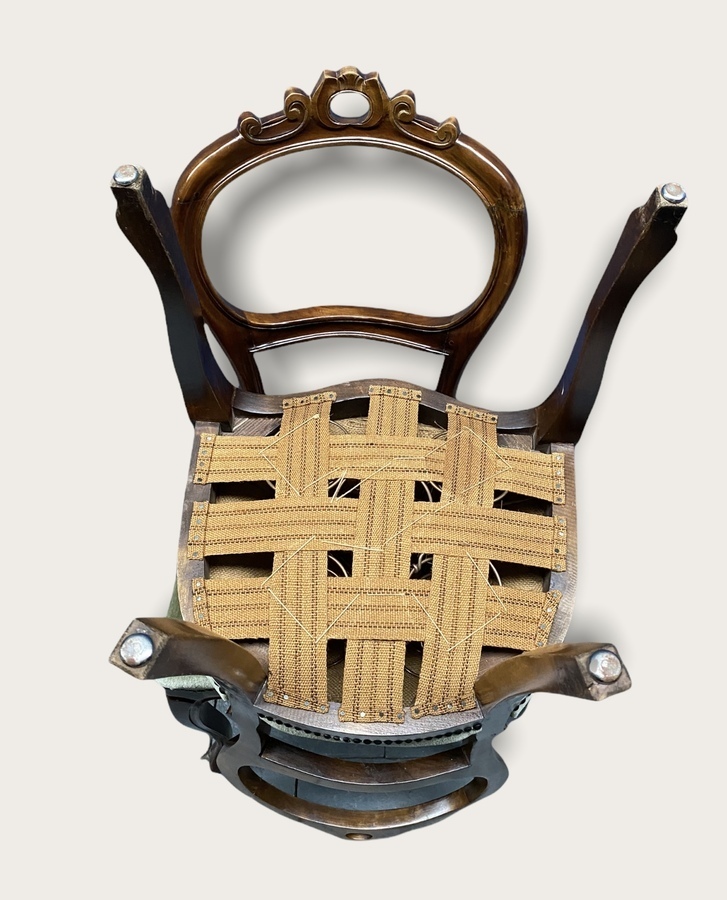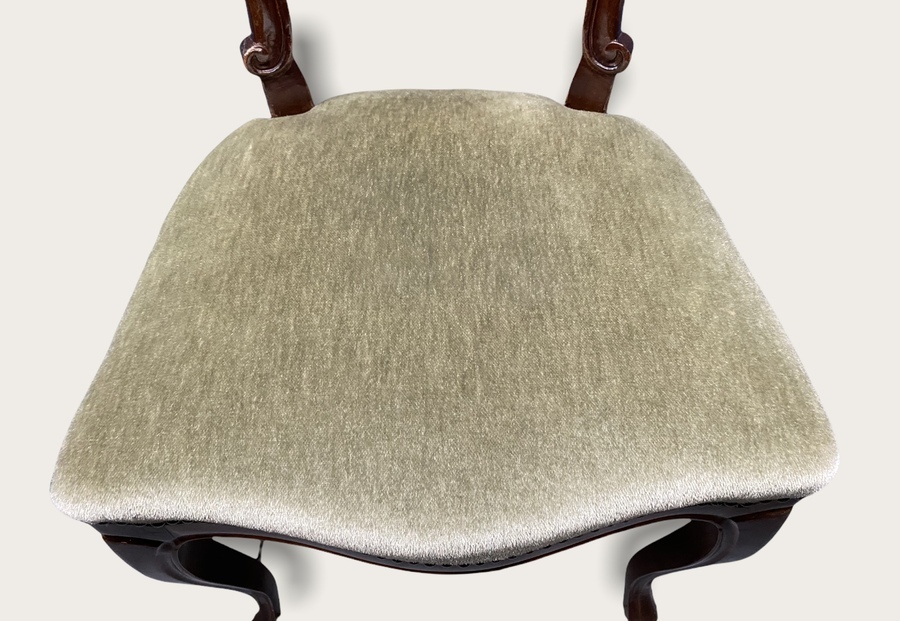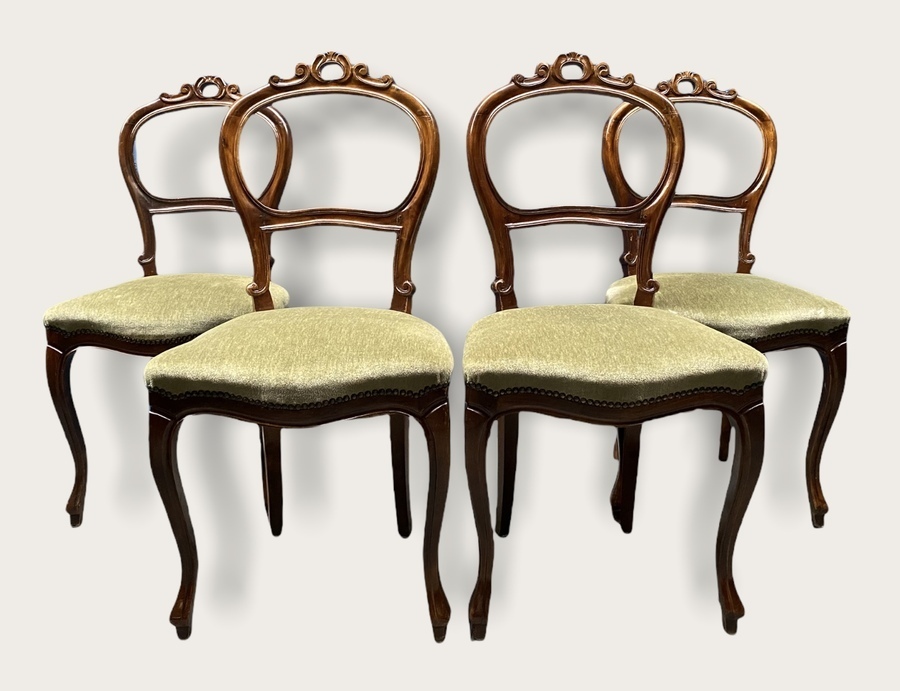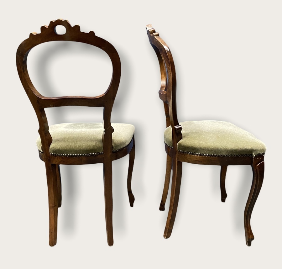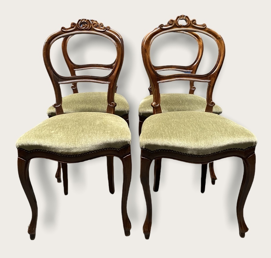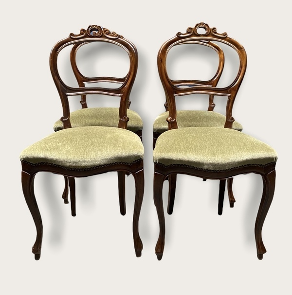 Vier Biedermeierstijl ballonrug stoelen met kroon, voorzien van groene velours stof. |