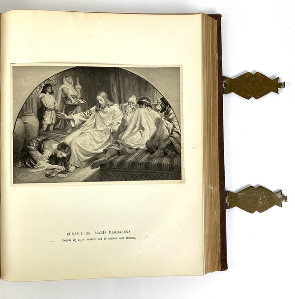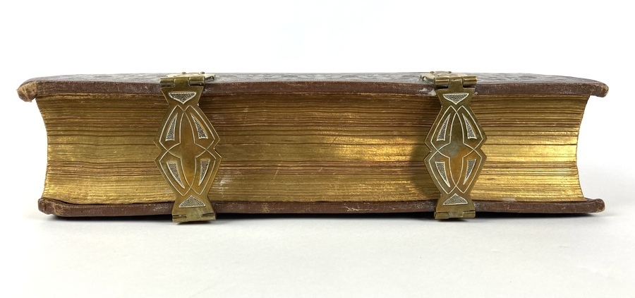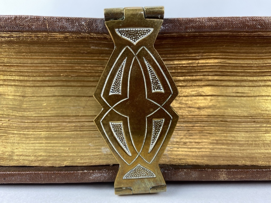 | Conditie | Lederen fraai gestempelde boekband met goudopdruk, voorzien van decoratieve aanzetstukken en bijbehorende klampen. Boekblok: goud-op-snee en stevig in de band. | |