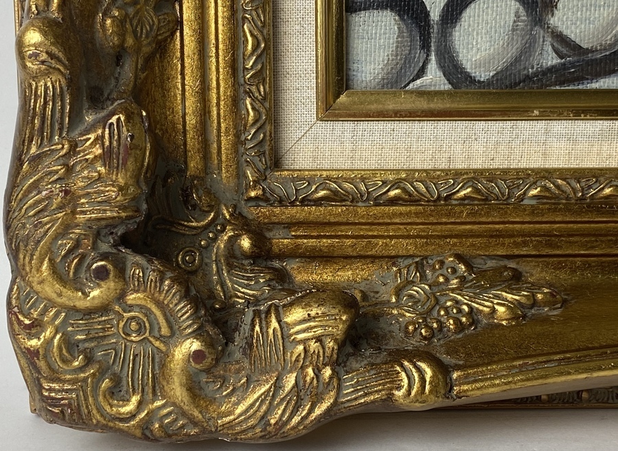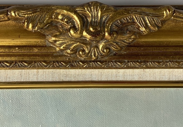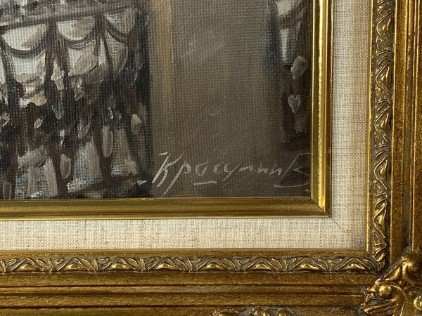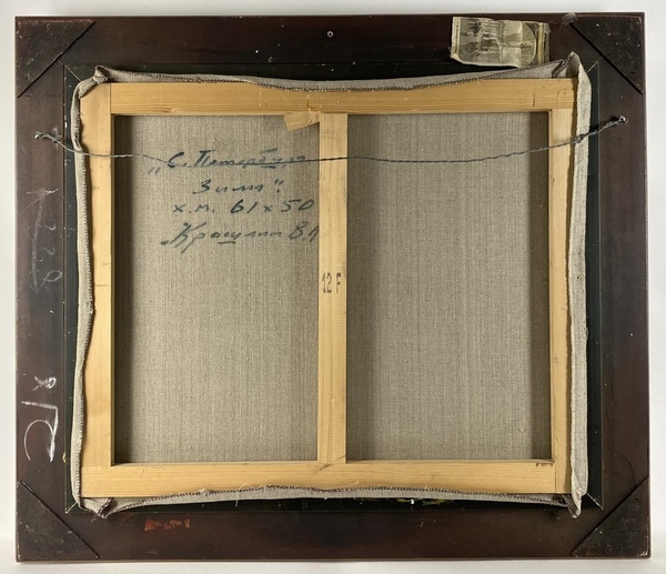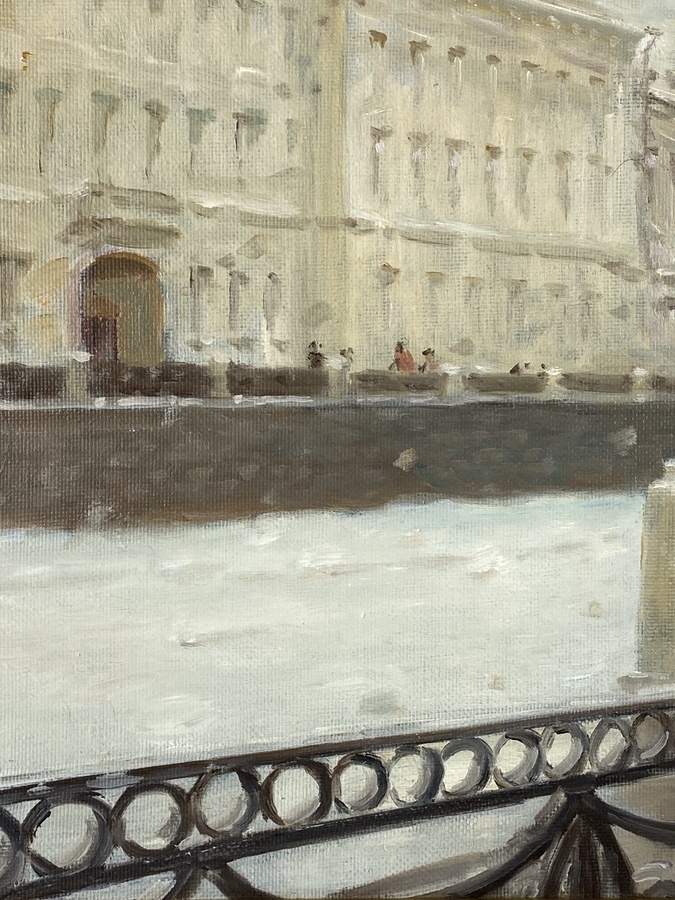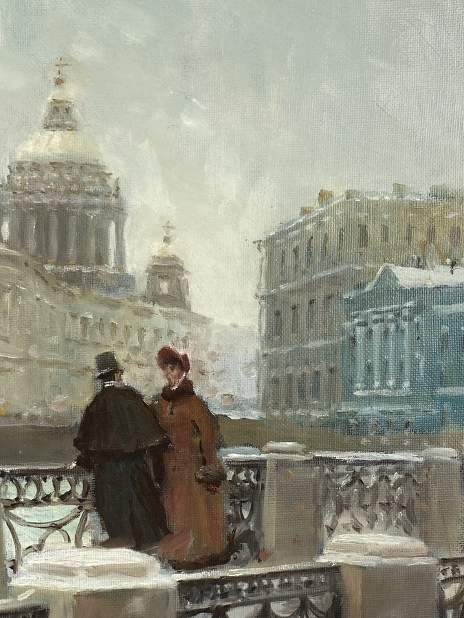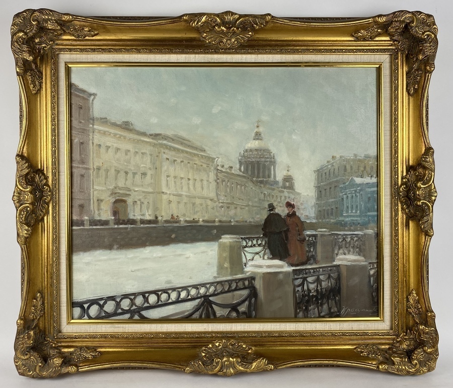 Schilderij, olieverf op doek, met voorstelling van paar in winters St. Petersburg aan de Moyka rivier met op de achtergrond de Izaäkkathedraal. Rechtsonder gesigneerd Kpacynui (Krasulin Valery, 1947) Verso vermelding naam van de schilder en de titel Zima (winter) Tweede helft 20e eeuw. |