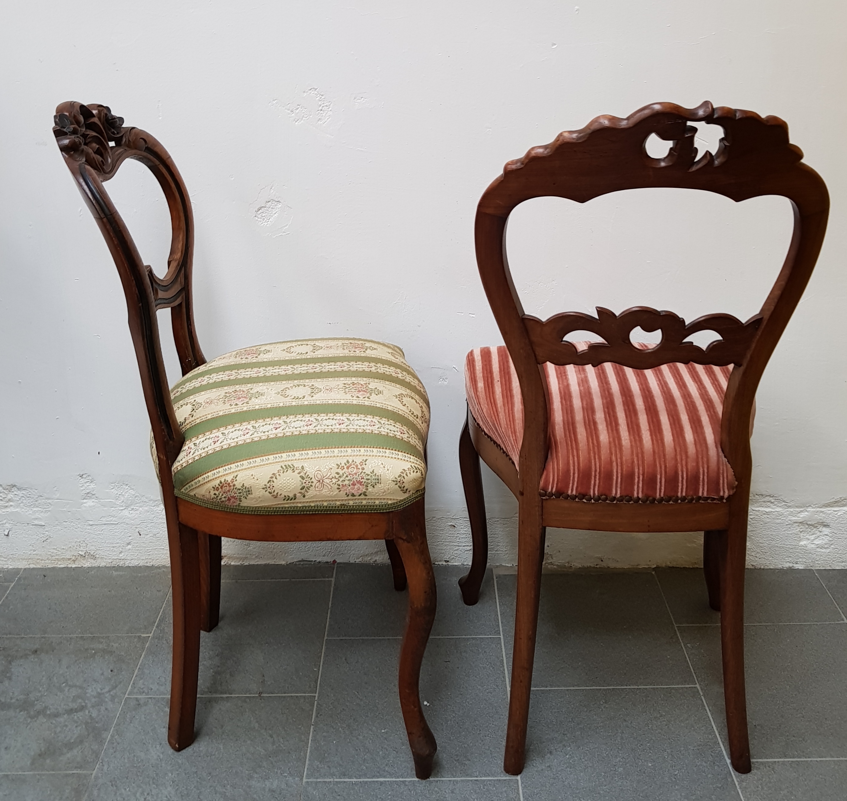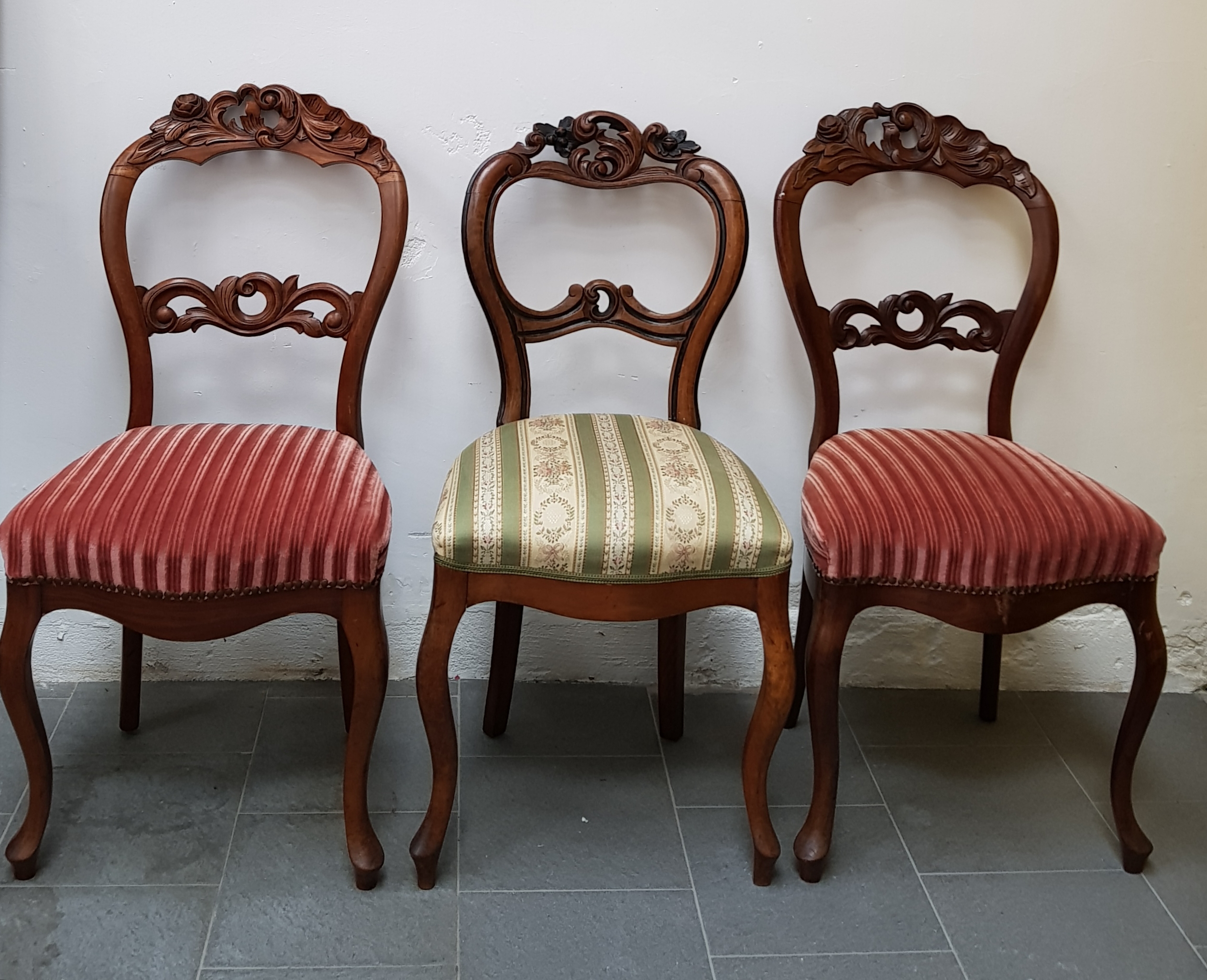 Drie ballonrug stoelen met stoffen bekleding, circa 1900. |