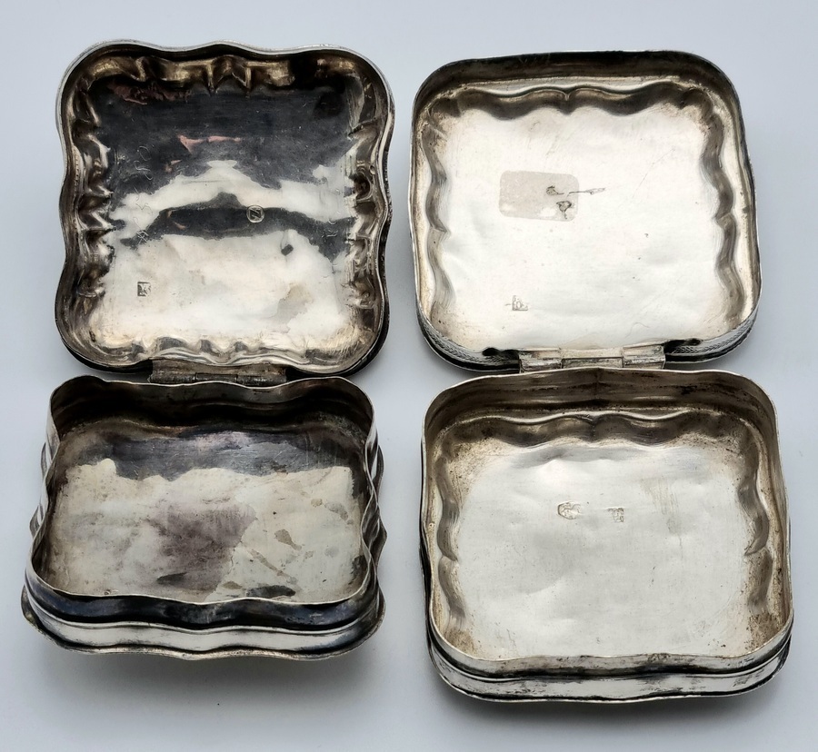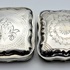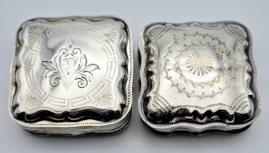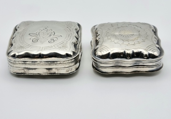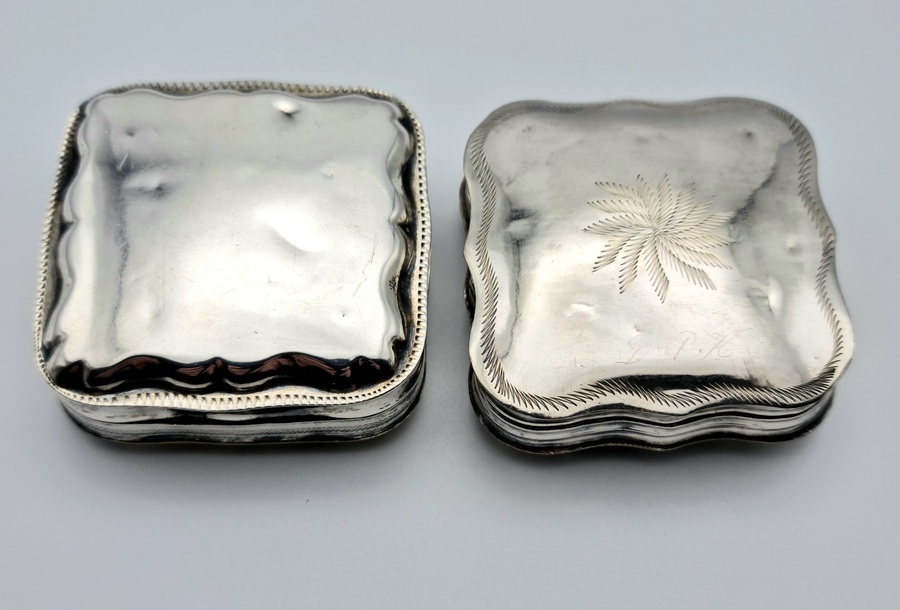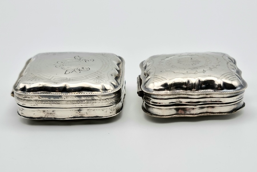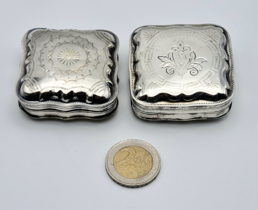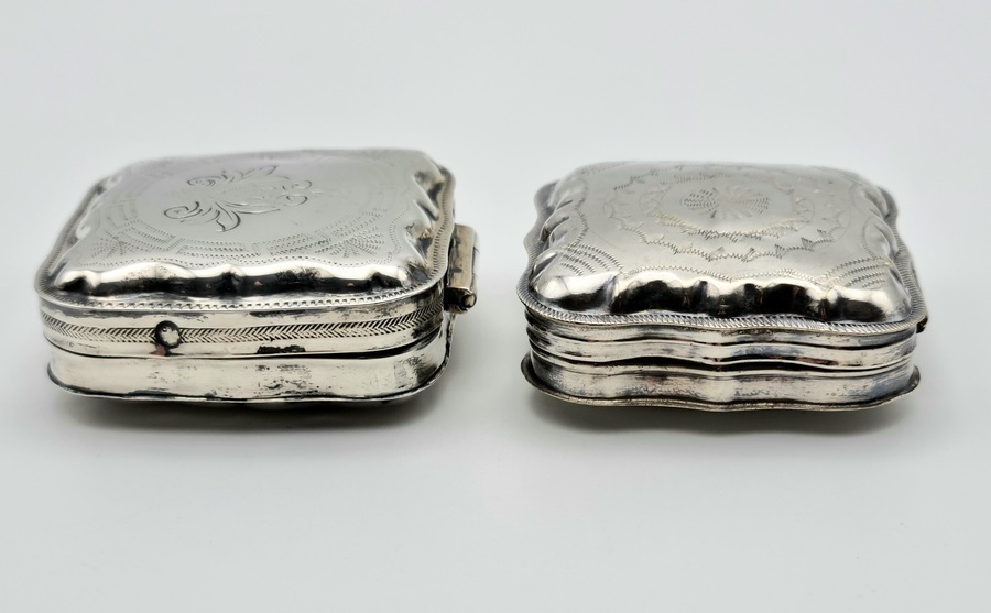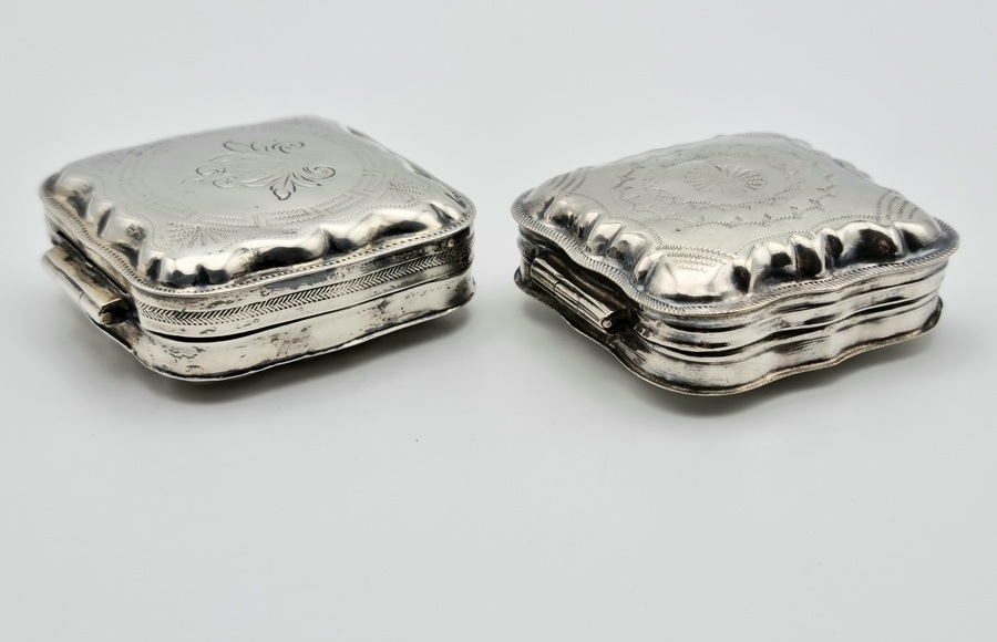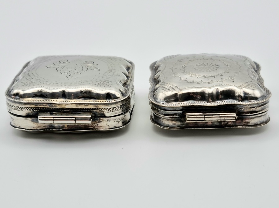 Twee antieke zilveren pillen/pepermunt doosjes. A. met blanco achterzijde, gemerkt minerva, lopende leeuw 2, jaarletter D (1913) en onleesbaar meesterteken. B. met bewerkte achterzijde, gemerkt minerva, lopende leeuw 2, jaarletter Z (1859) en onleesbaar meesterteken. |