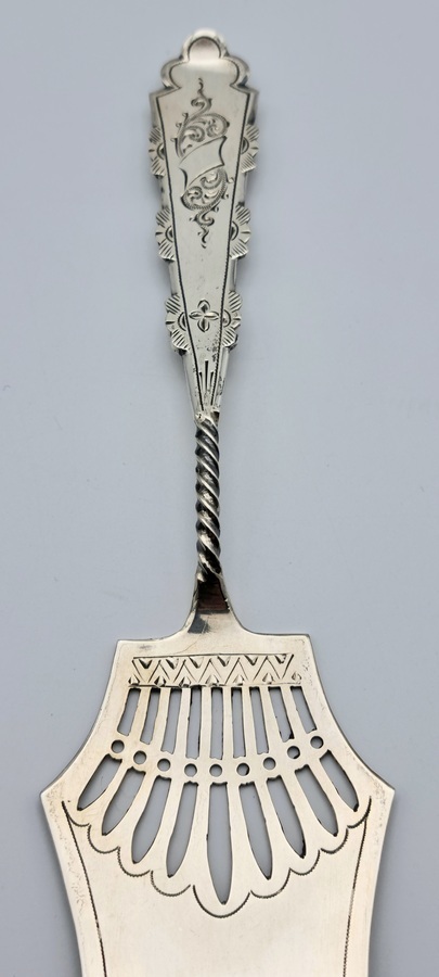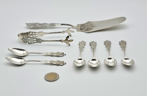 Lot zilver bestek bestaande uit zes theelepel, klontjestang en taartschep, gemerkt. |