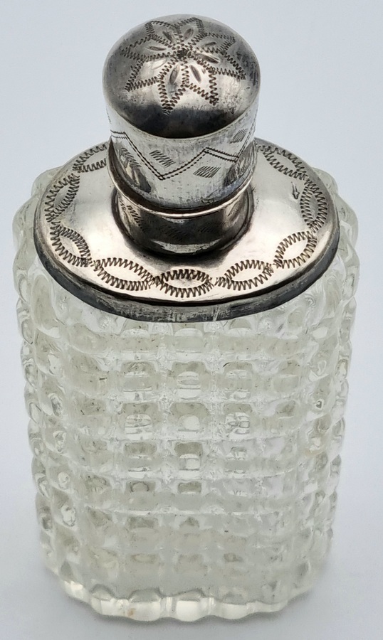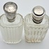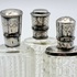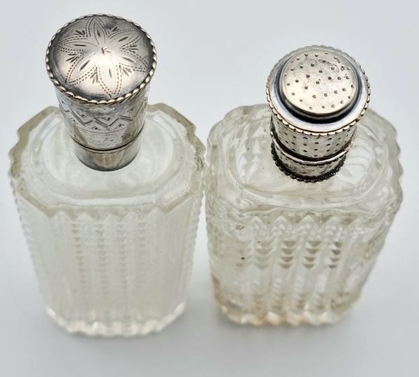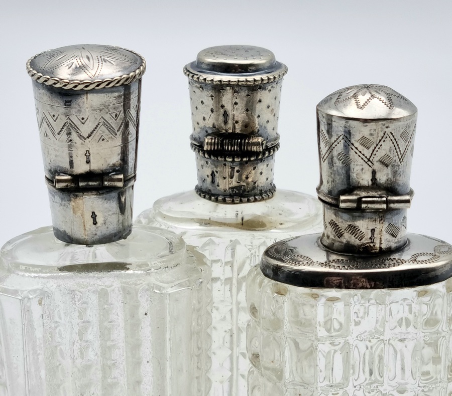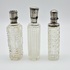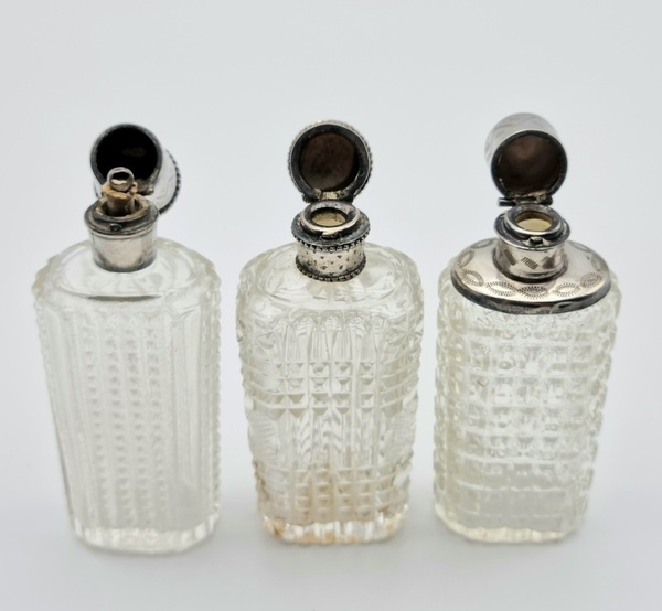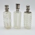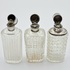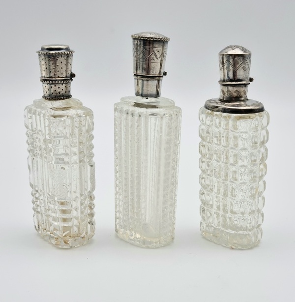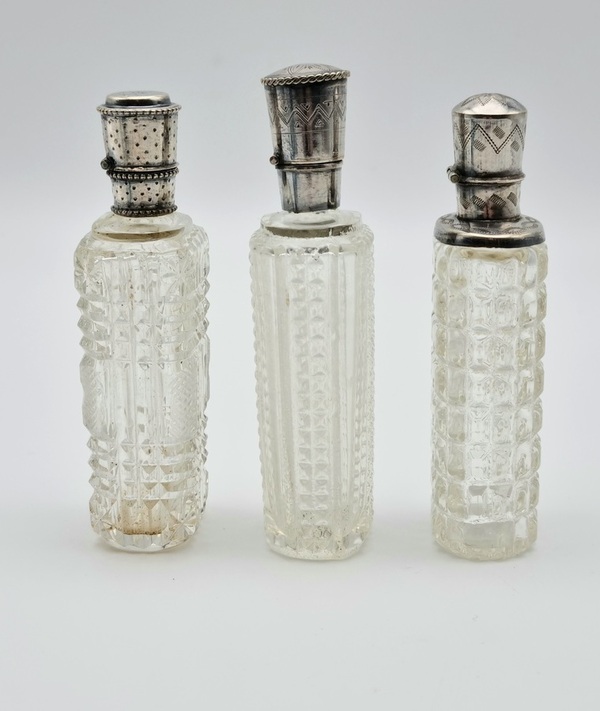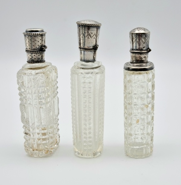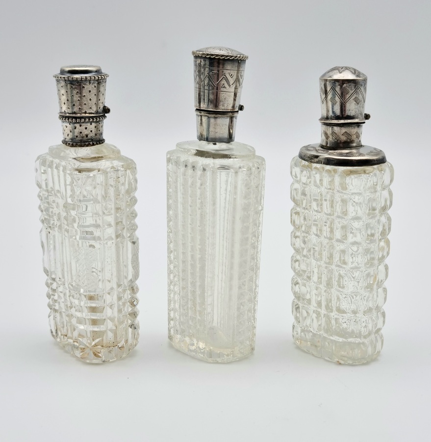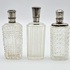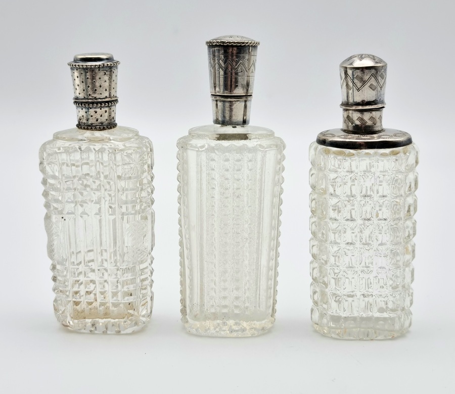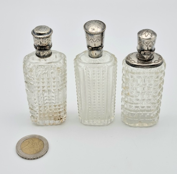 Drie verschillende bewerkte kristallen parfumflesjes met zilveren dop, circa 1900. |