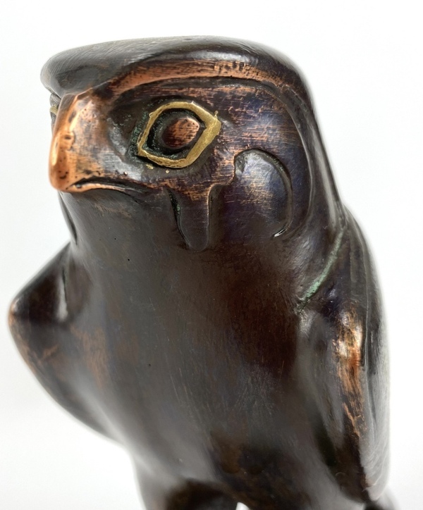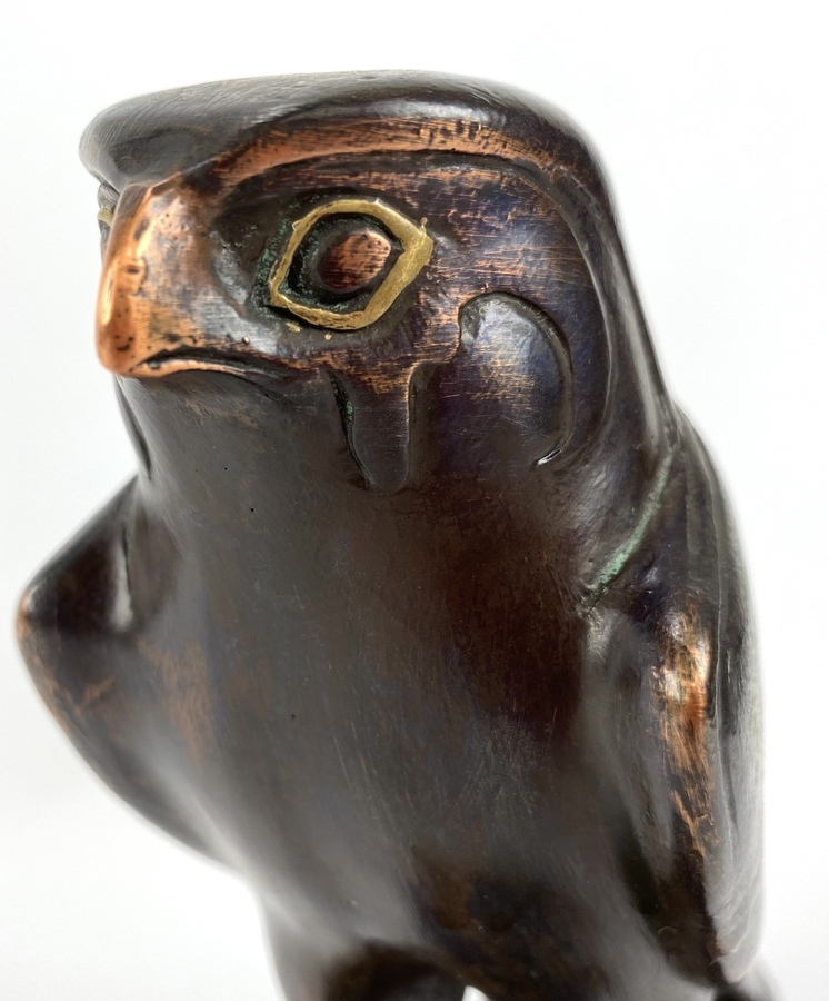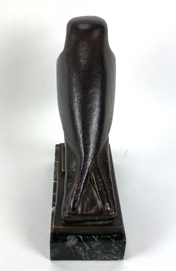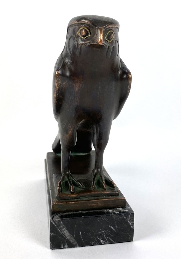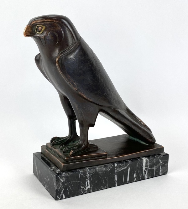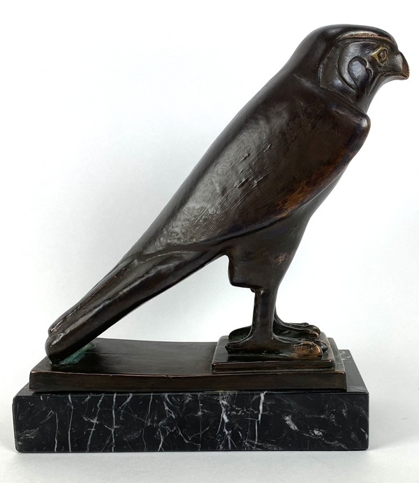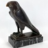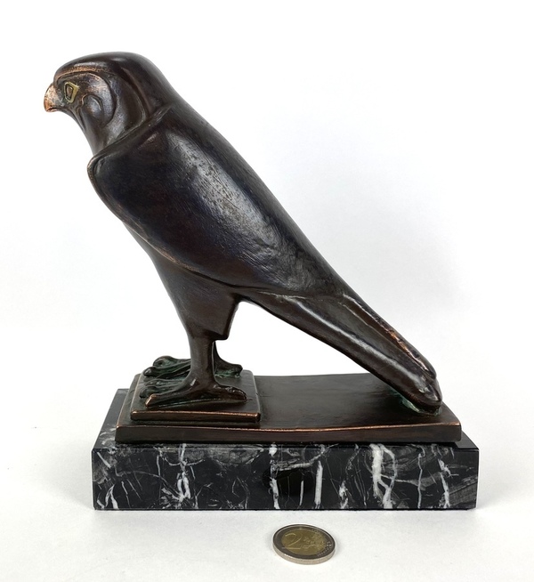 Egyptische stijl beeld van een Horus valk, polystone met een laagje brons op marmeren basis, 20e eeuw. |