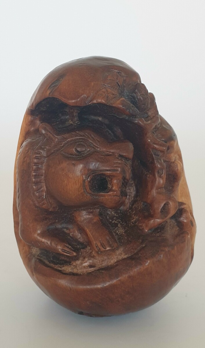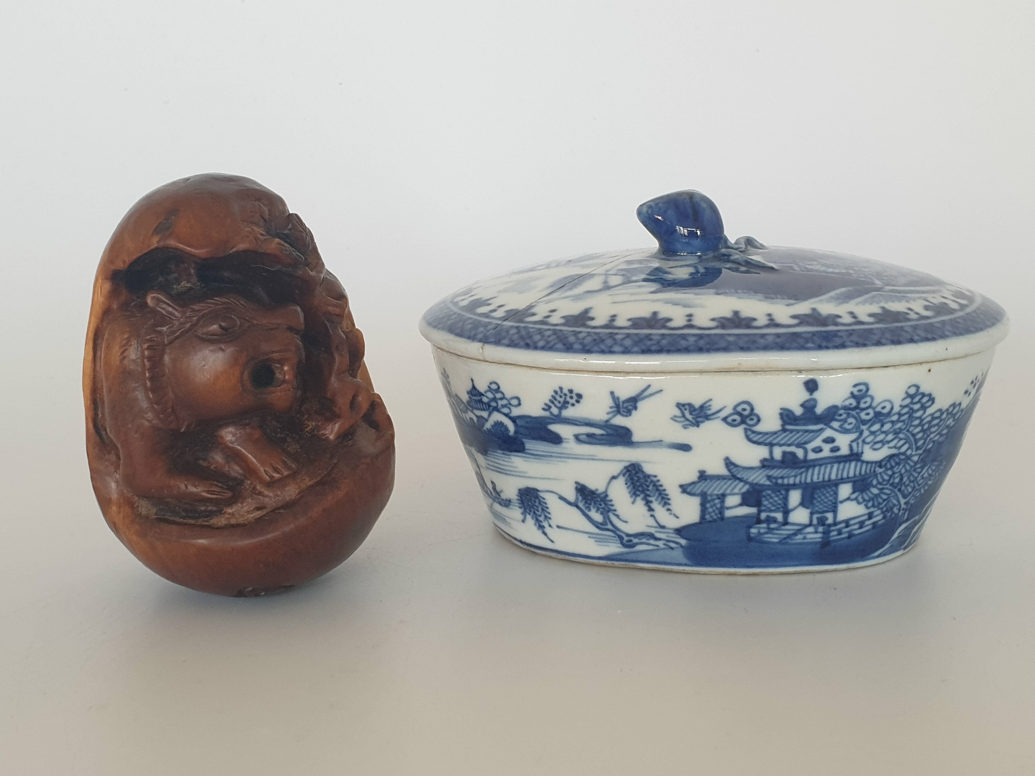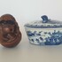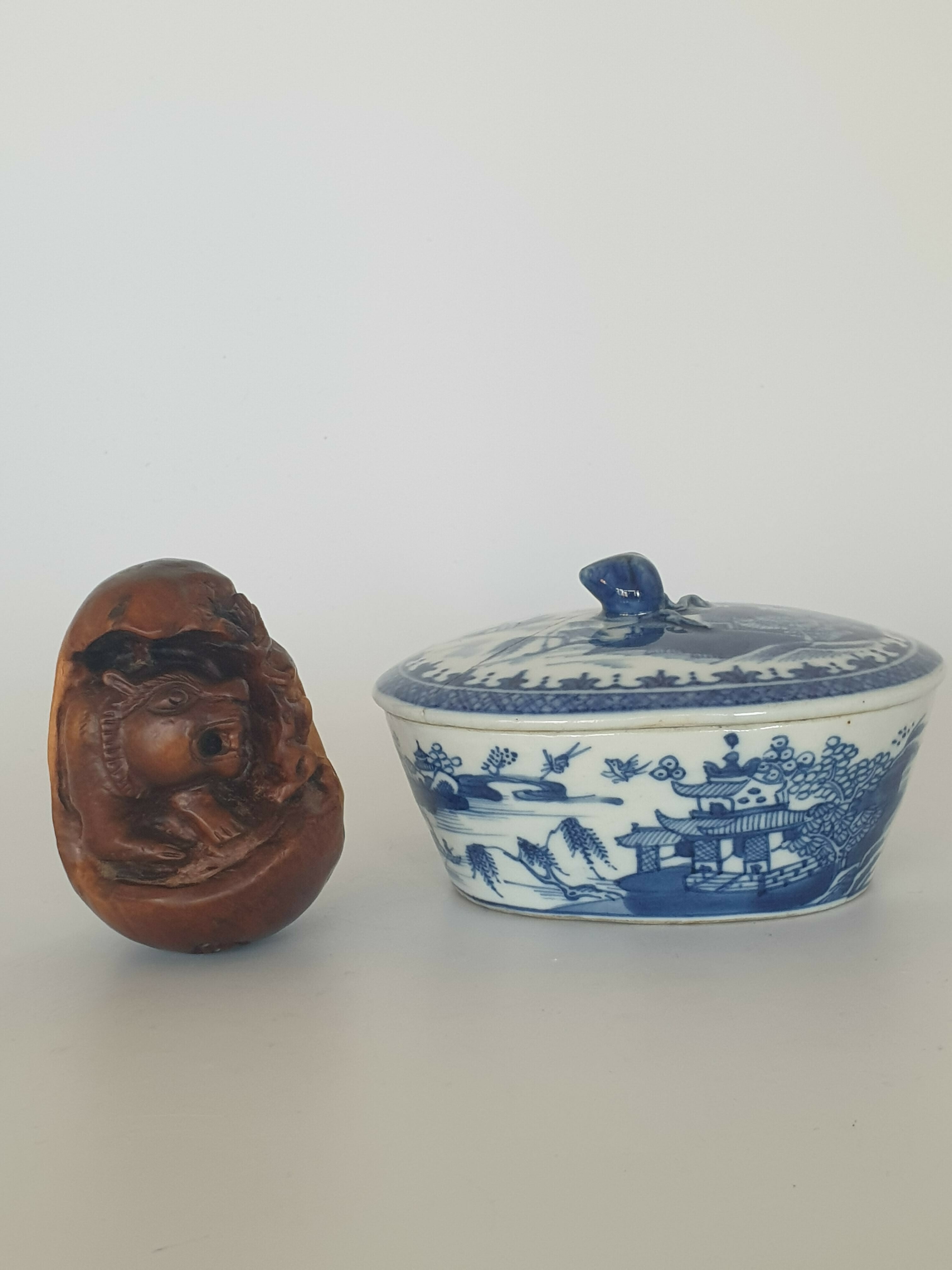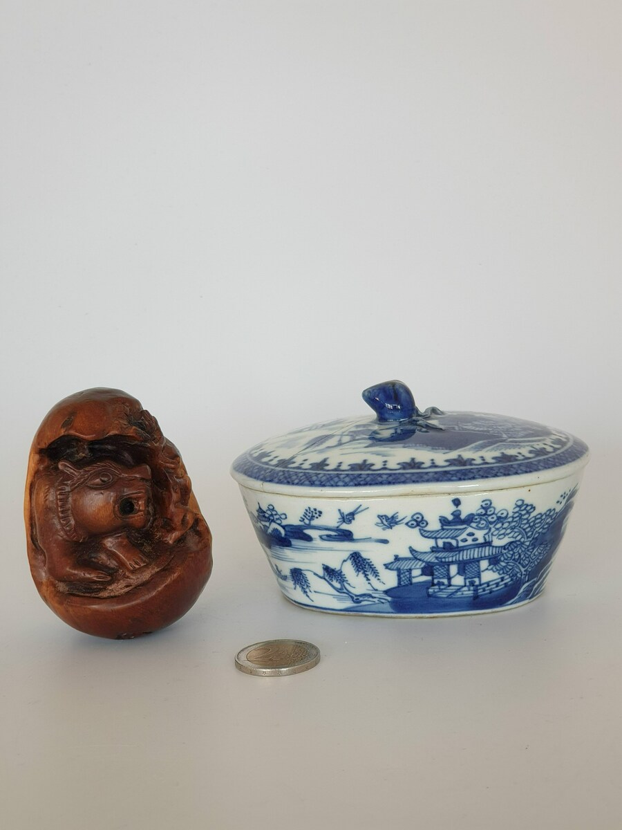 Chinese botervloot uit de 18e eeuw daarbij een gesneden voorstelling in hout, China 20e eeuw. |