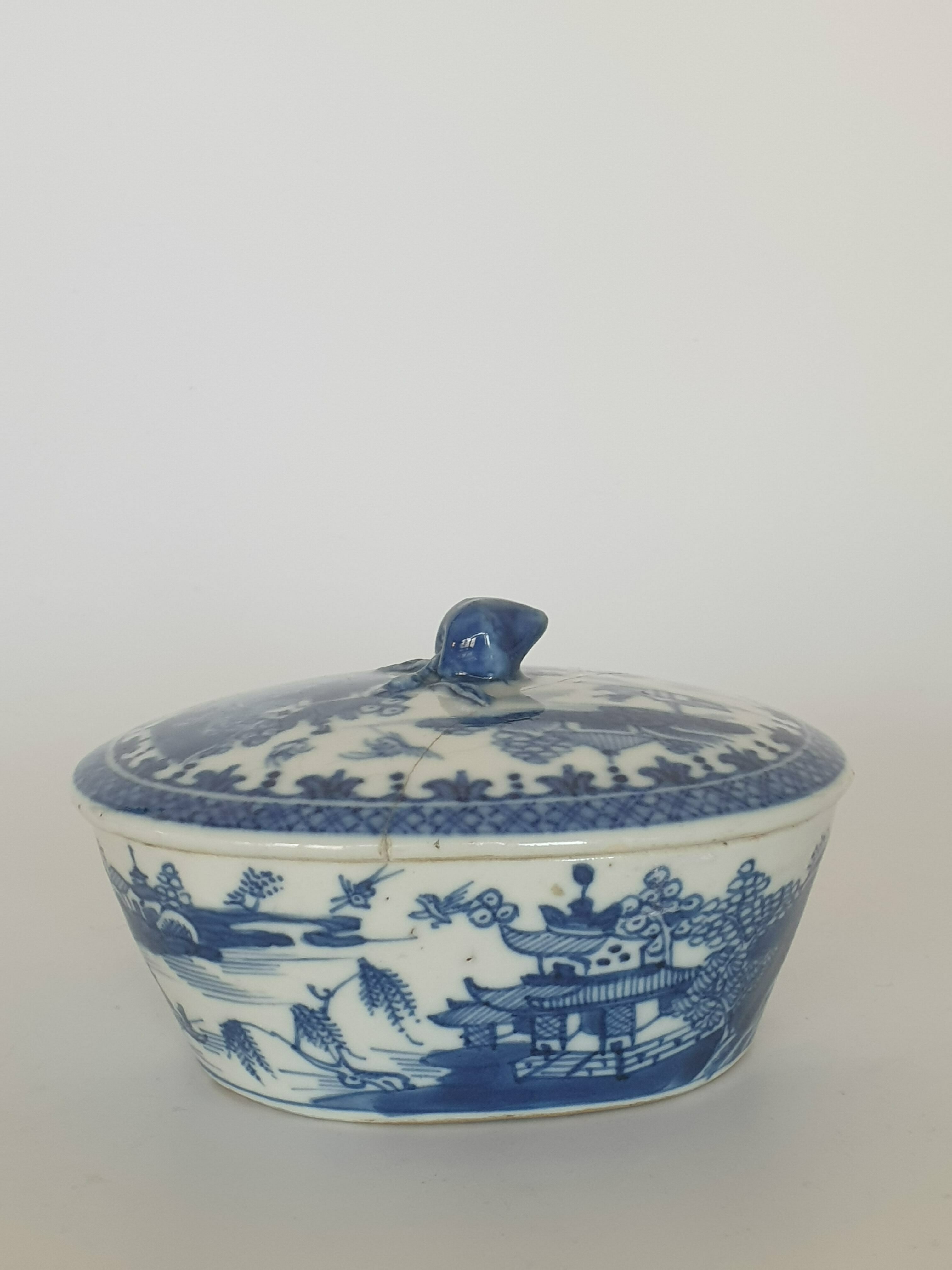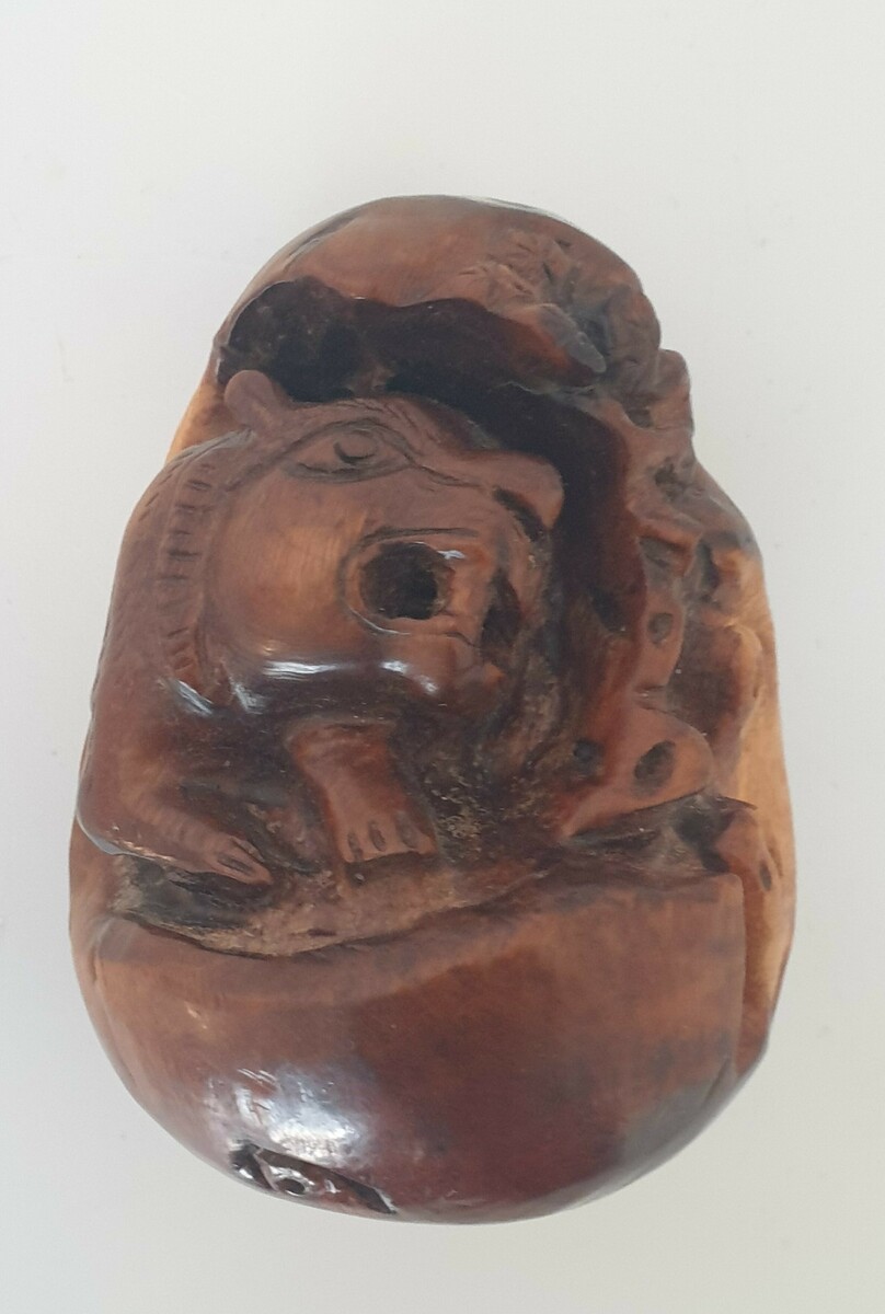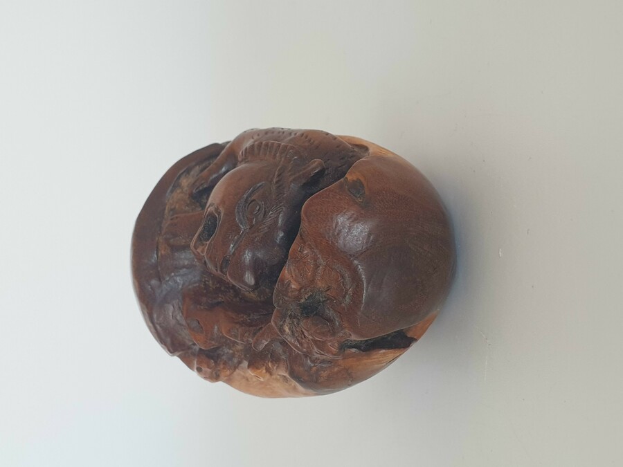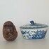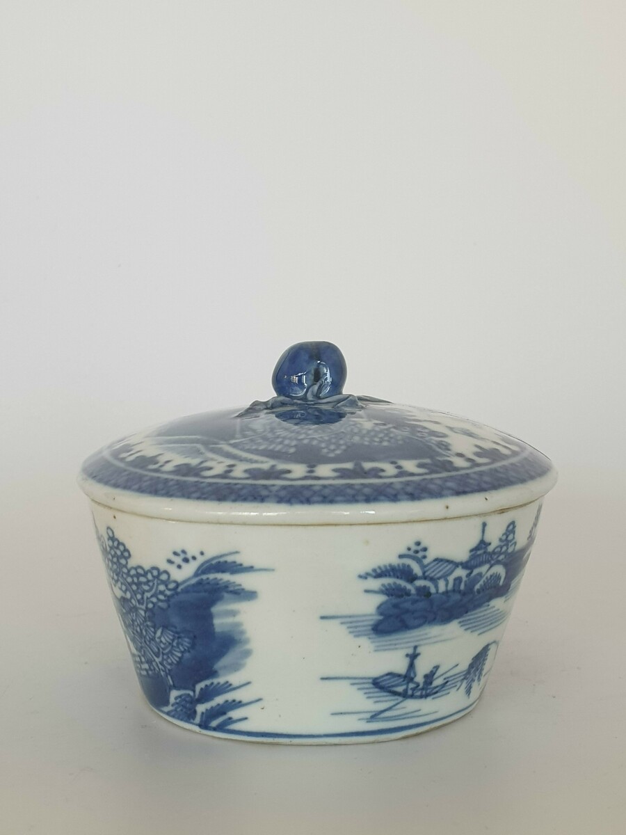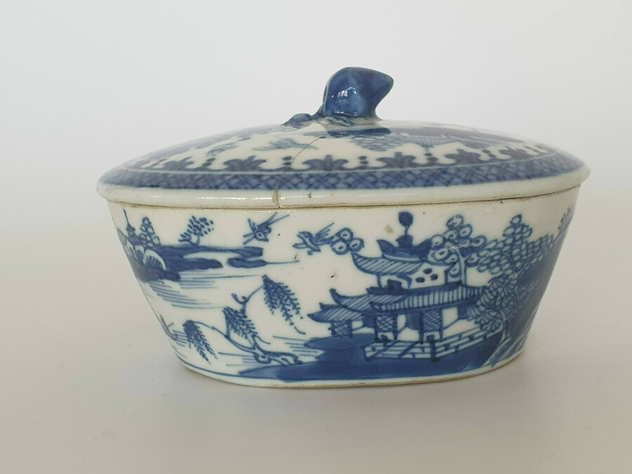 Chinese botervloot uit de 18e eeuw daarbij een gesneden voorstelling in hout, China 20e eeuw. |