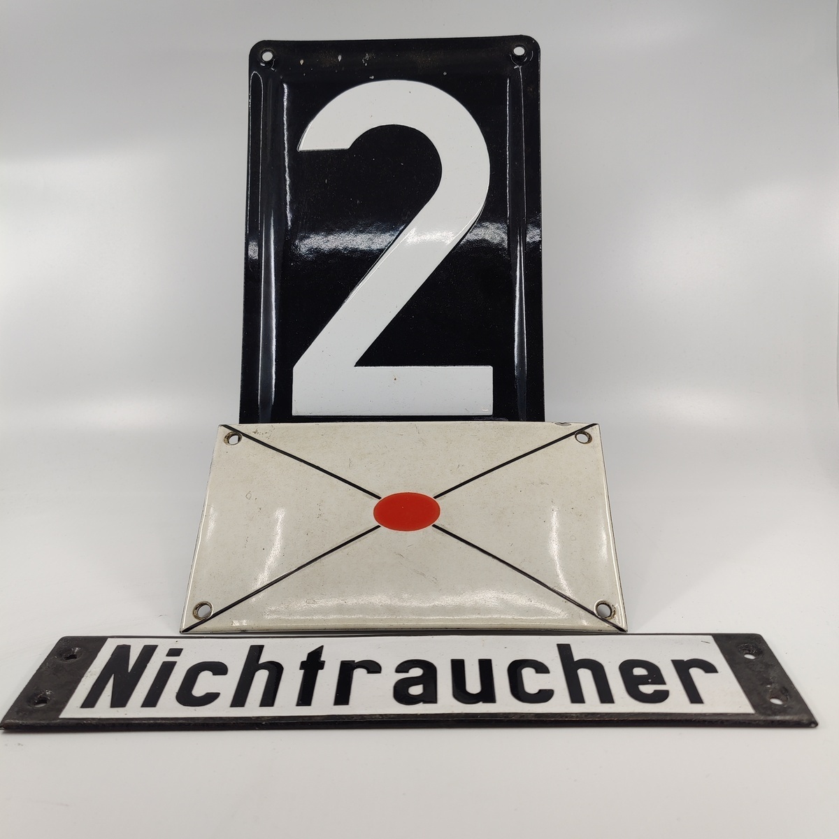 Drie emaille bordjes, Nederland/Duitsland, midden 20e eeuw. |