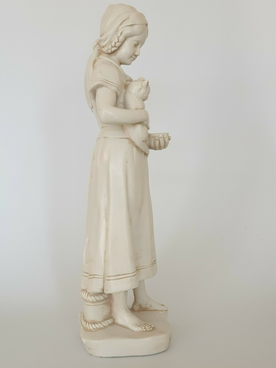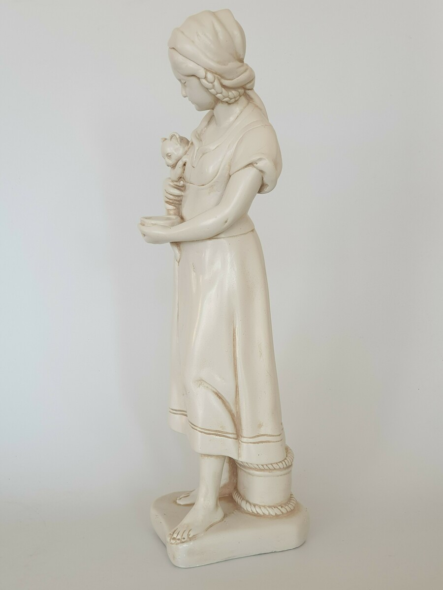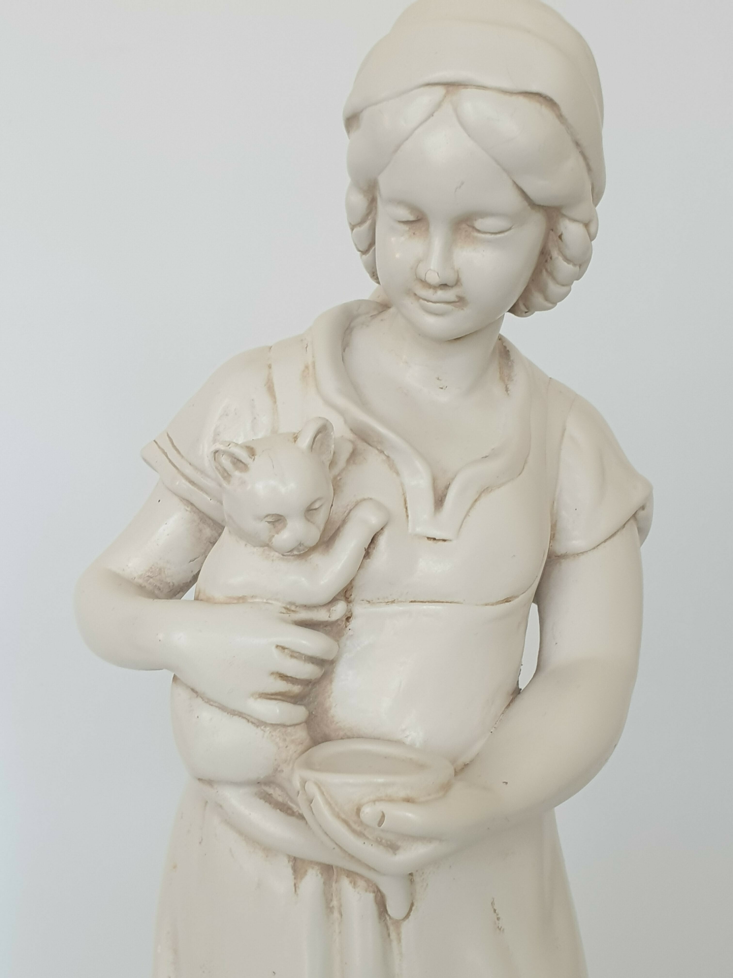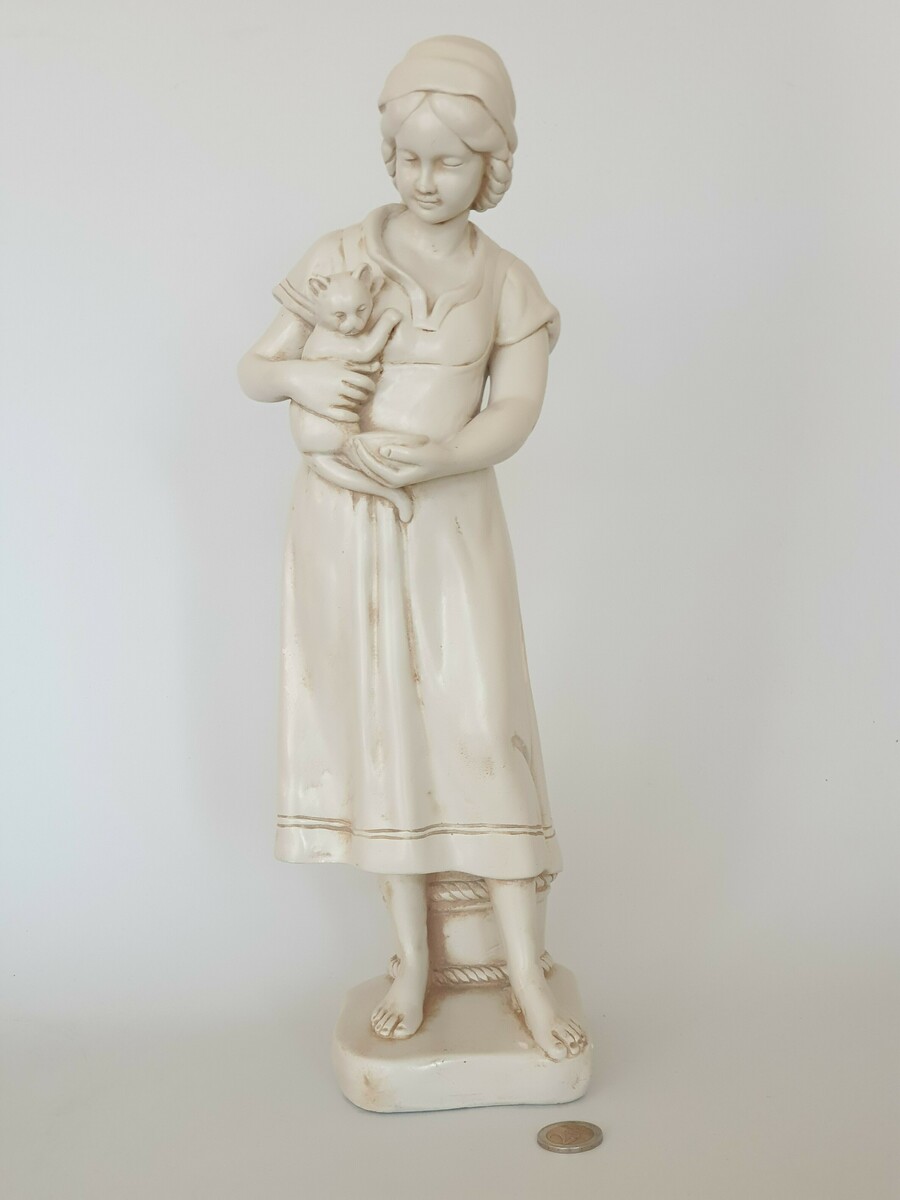 Keramisch beeld, vrouw met kat, gemerkt aan de achterzijde. Eerste helft 20e eeuw. |