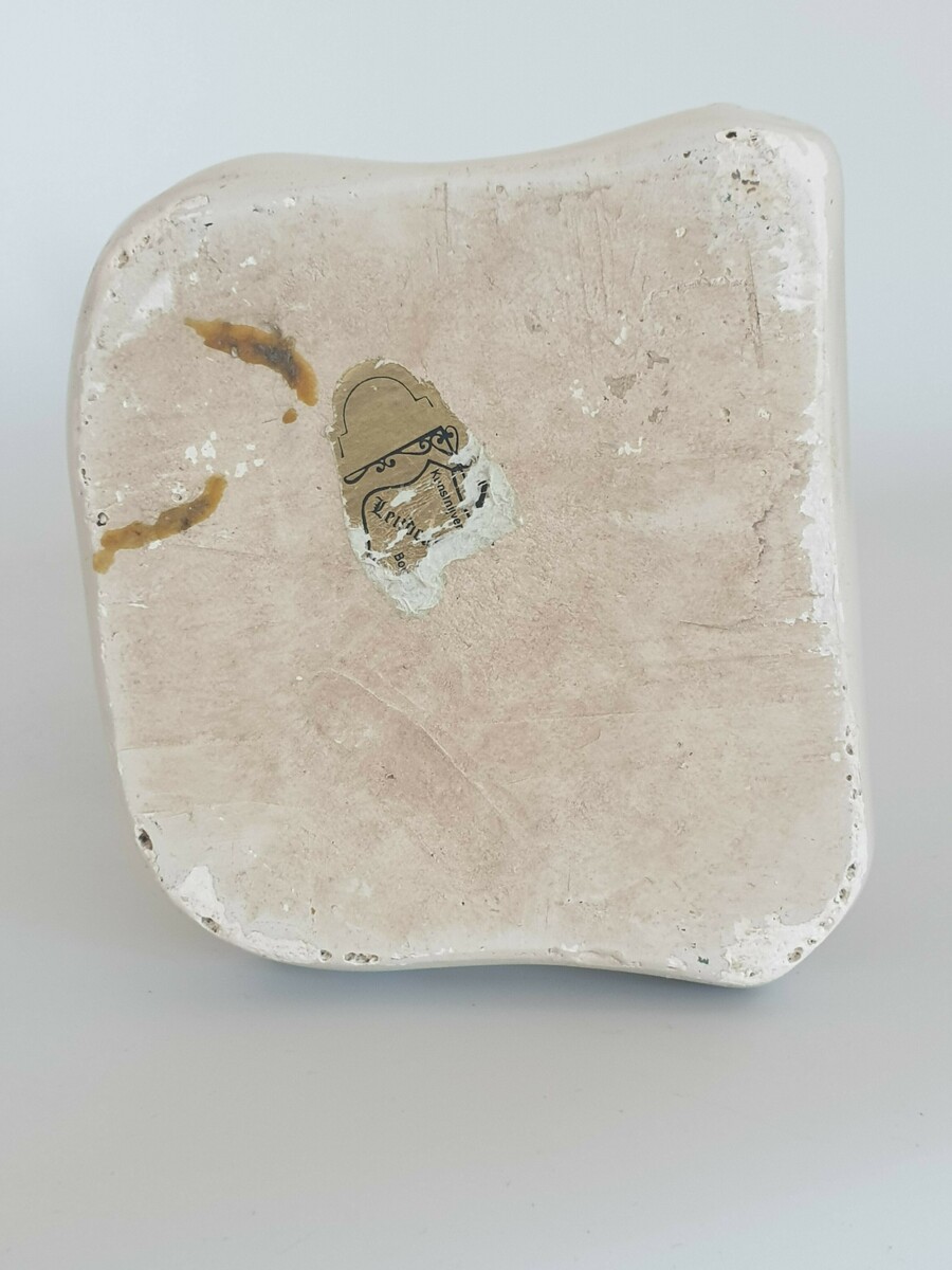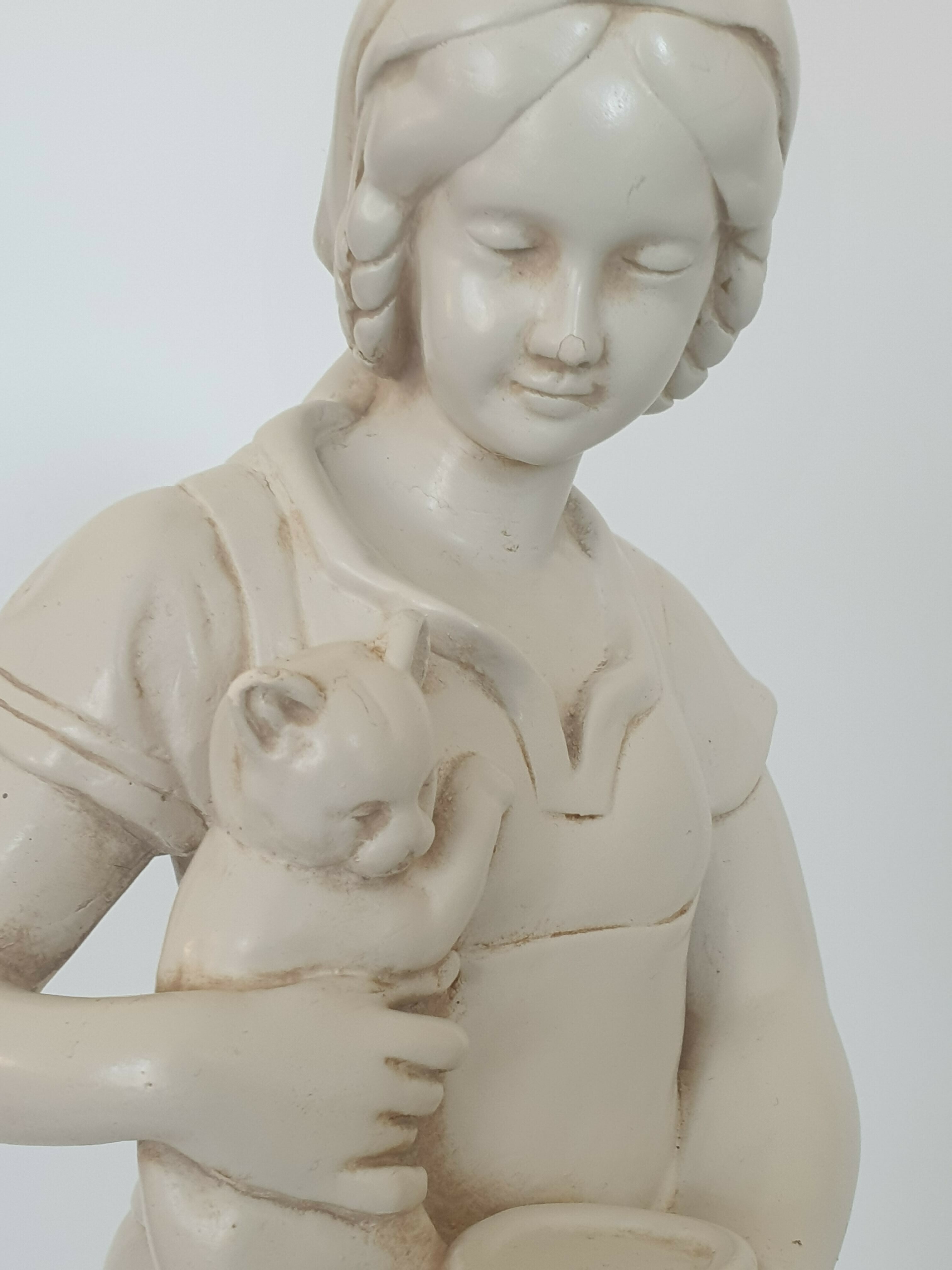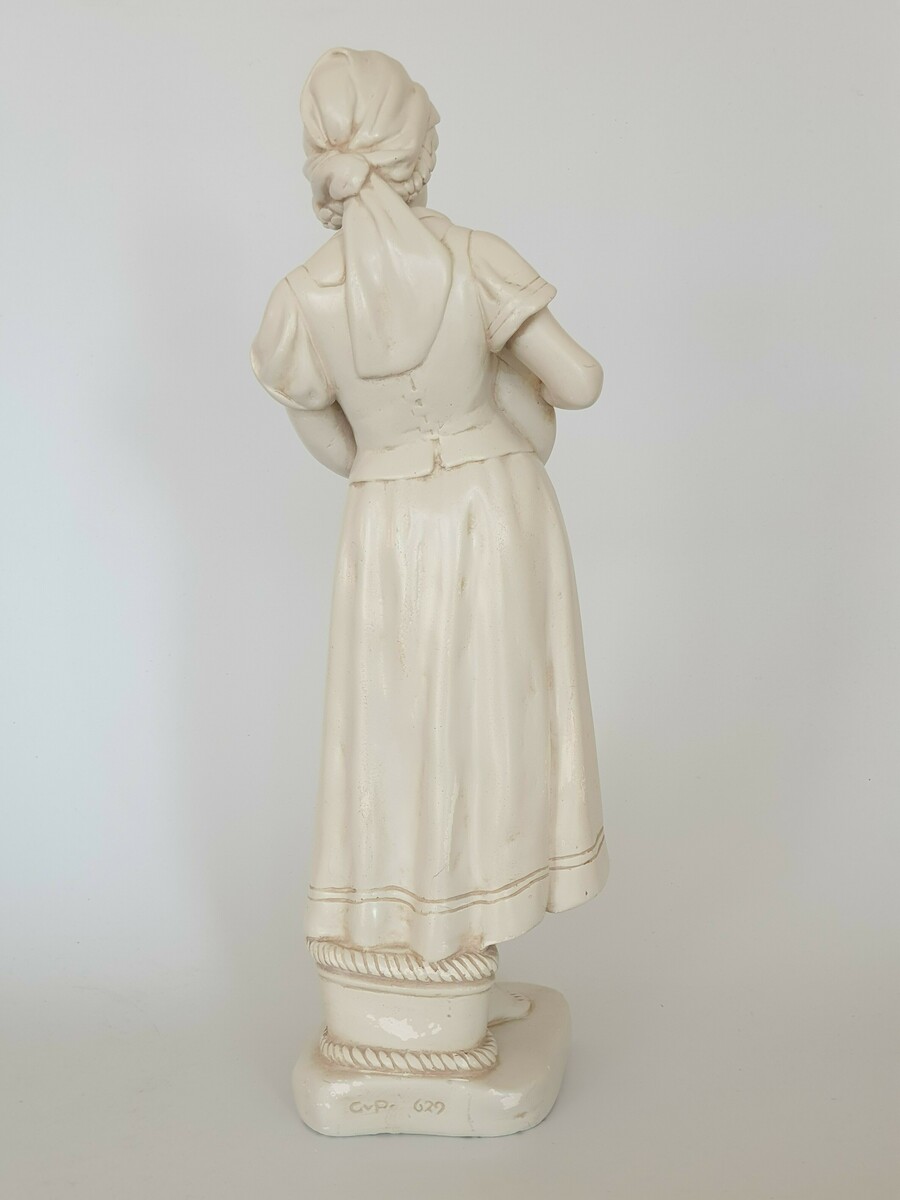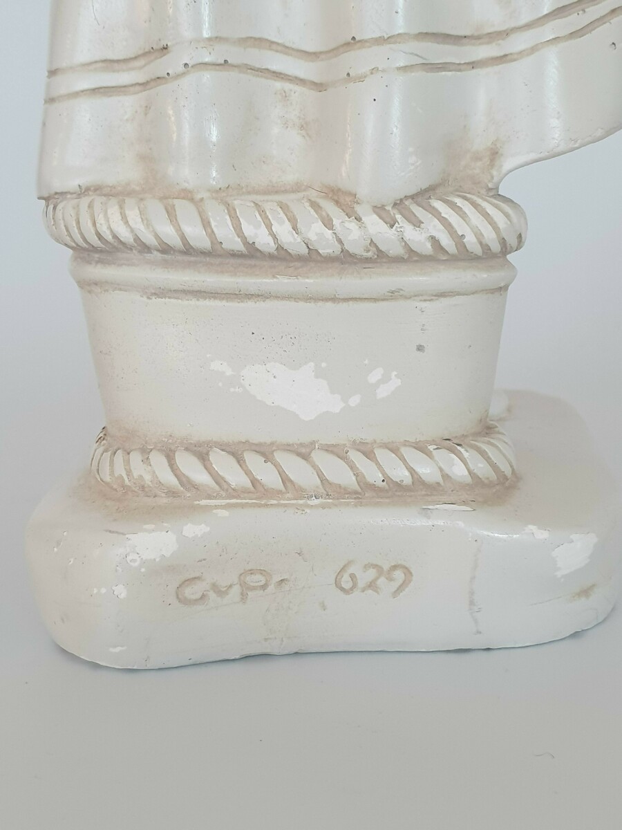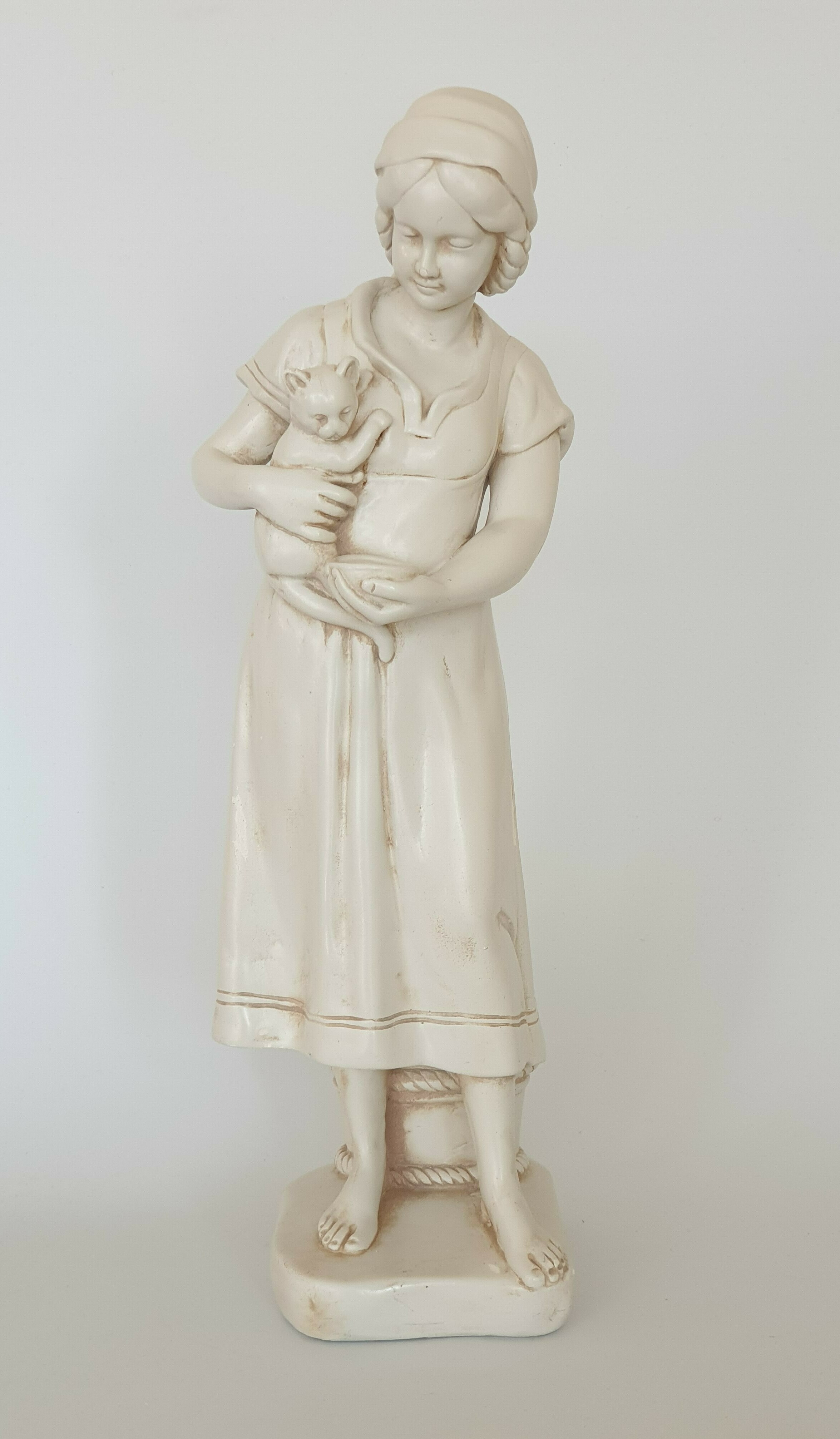 Keramisch beeld, vrouw met kat, gemerkt aan de achterzijde. Eerste helft 20e eeuw. |