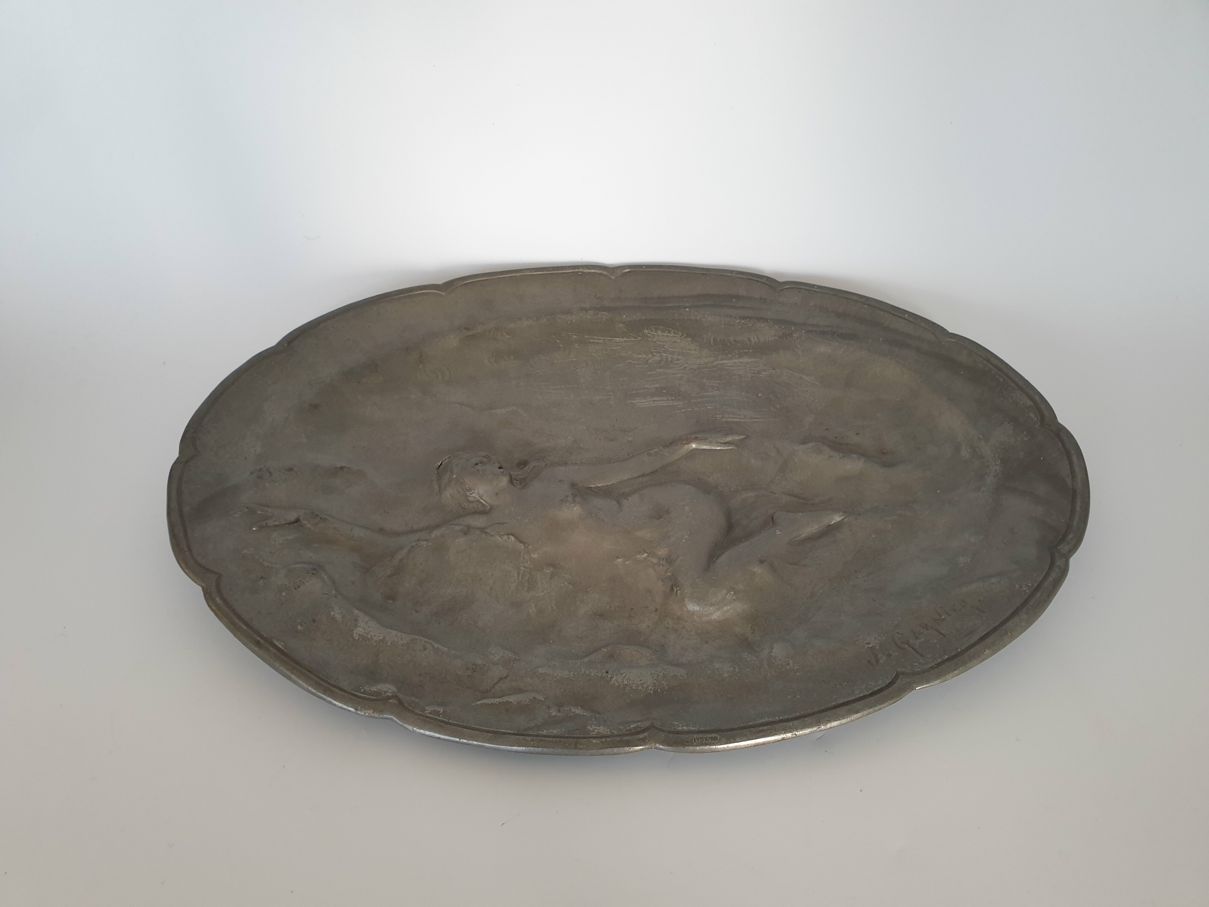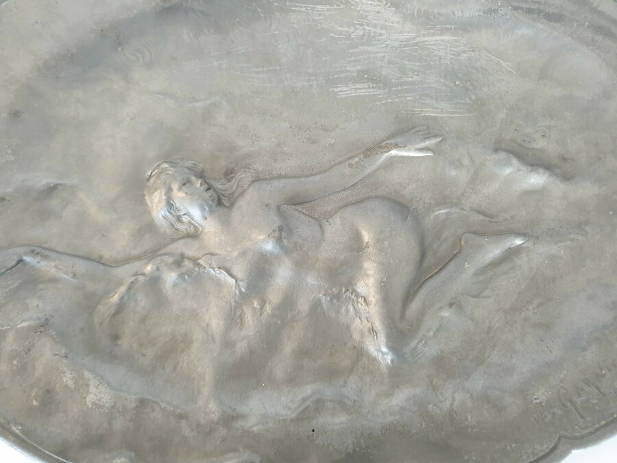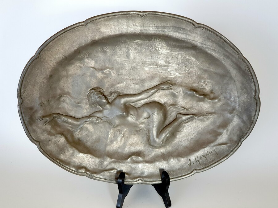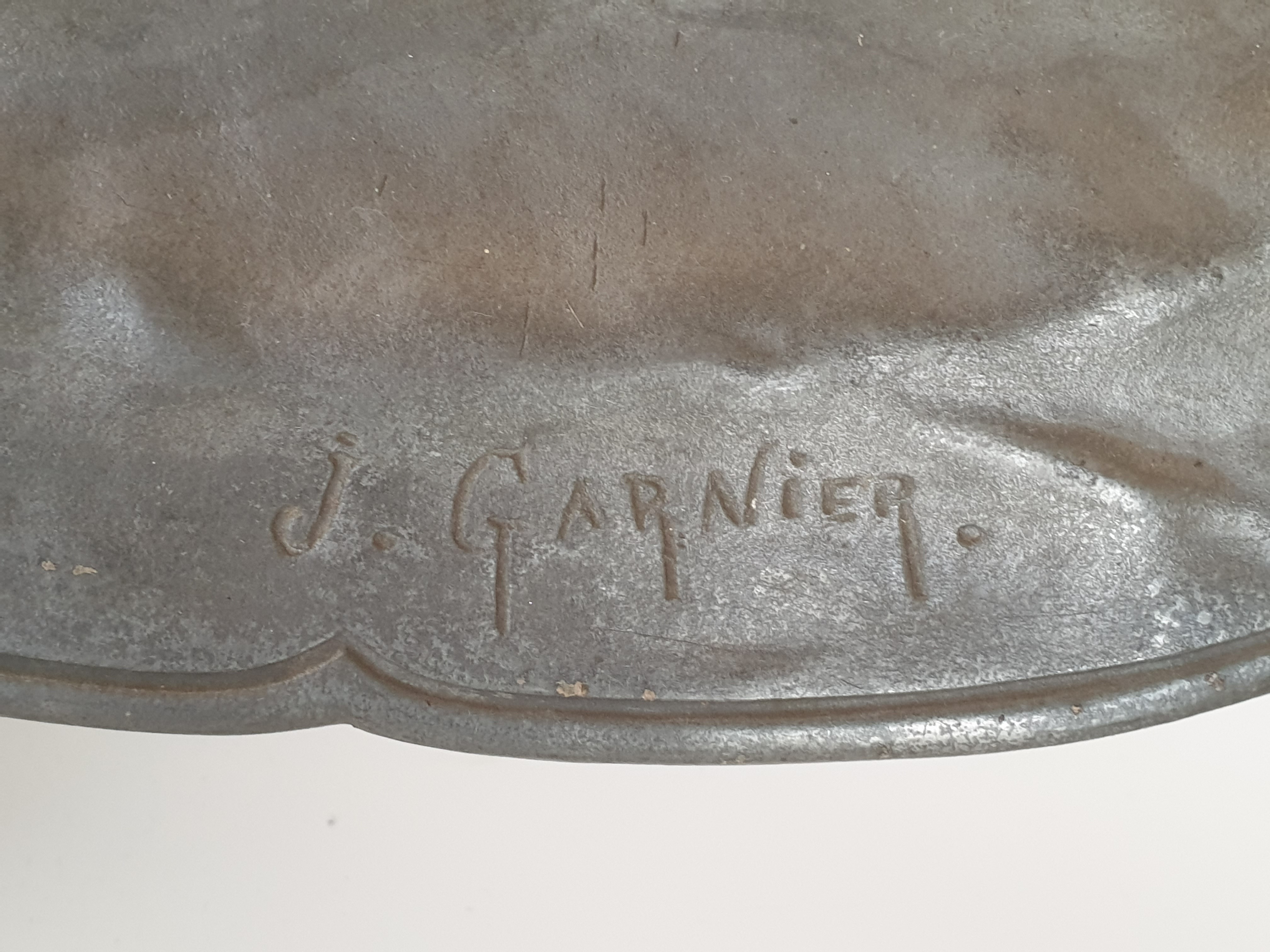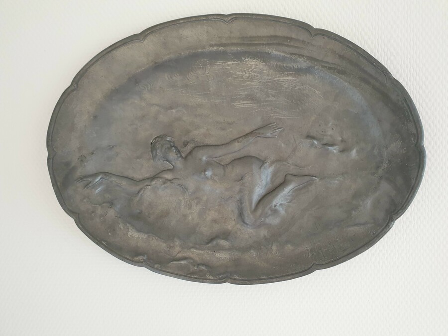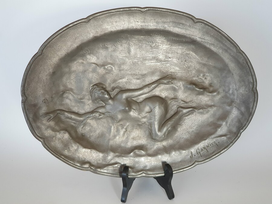 Groot tinnen bord, Art Nouveau, J. Garnier. Gesigneerd circa 1920. |