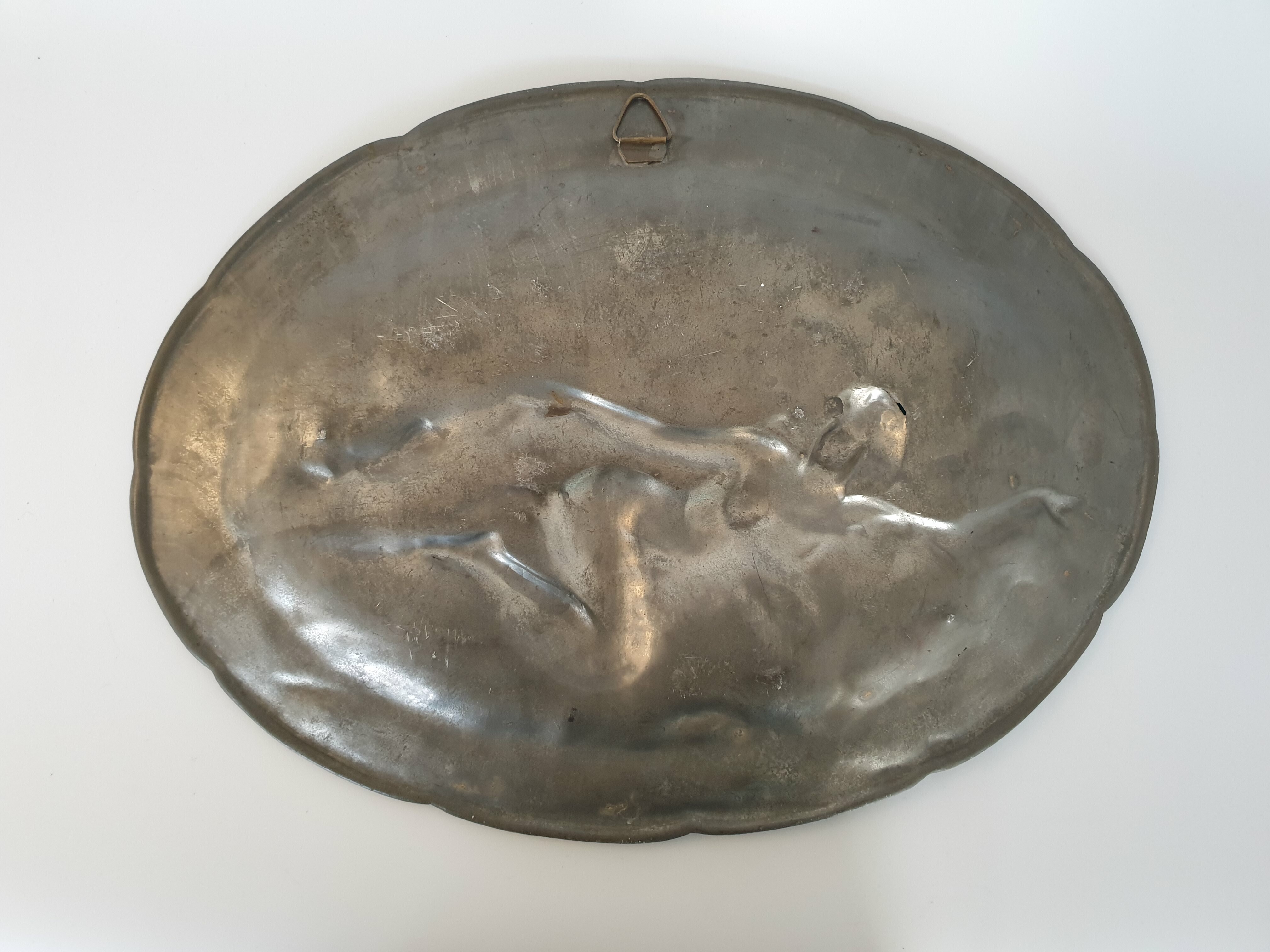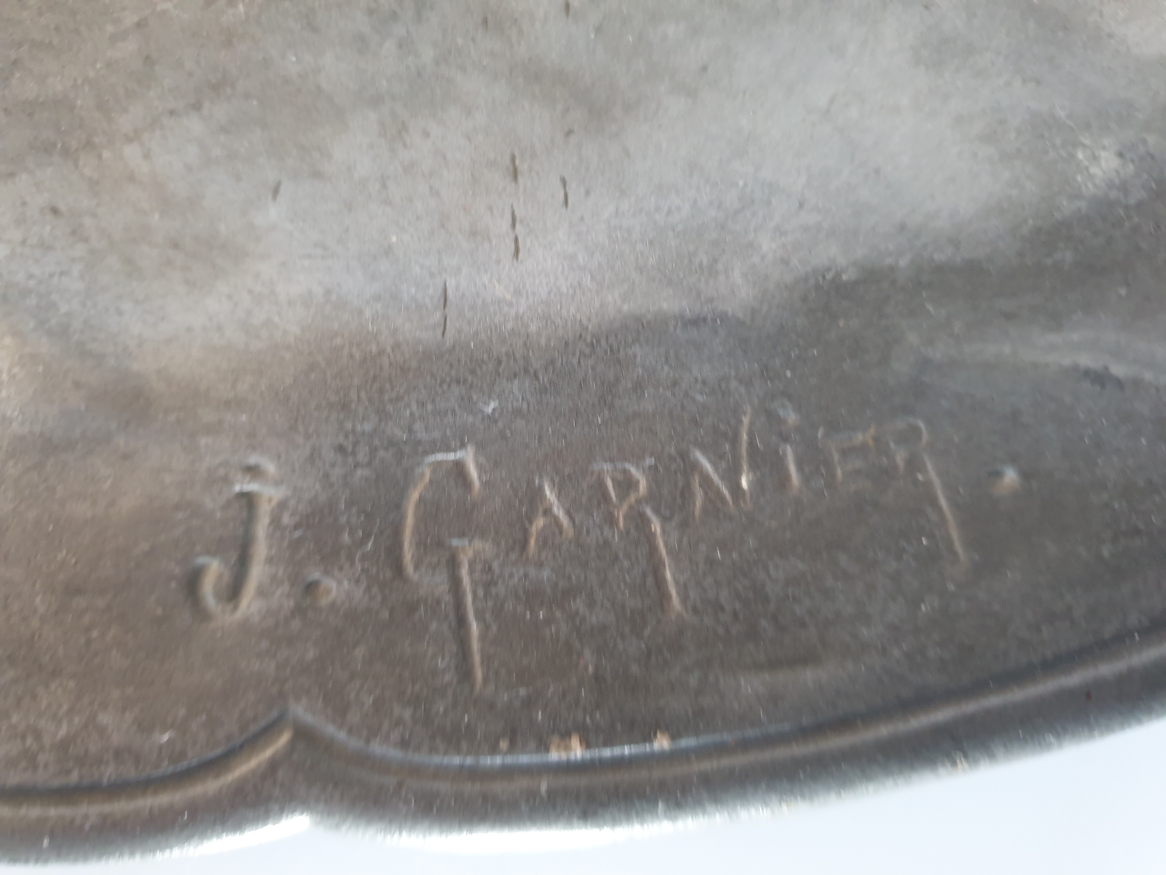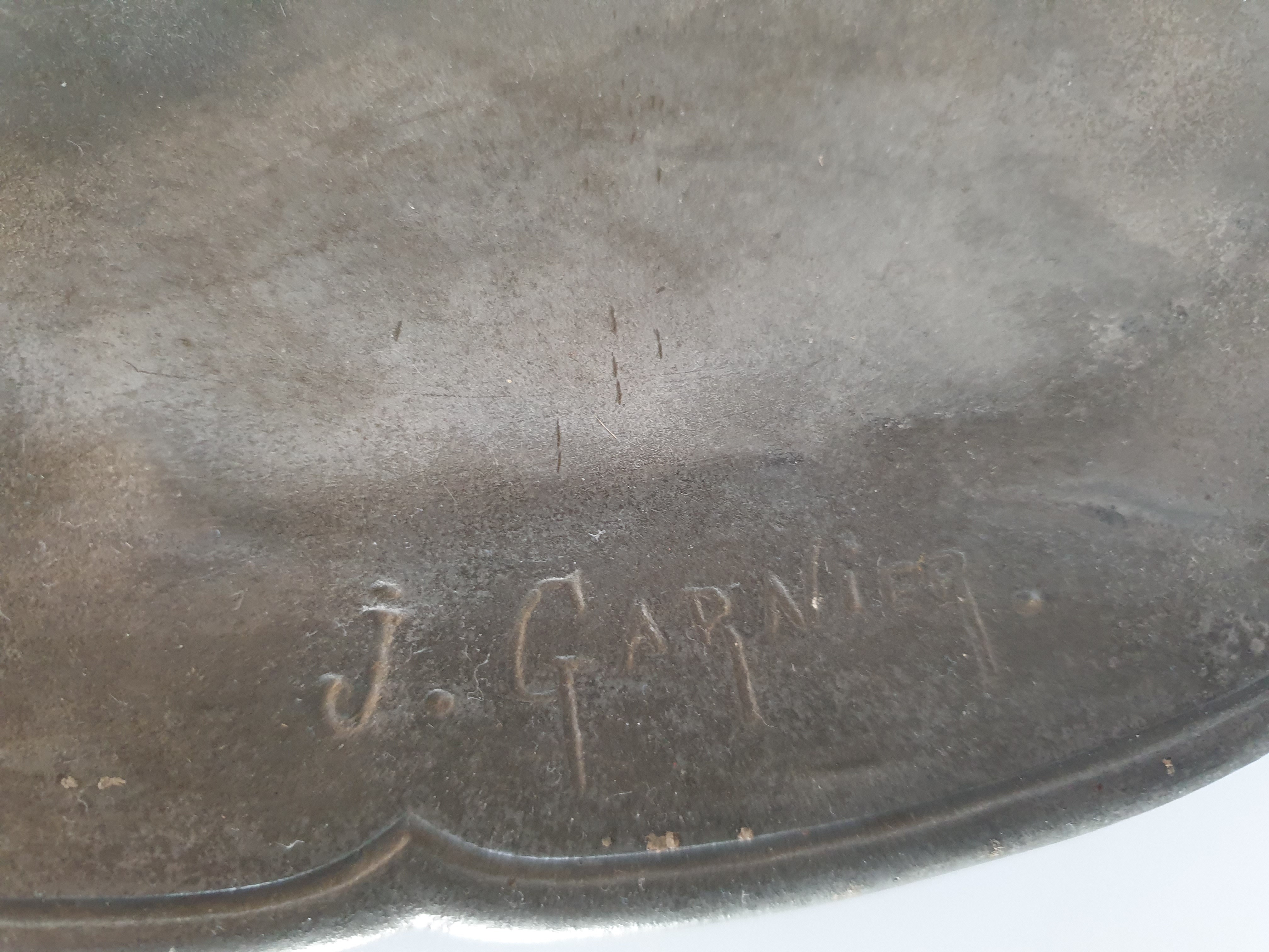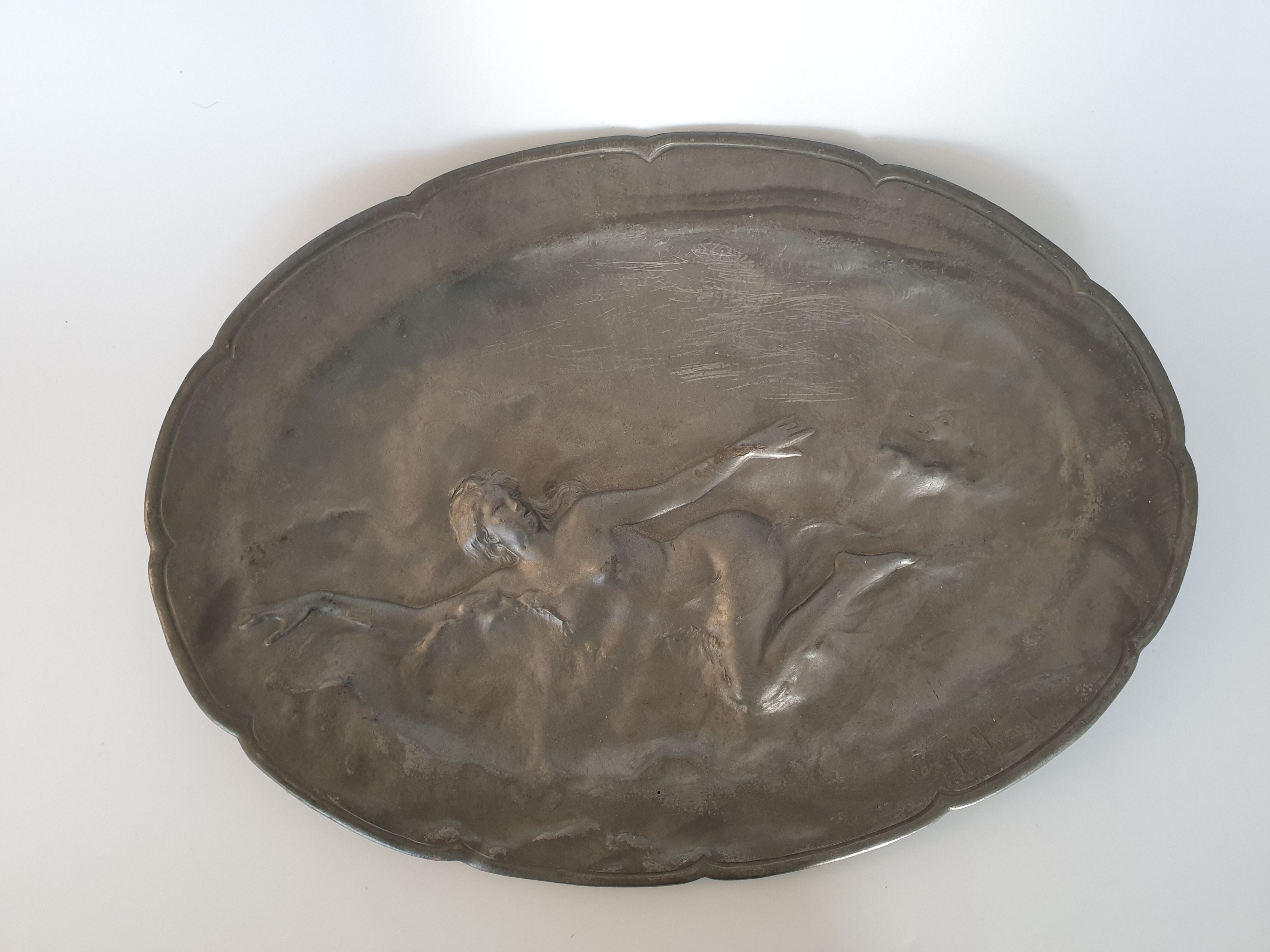 Groot tinnen bord, Art Nouveau, J. Garnier. Gesigneerd circa 1920. |