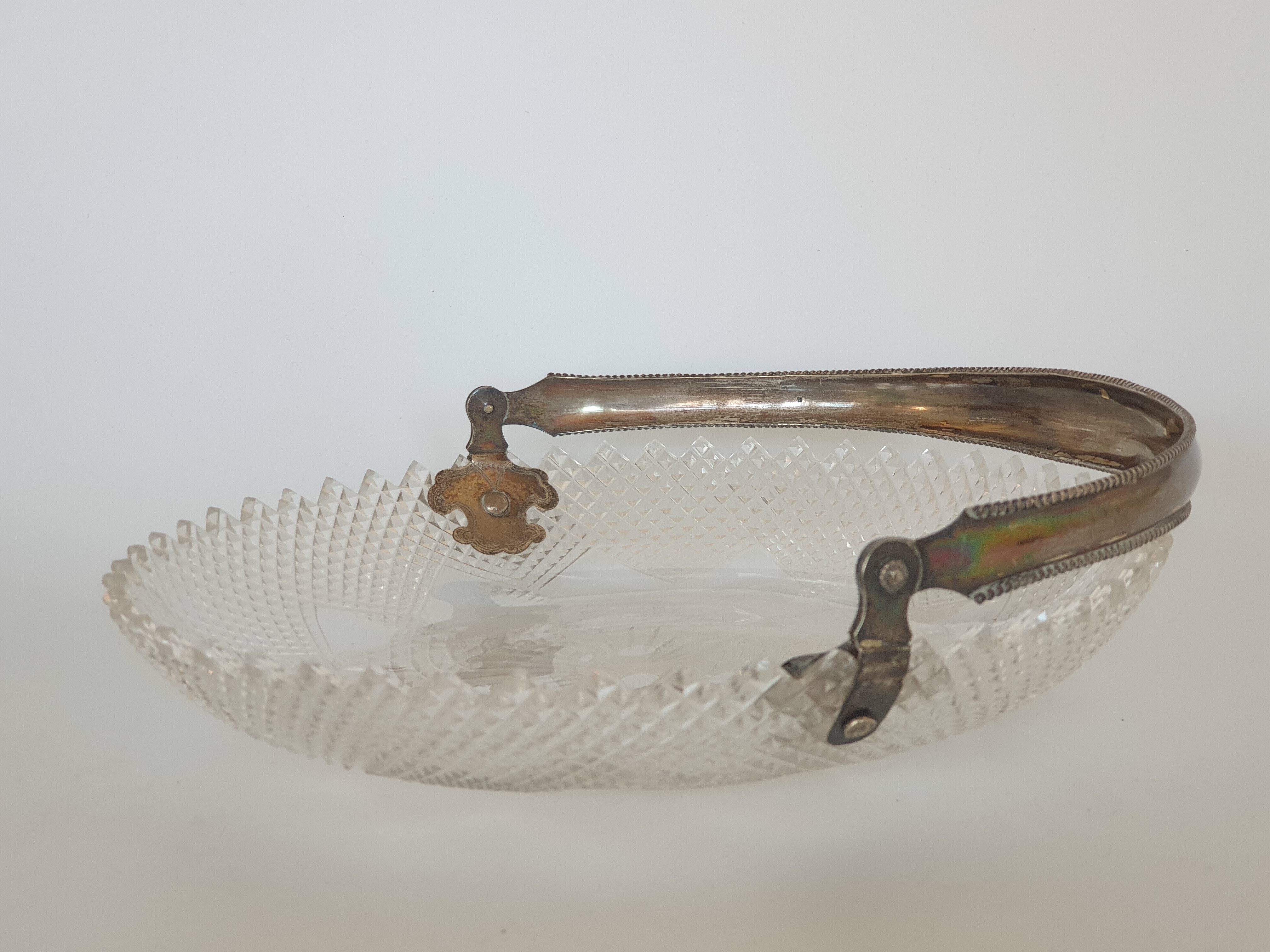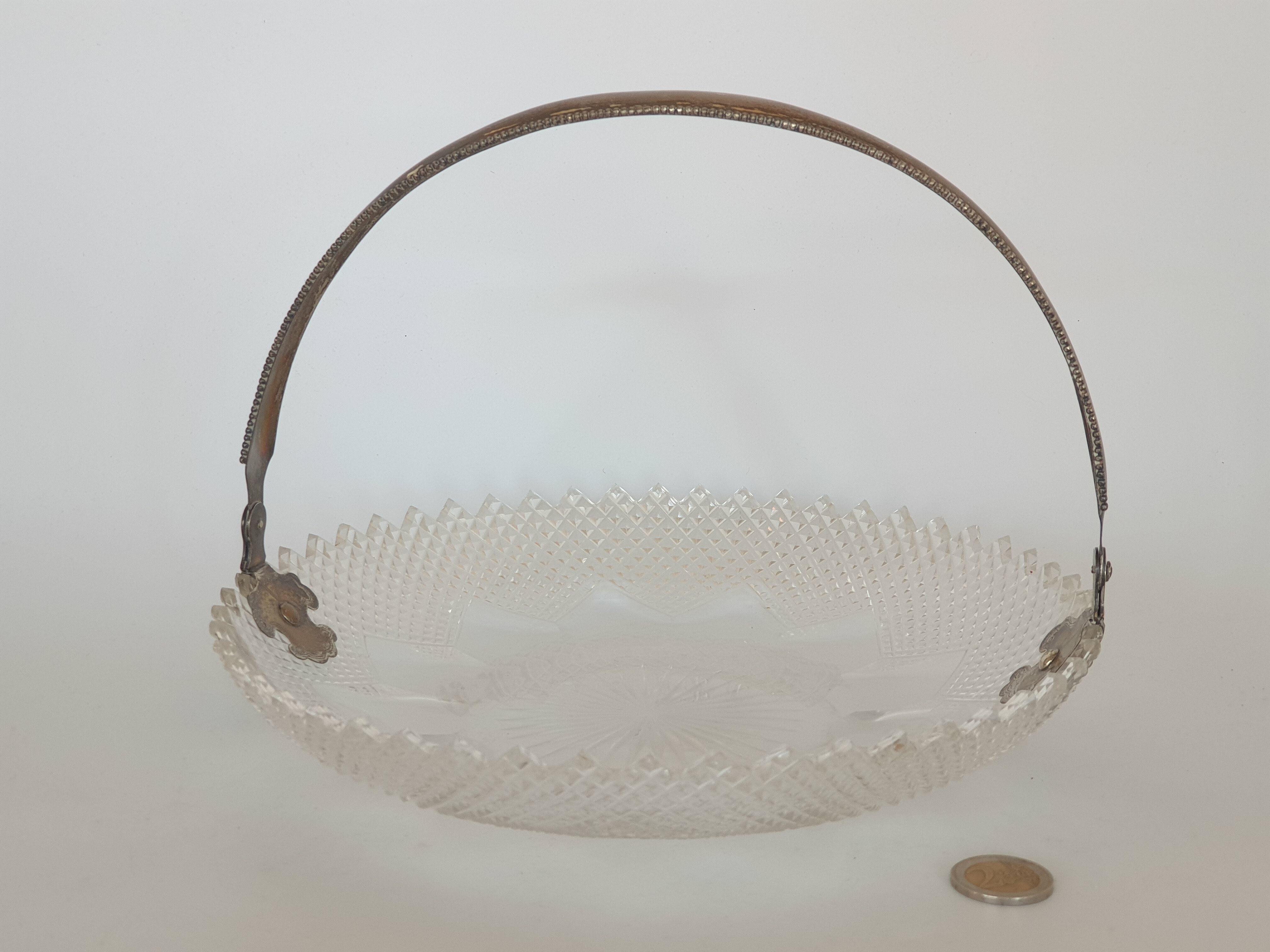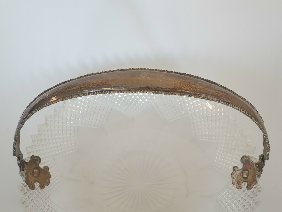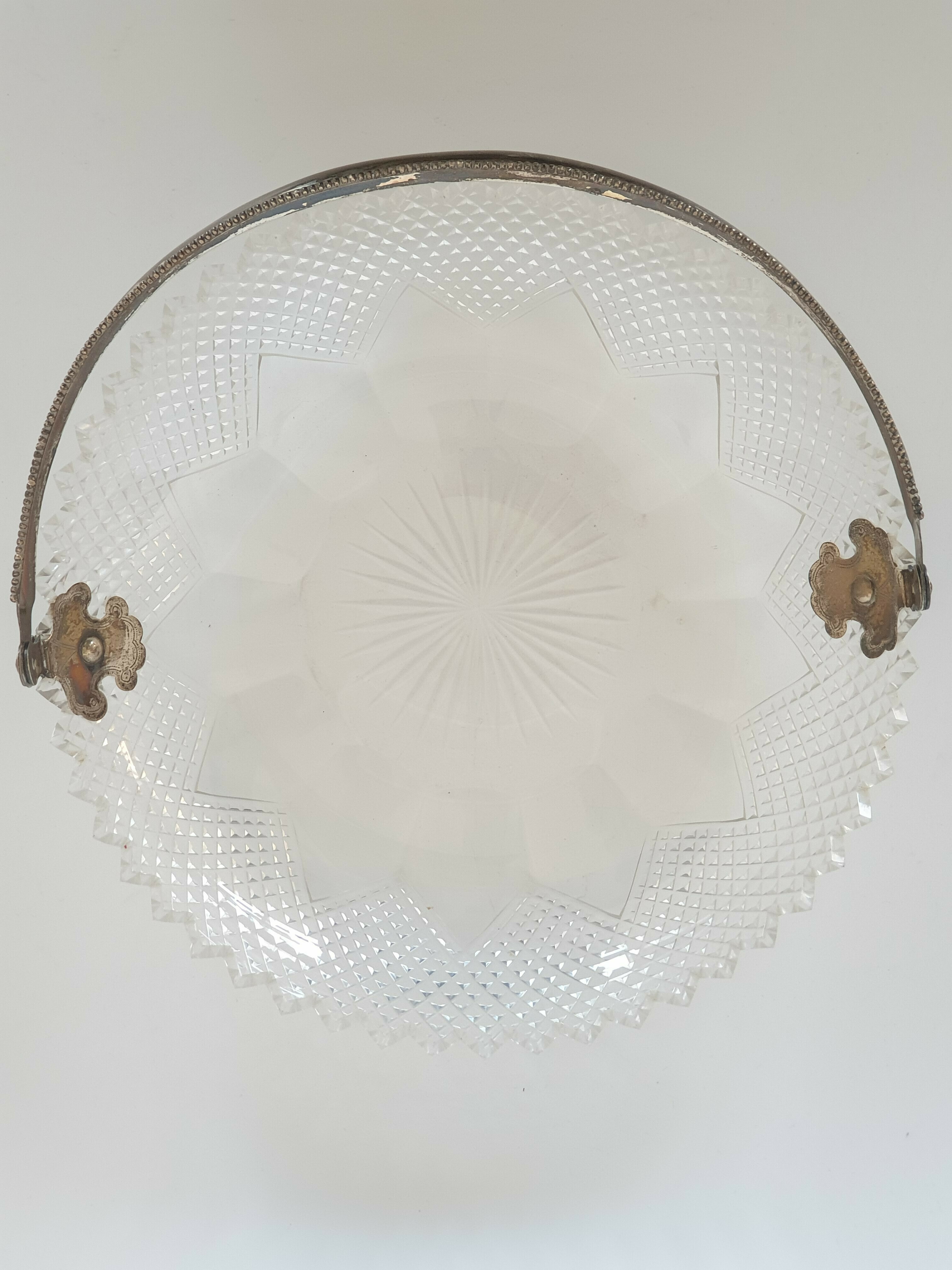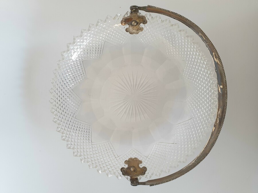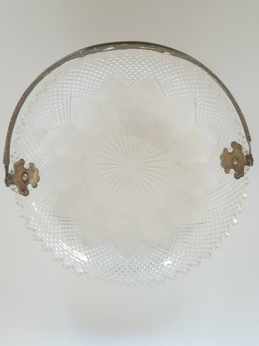 Geslepen kristallen schaal met zilveren hengsel, gemerkt met staande leeuw en een onduidelijke jaarletter. |