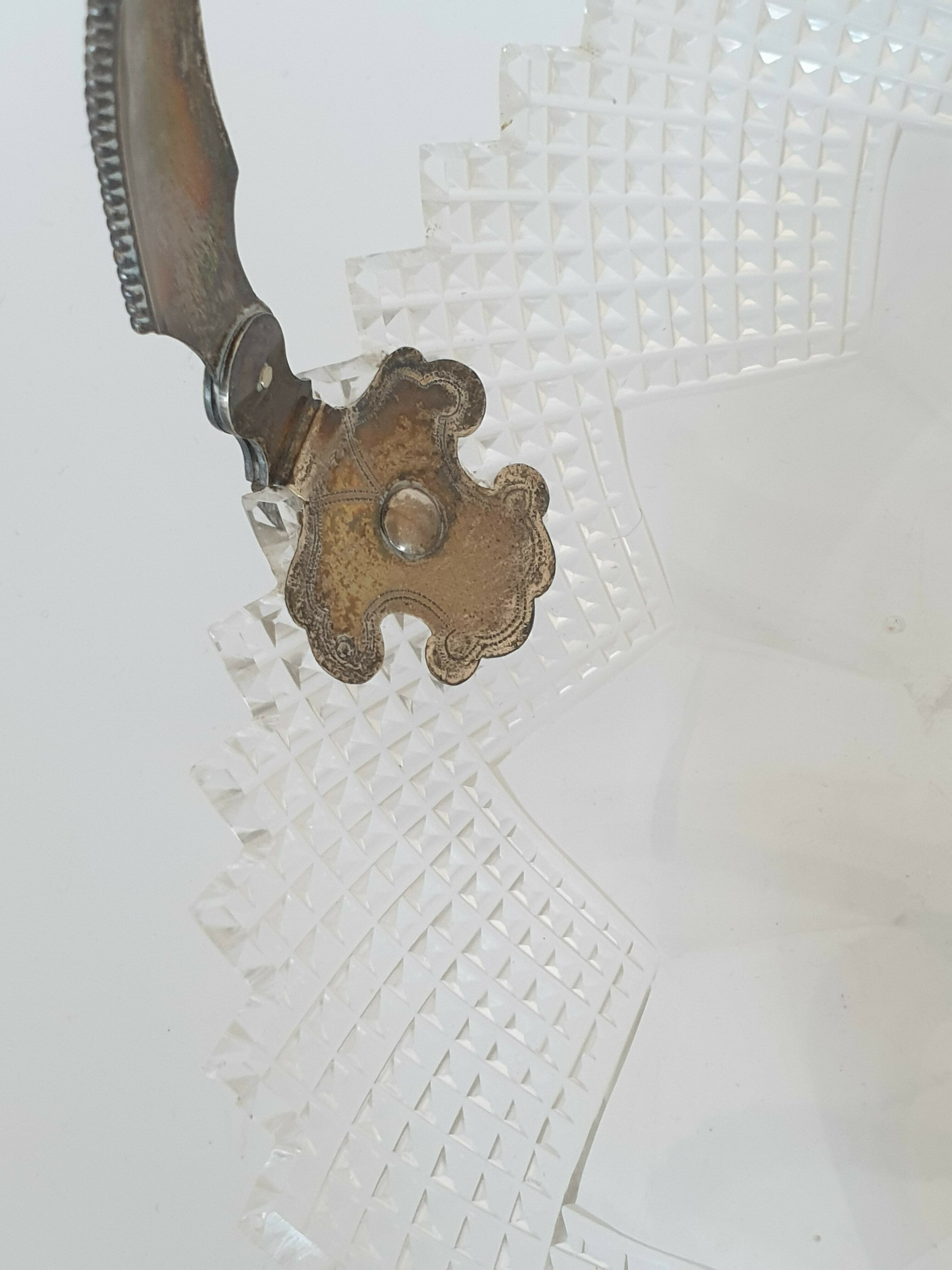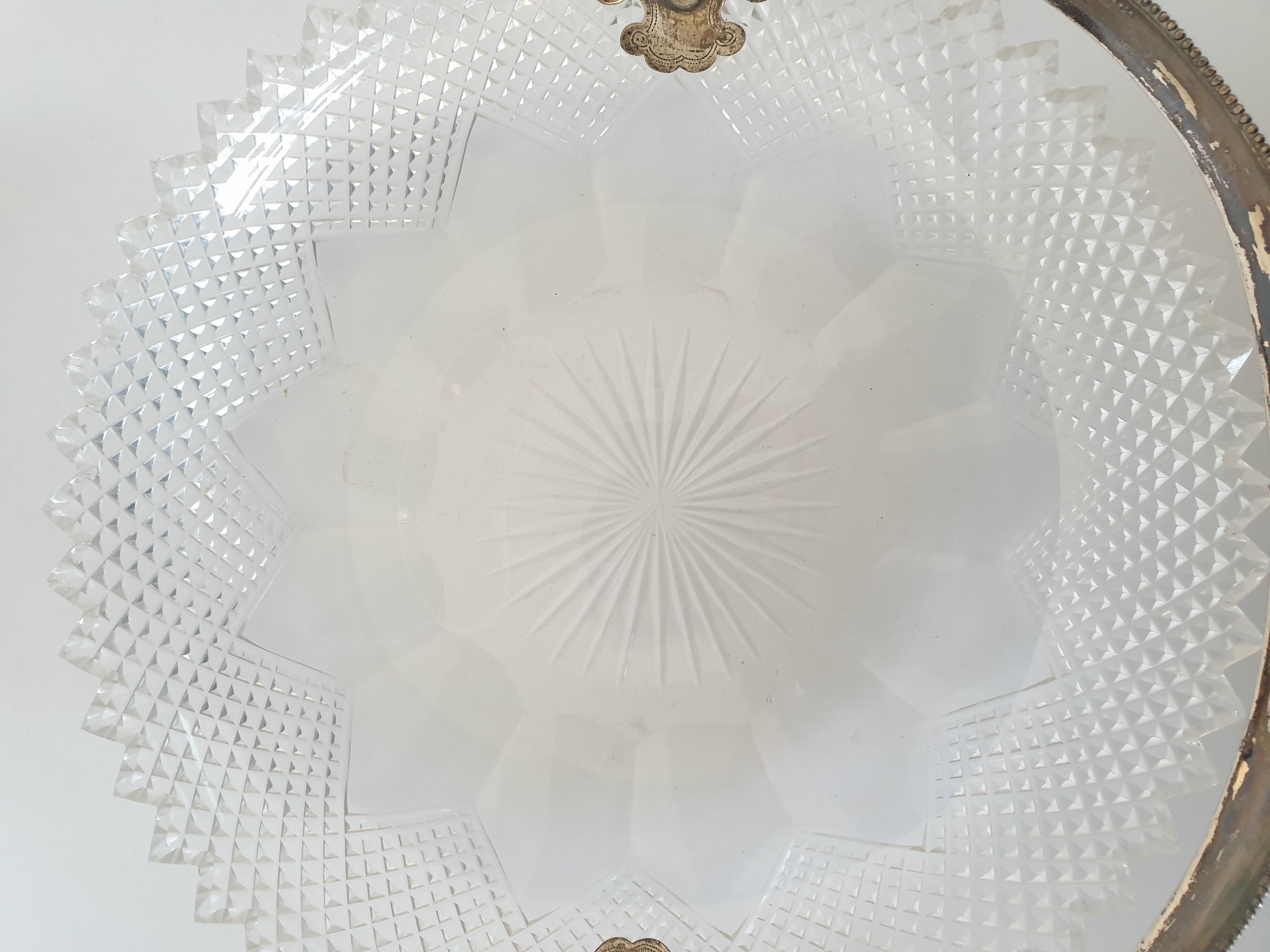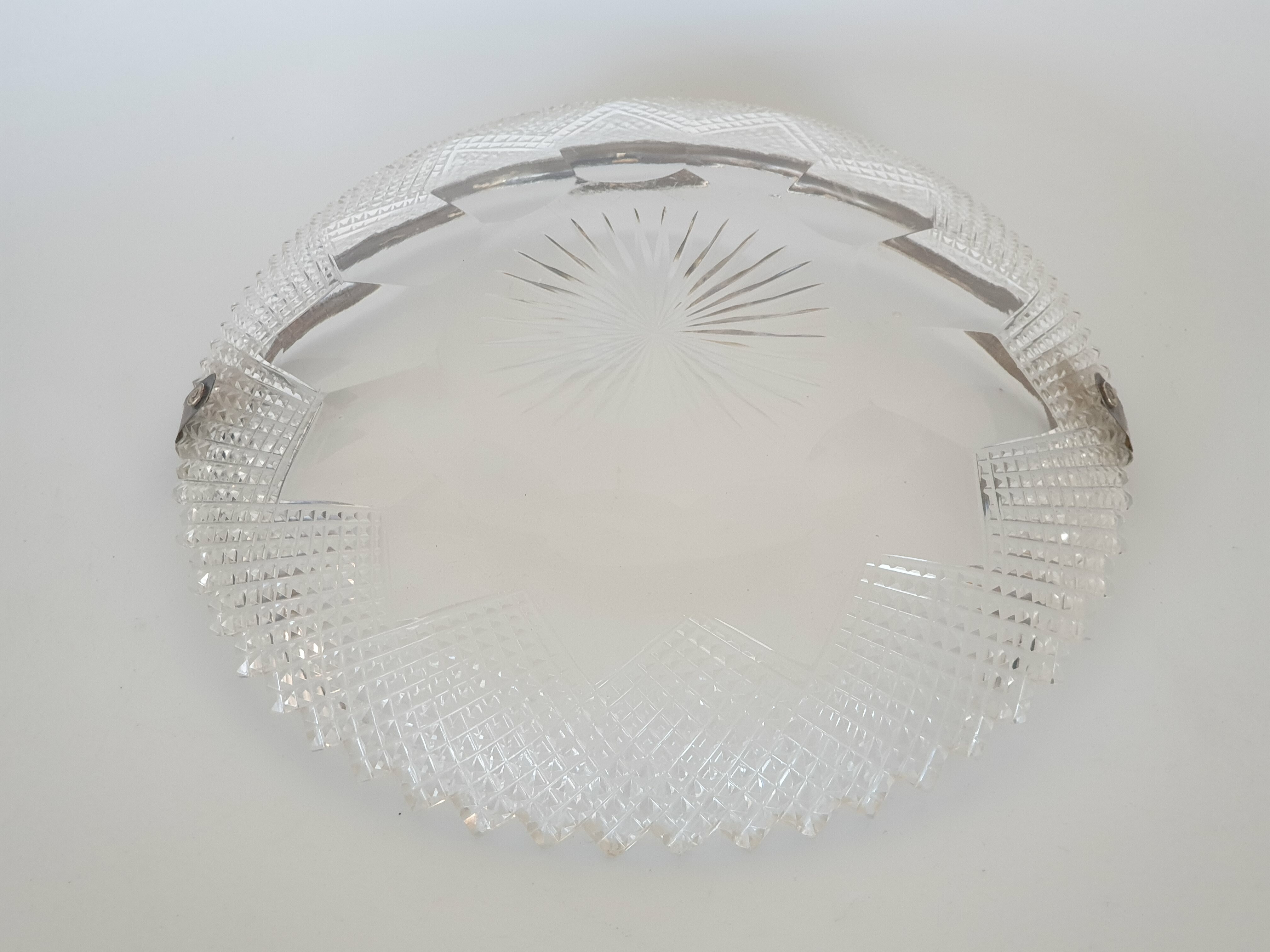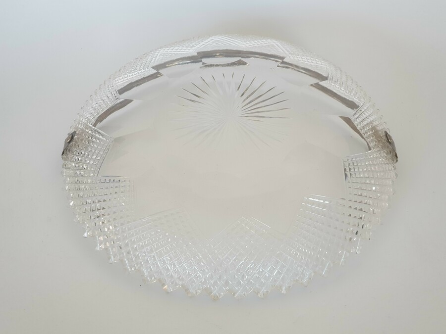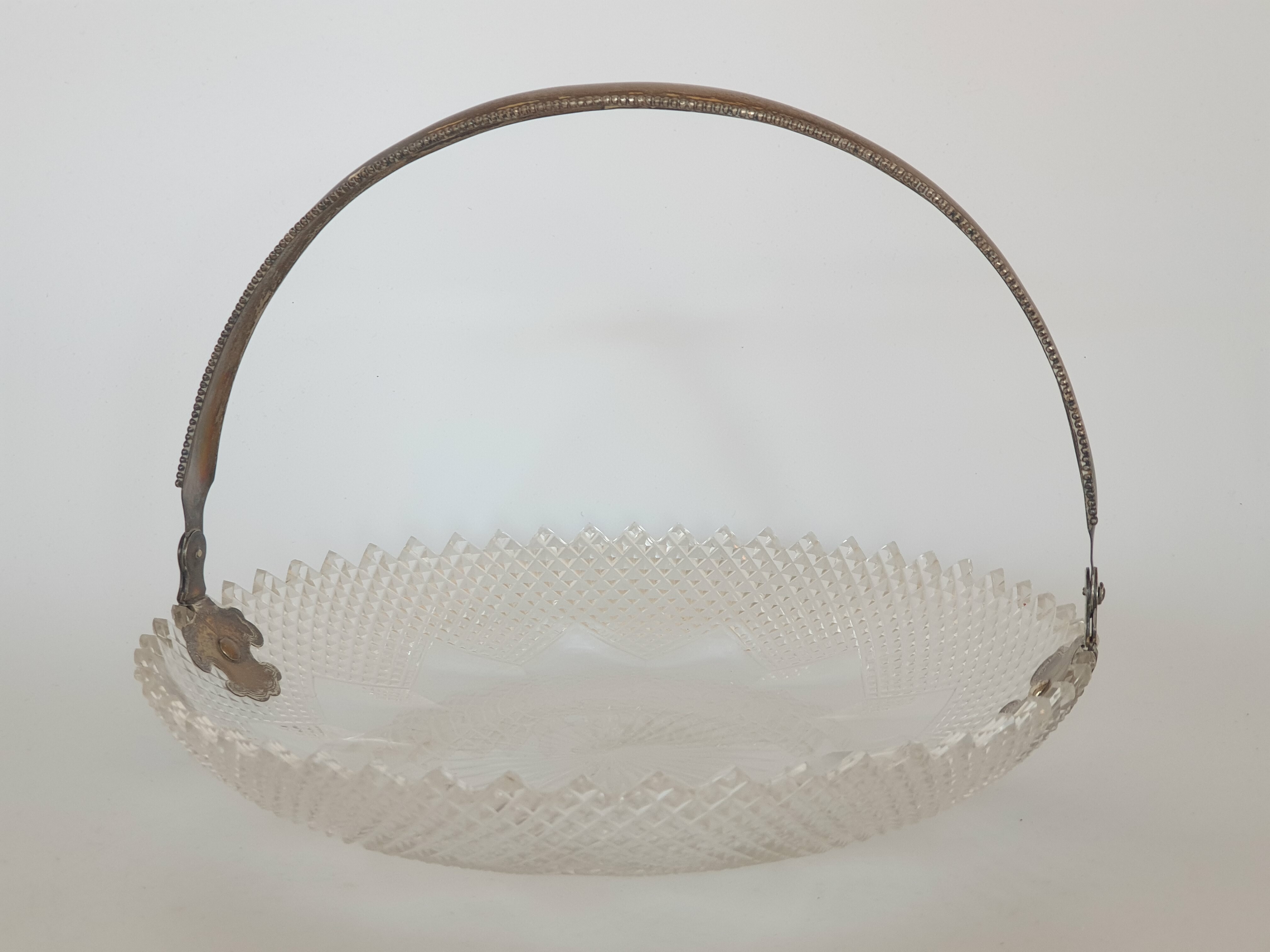 Geslepen kristallen schaal met zilveren hengsel, gemerkt met staande leeuw en een onduidelijke jaarletter. |