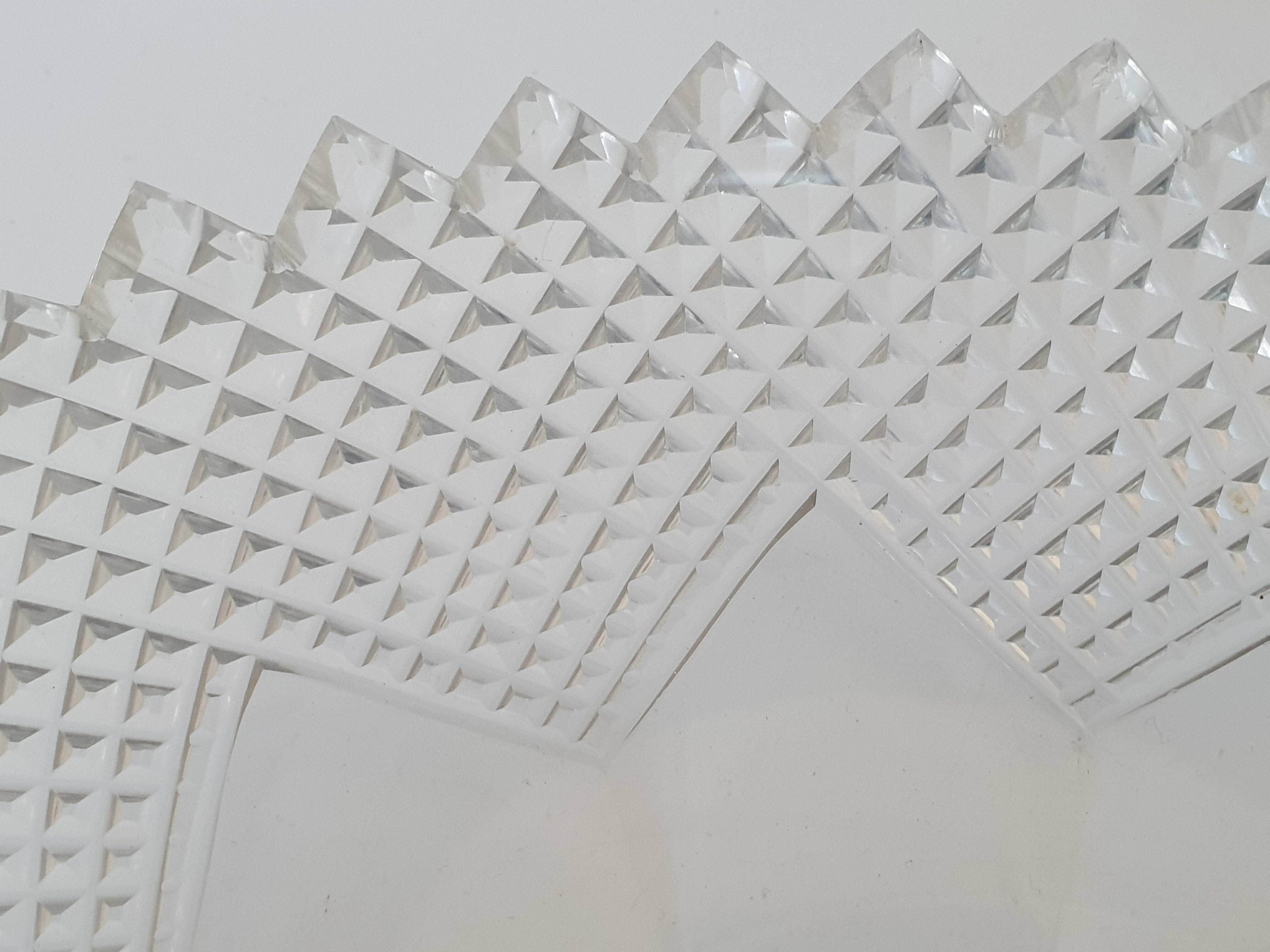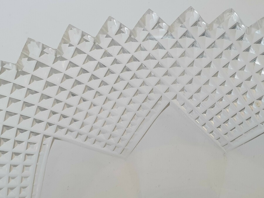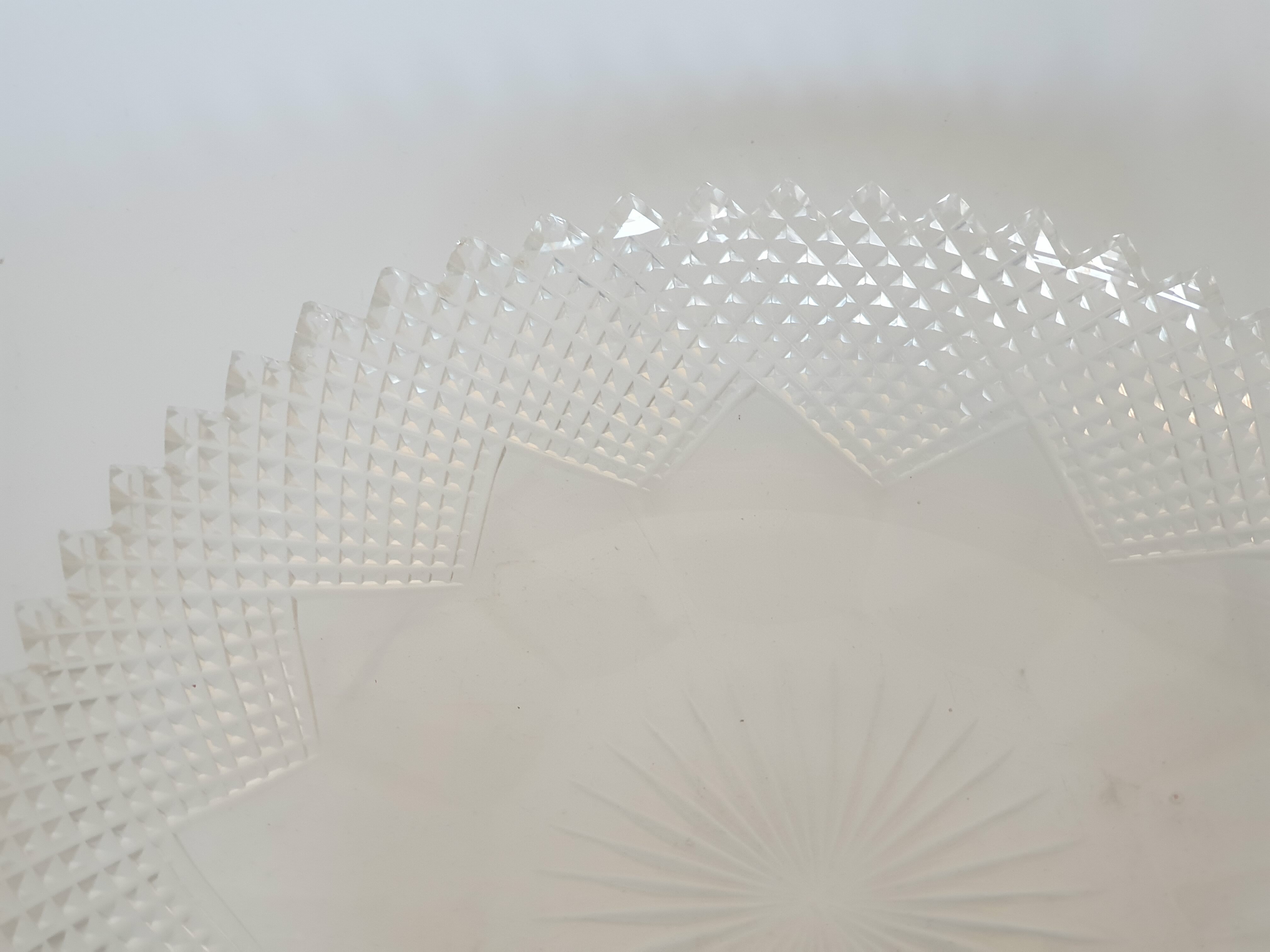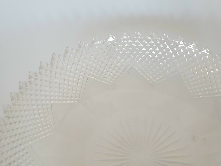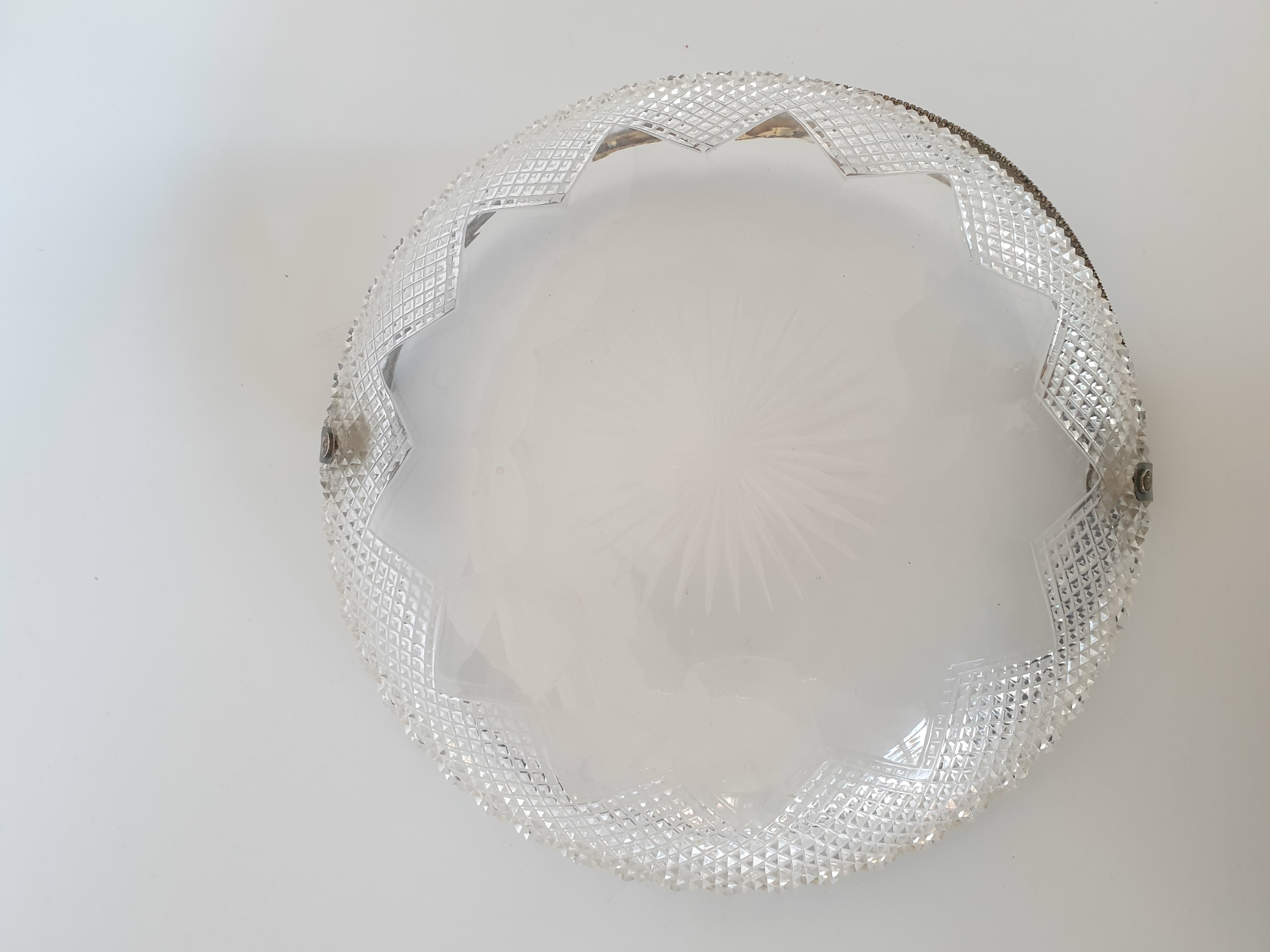 Geslepen kristallen schaal met zilveren hengsel, gemerkt met staande leeuw en een onduidelijke jaarletter. |