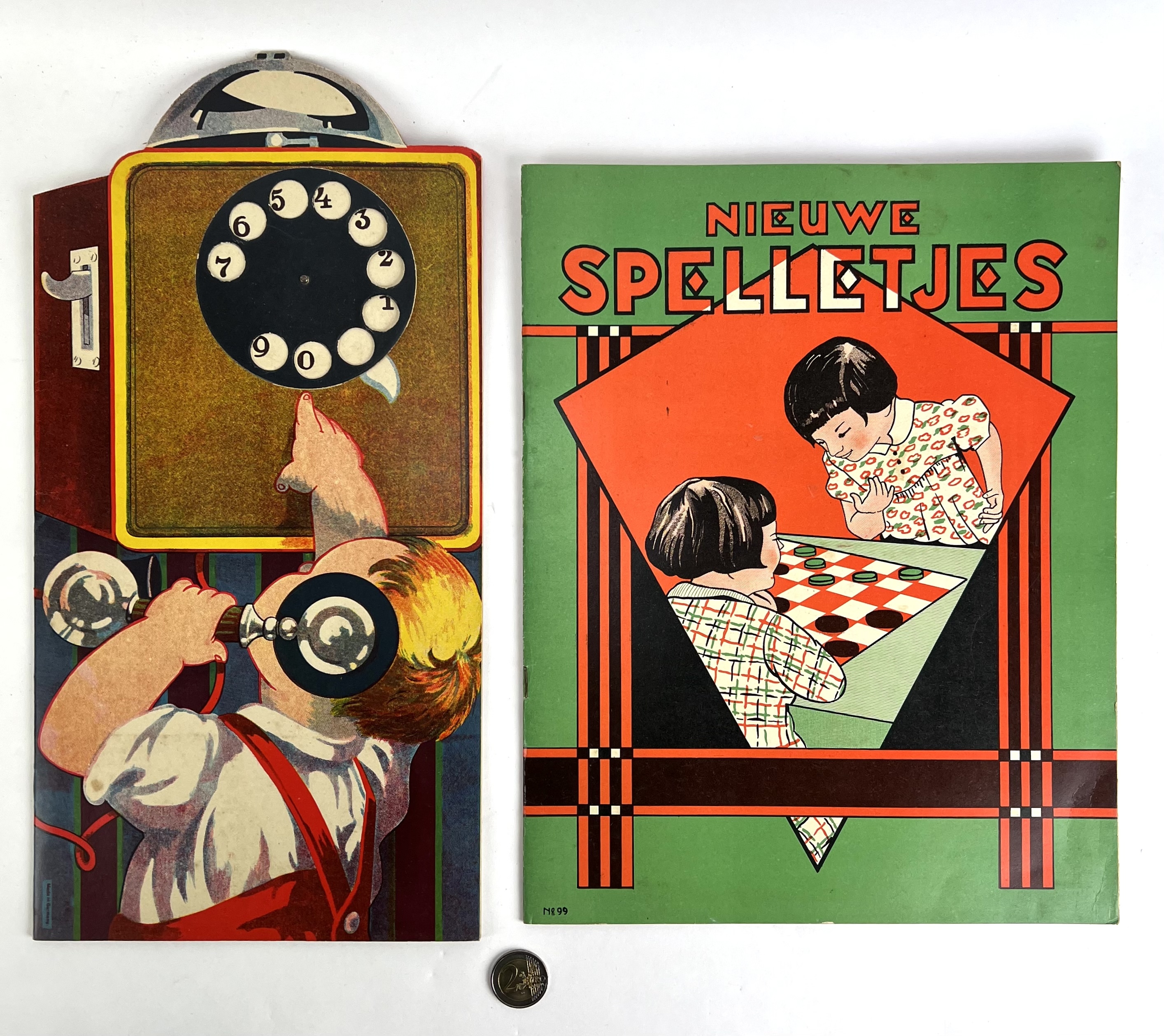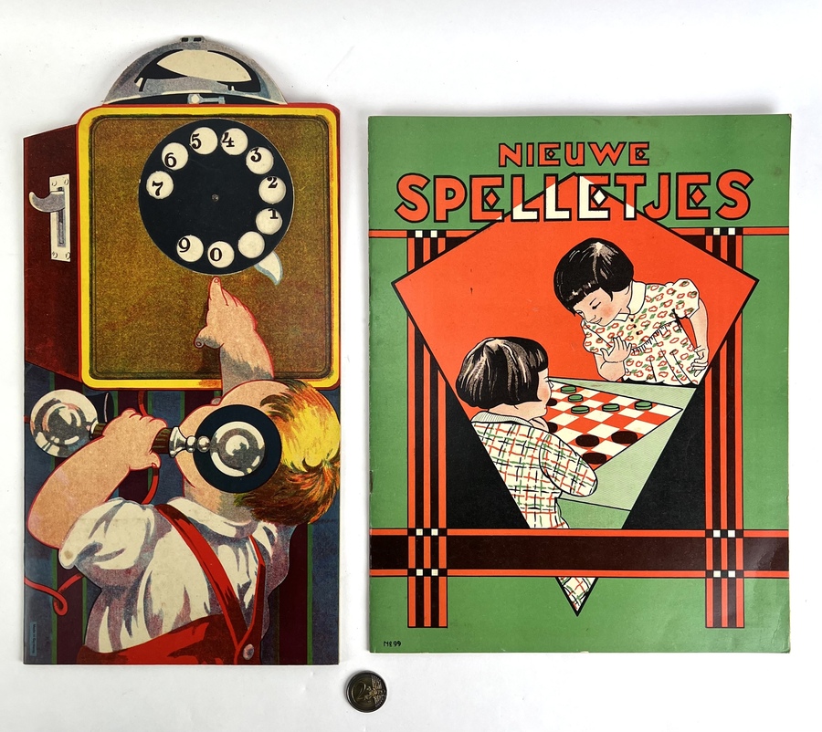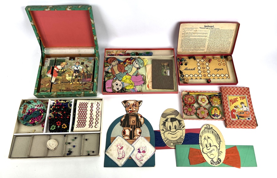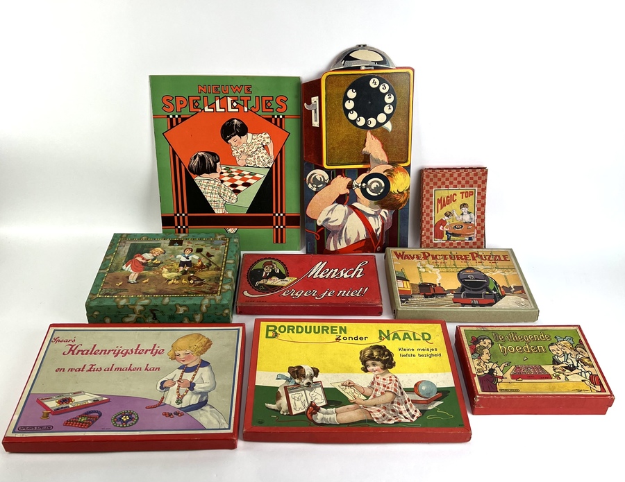 Lot met negen spellen in originele doos, waaronder Mensch erger je niet, De vliegende hoeden en een treinen puzzel. Jaren 50/60. |