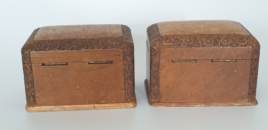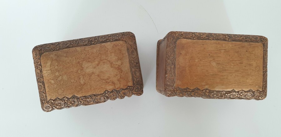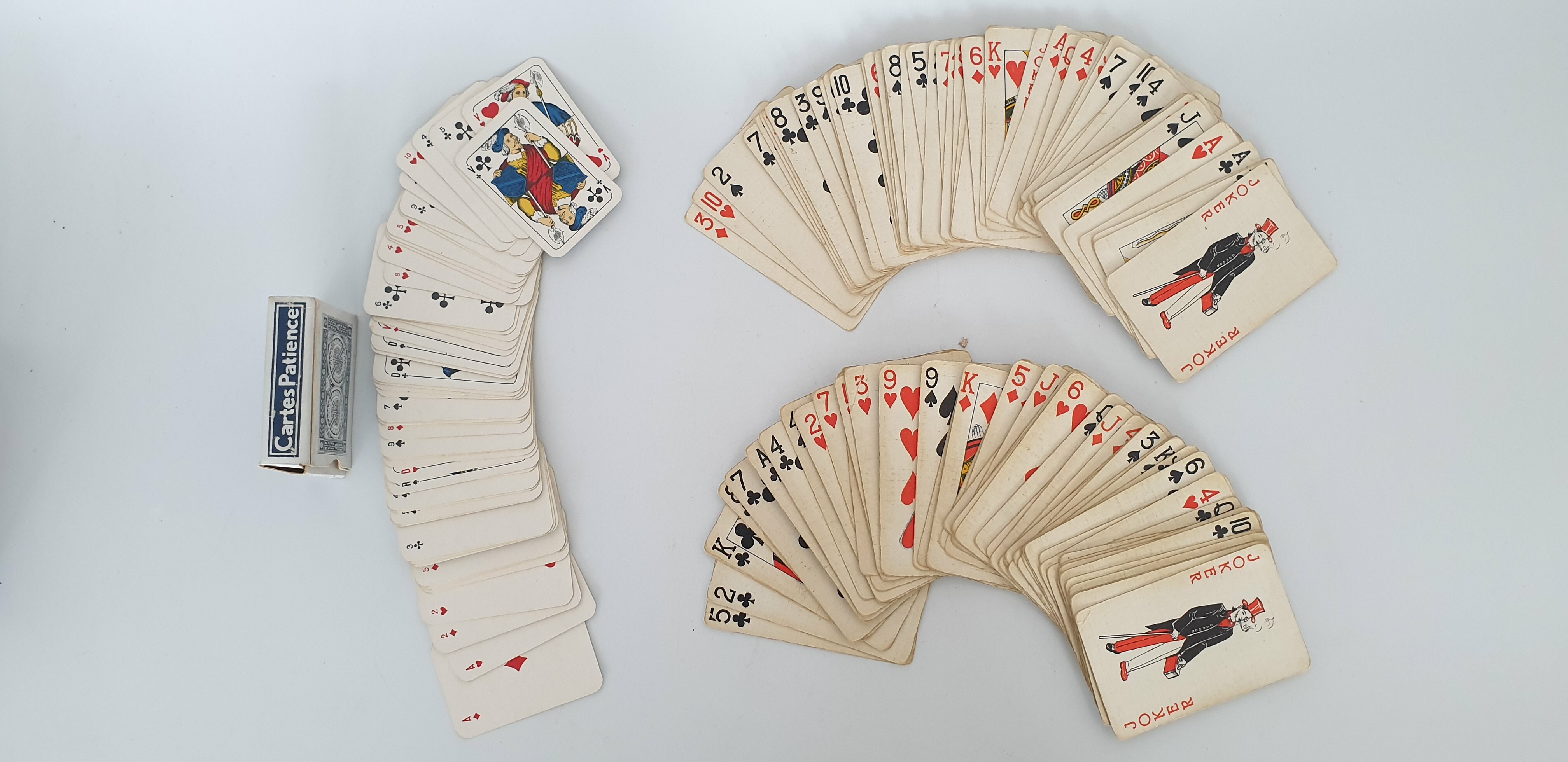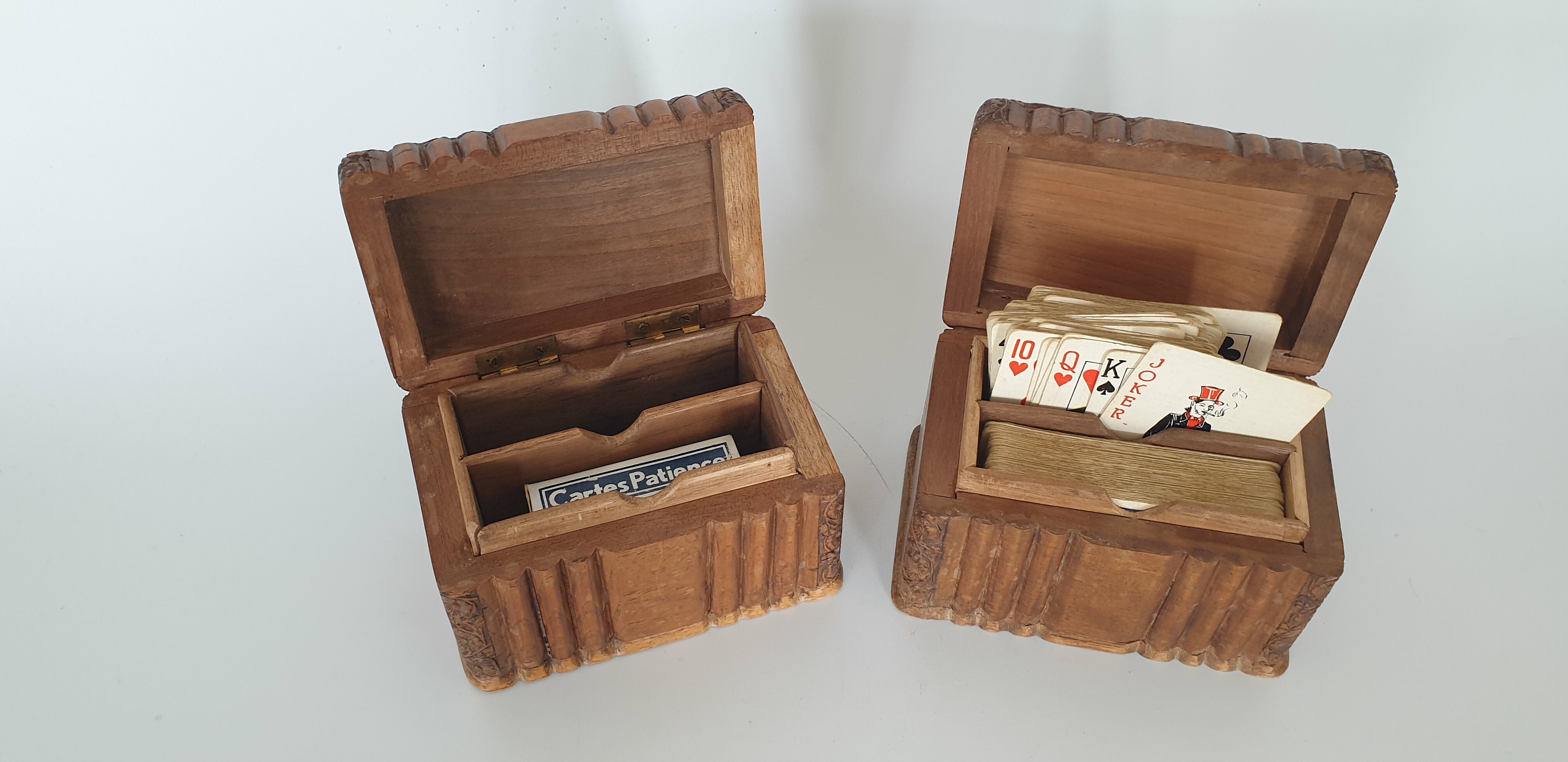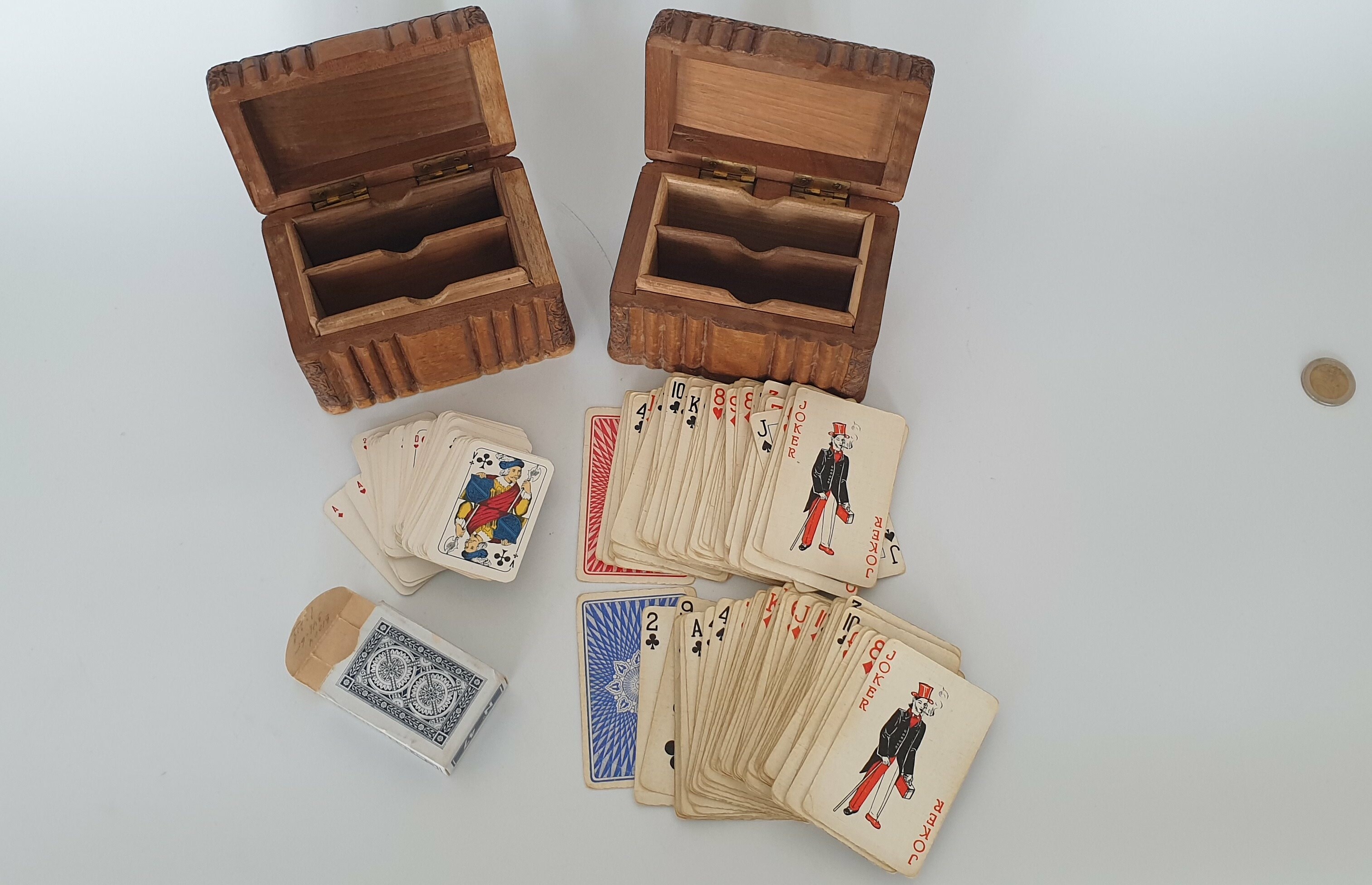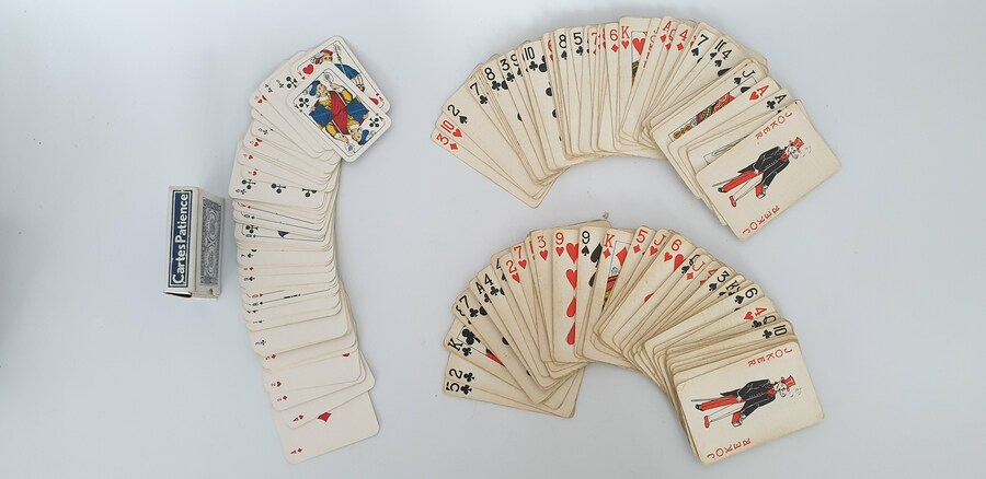 Houten kisten met speelkaarten, circa 1920. Complete sets kaarten van latere datum. |