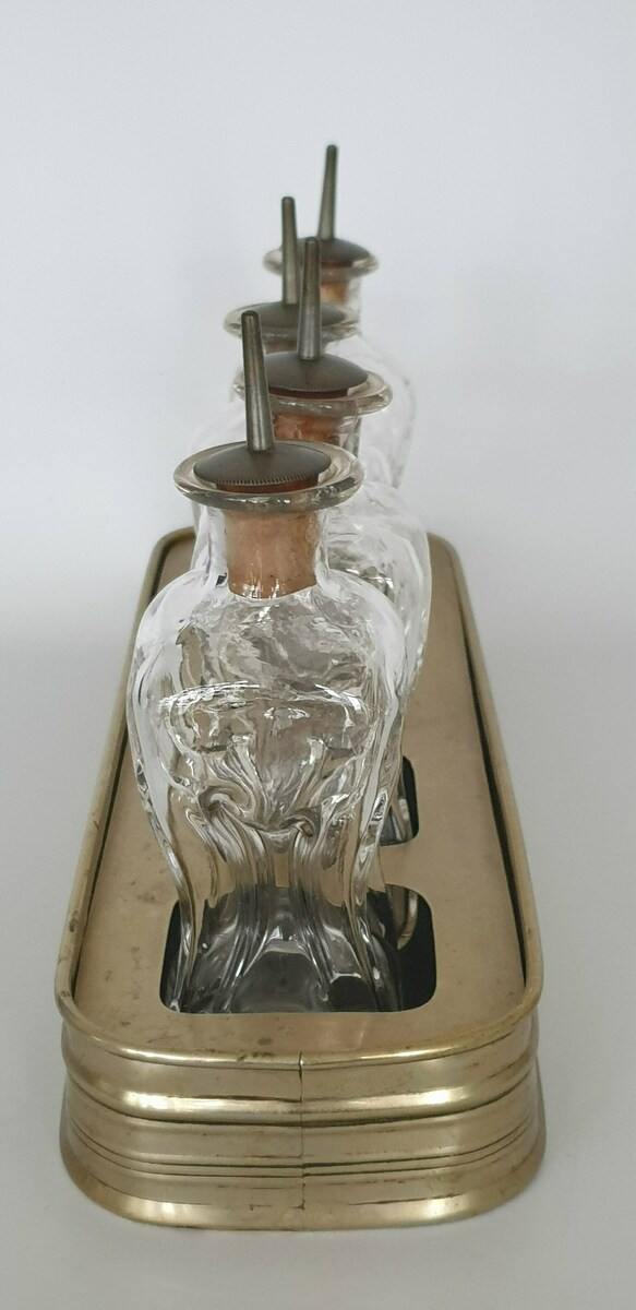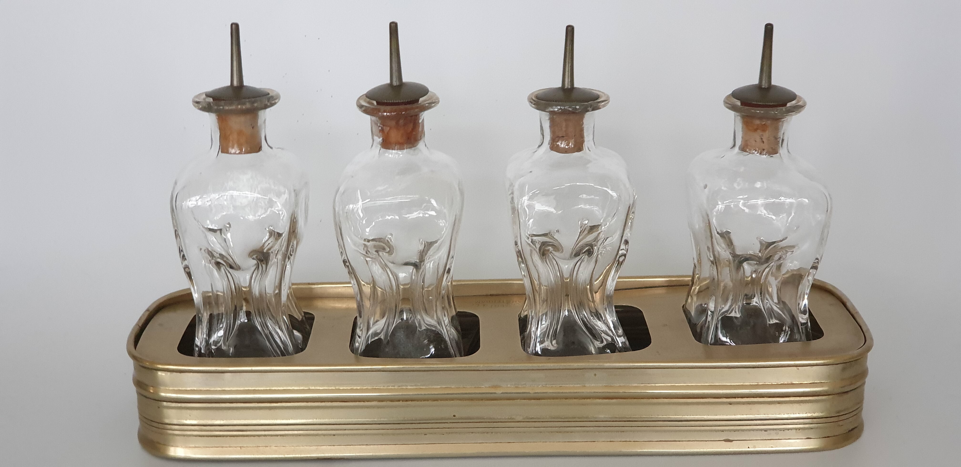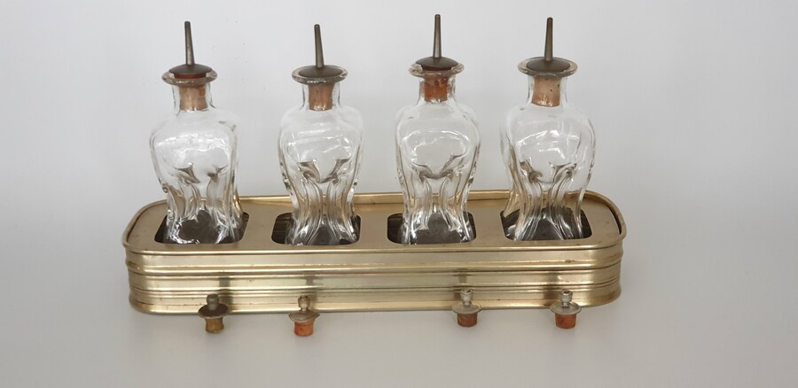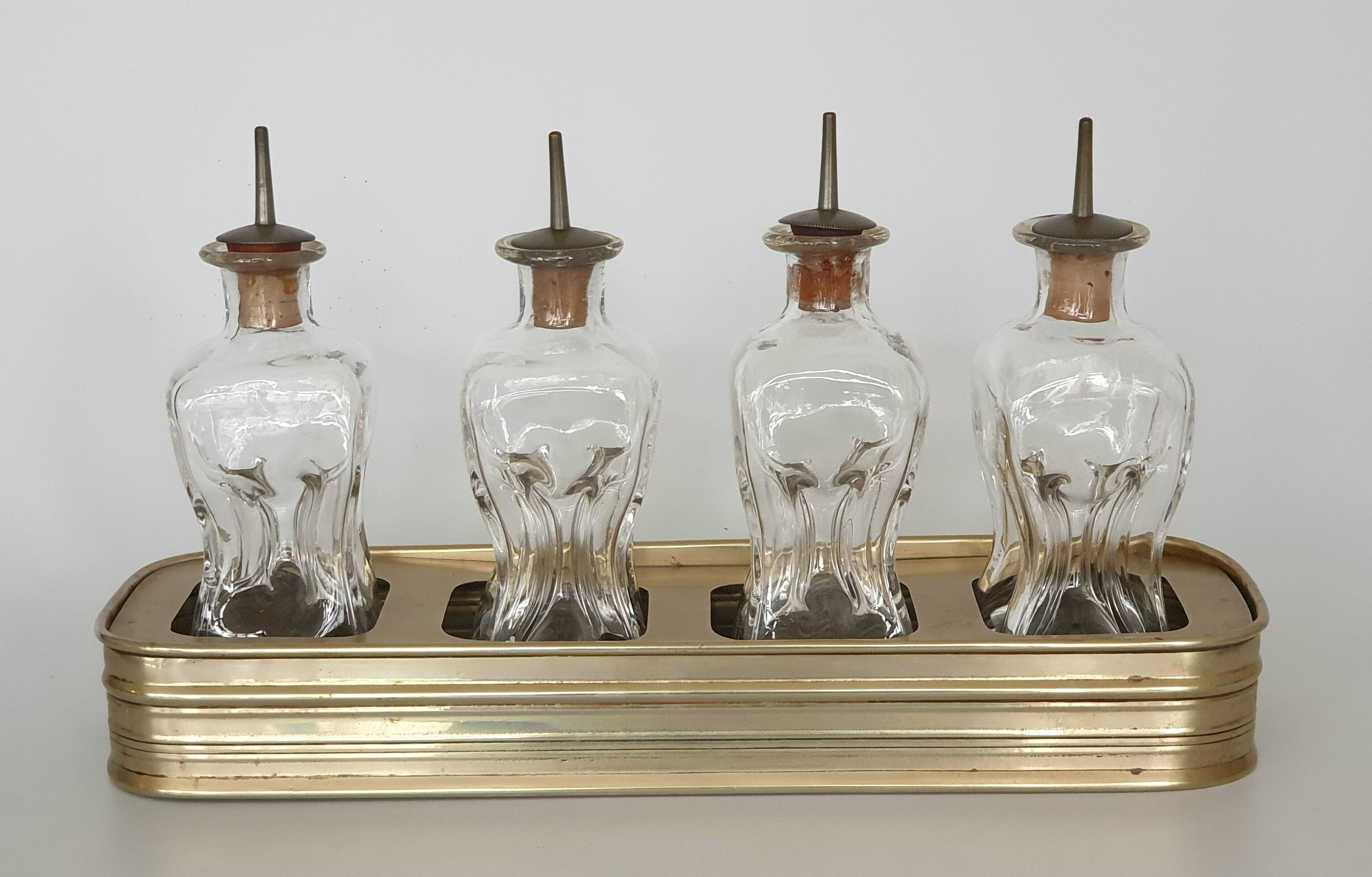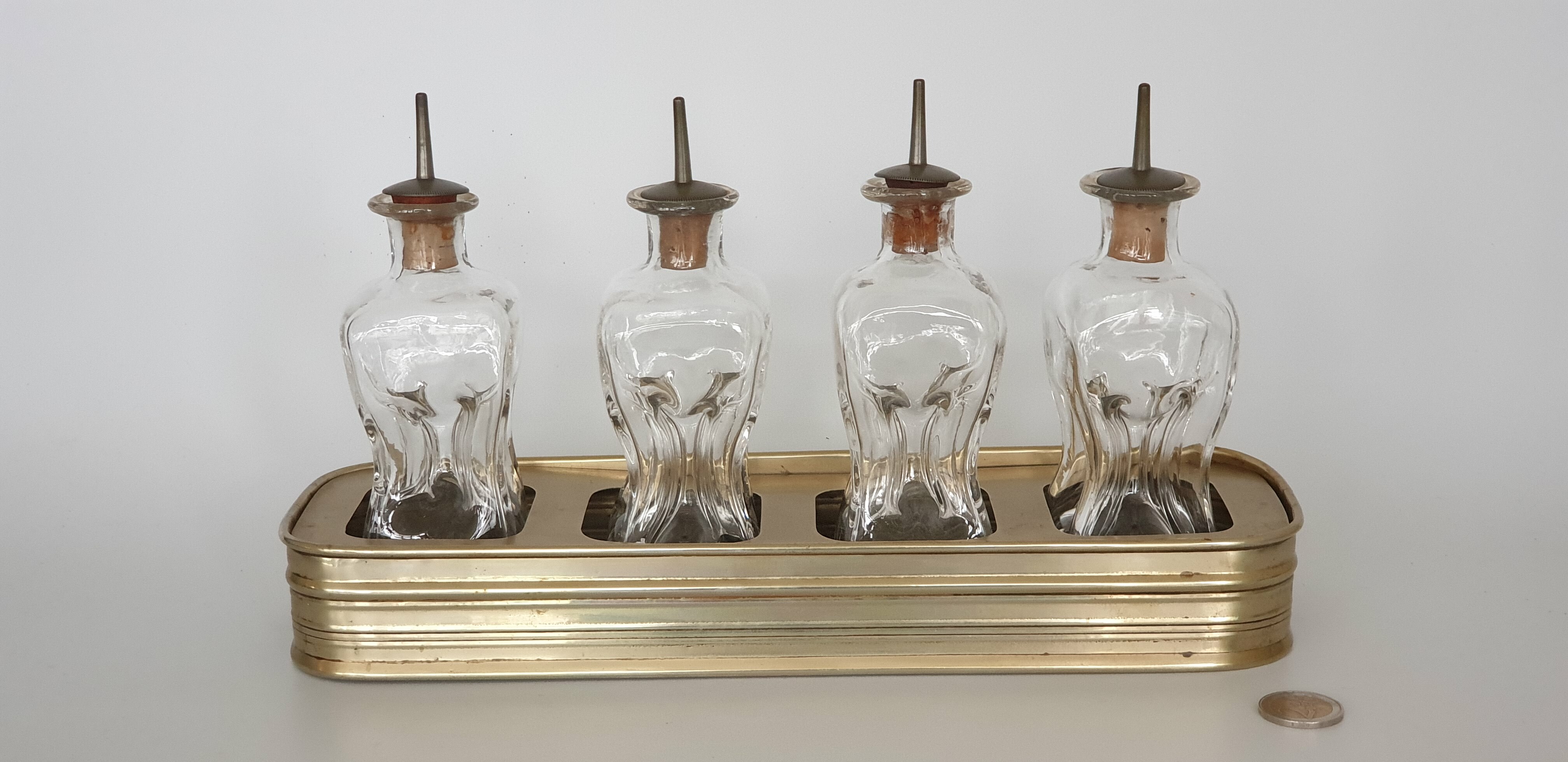 Knijpflesjes met schenktuiten, compleet in houder, Flament & co. Amsterdam, circa 1920 |